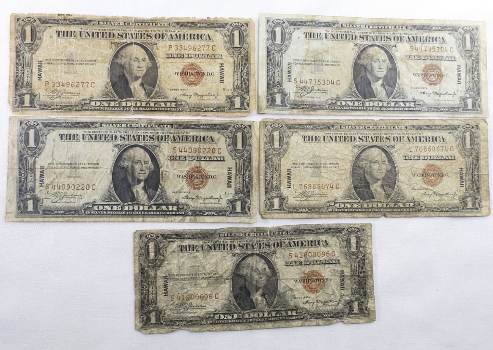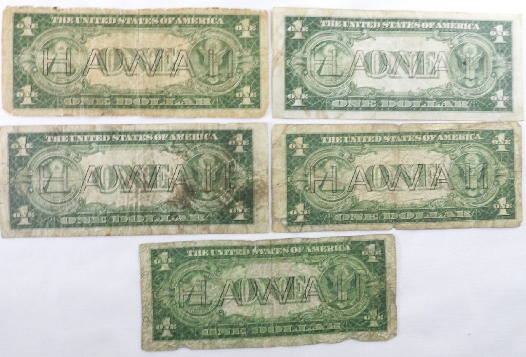 Five low grade $1 bills. All Series 1935 A. Silver Certificates.