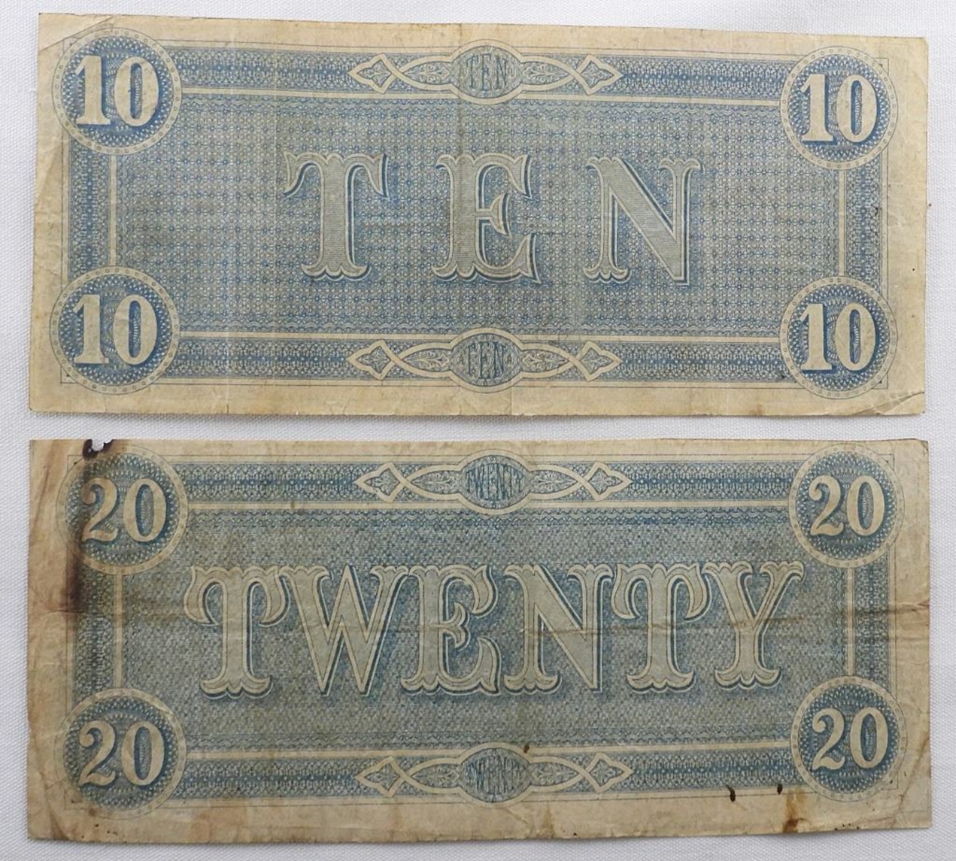 Two Confederate States of America Large Bills $10 (No 75333) and $20 (No 70537). The Twenty has burn marks.