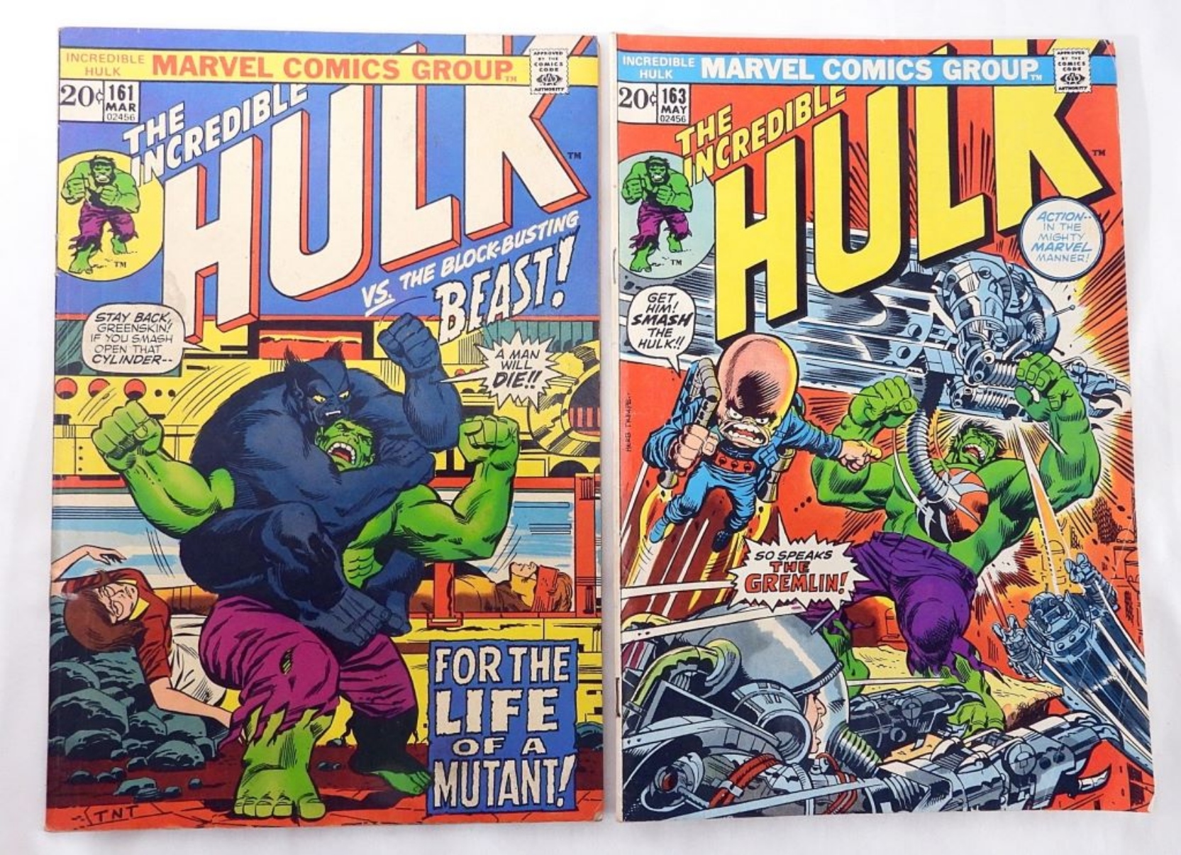 Two Marvel The Incredible Hulk Comics. March #161 Hulk vs. The Block Busting Beast. May #163 1973 The Incredible Hulk & First appearance of the Gremlin. Both XF.