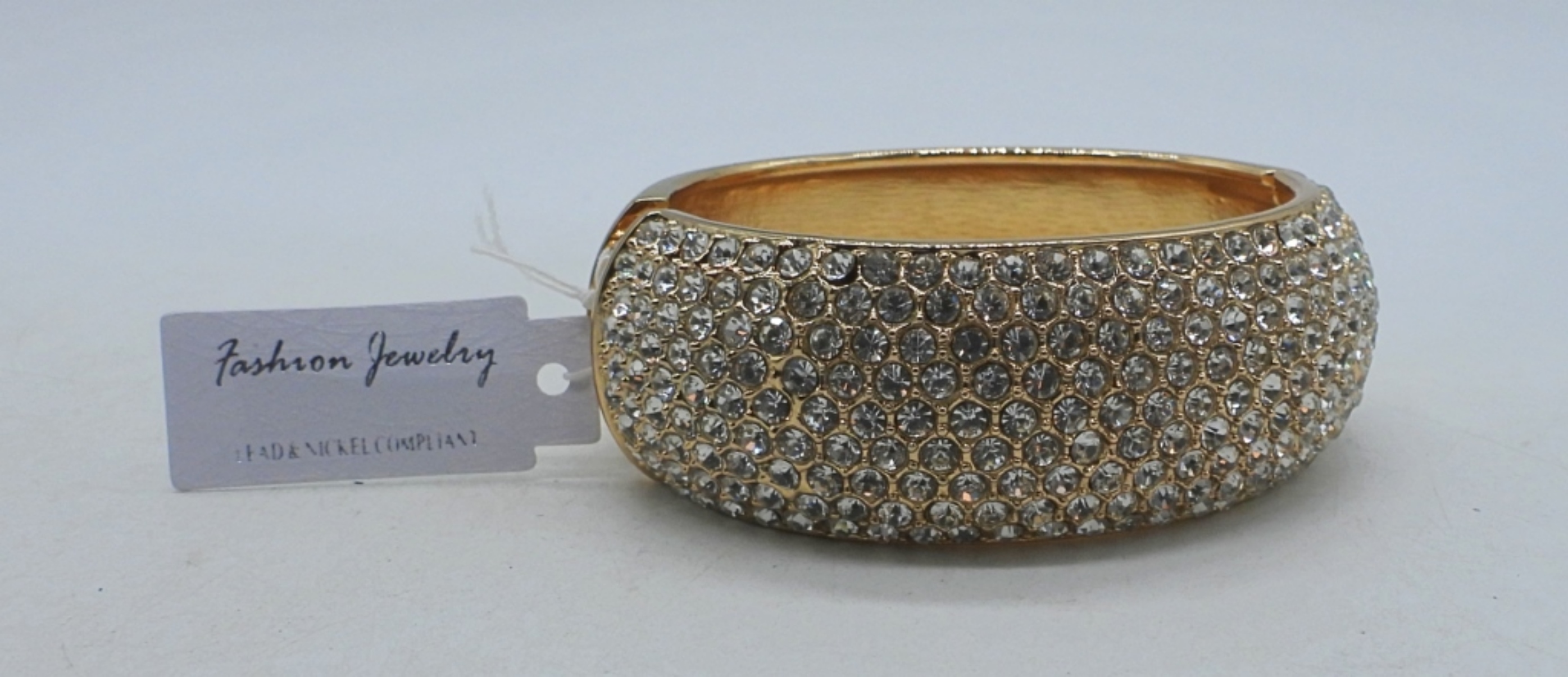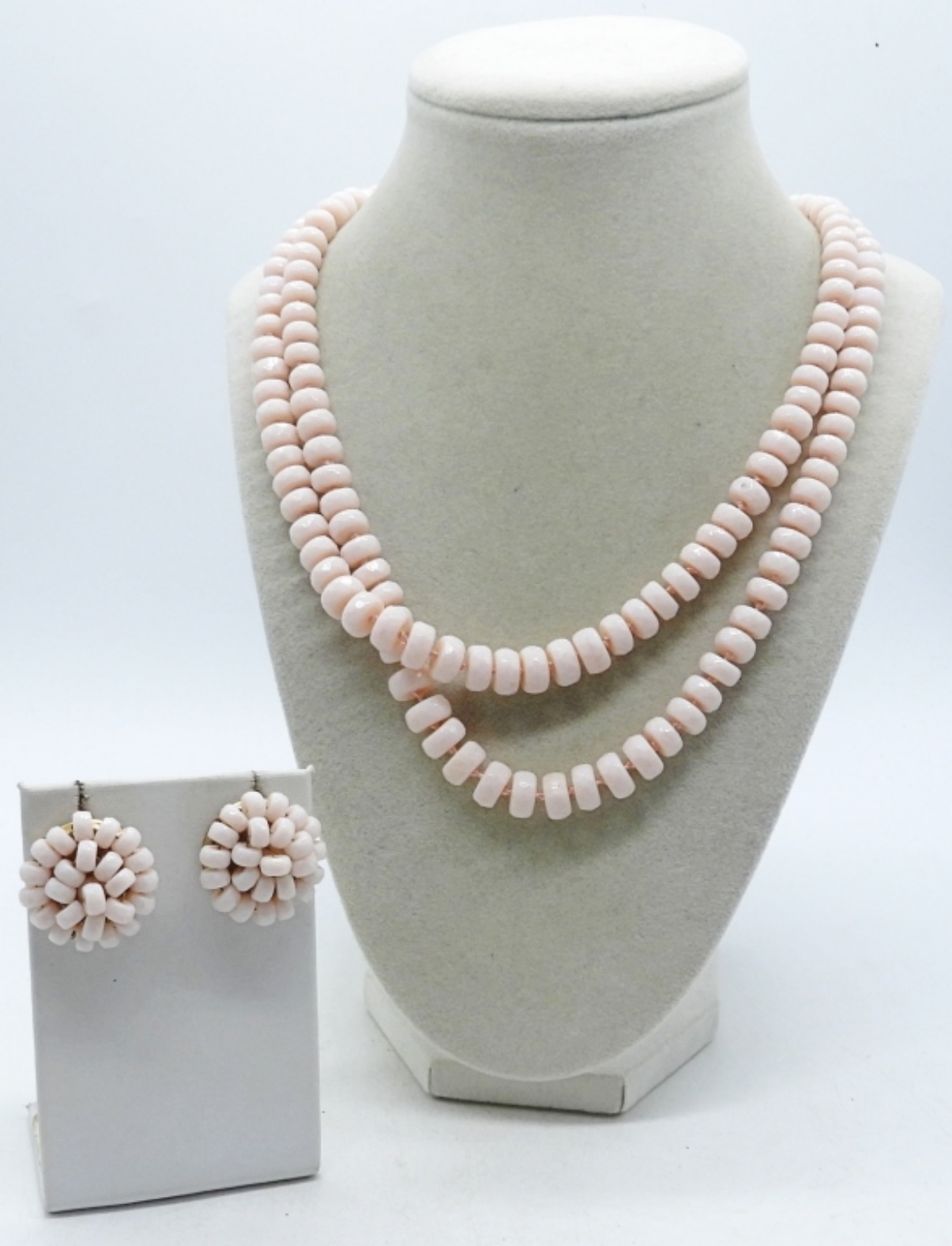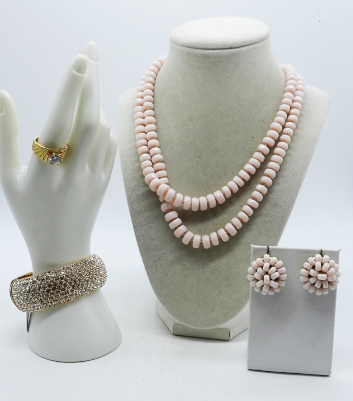 A pair of pink clip-on earrings with a matching necklace 24in long, plus a gold-tone ring size 10, and 1 cuff bracelet