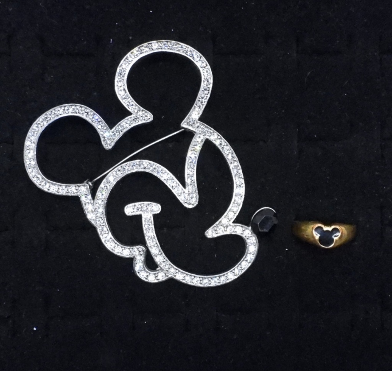 Mickey Mouse large rhinestone brooch, along with a gold-tone Mickey Mouse Ring size 9. Both from Disney