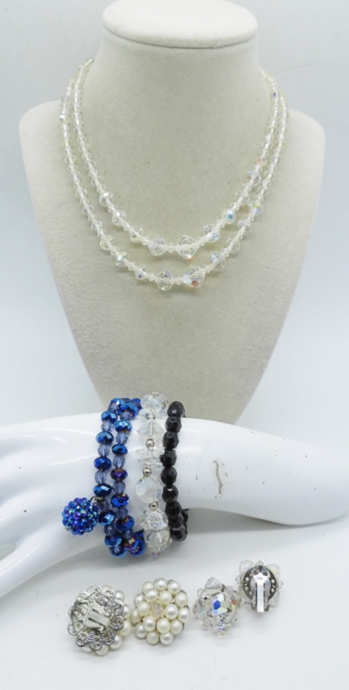 Vintage crystal/glass necklace, 16″. Two pair of Vintage clip of earrings. 4 stretchy bracelets