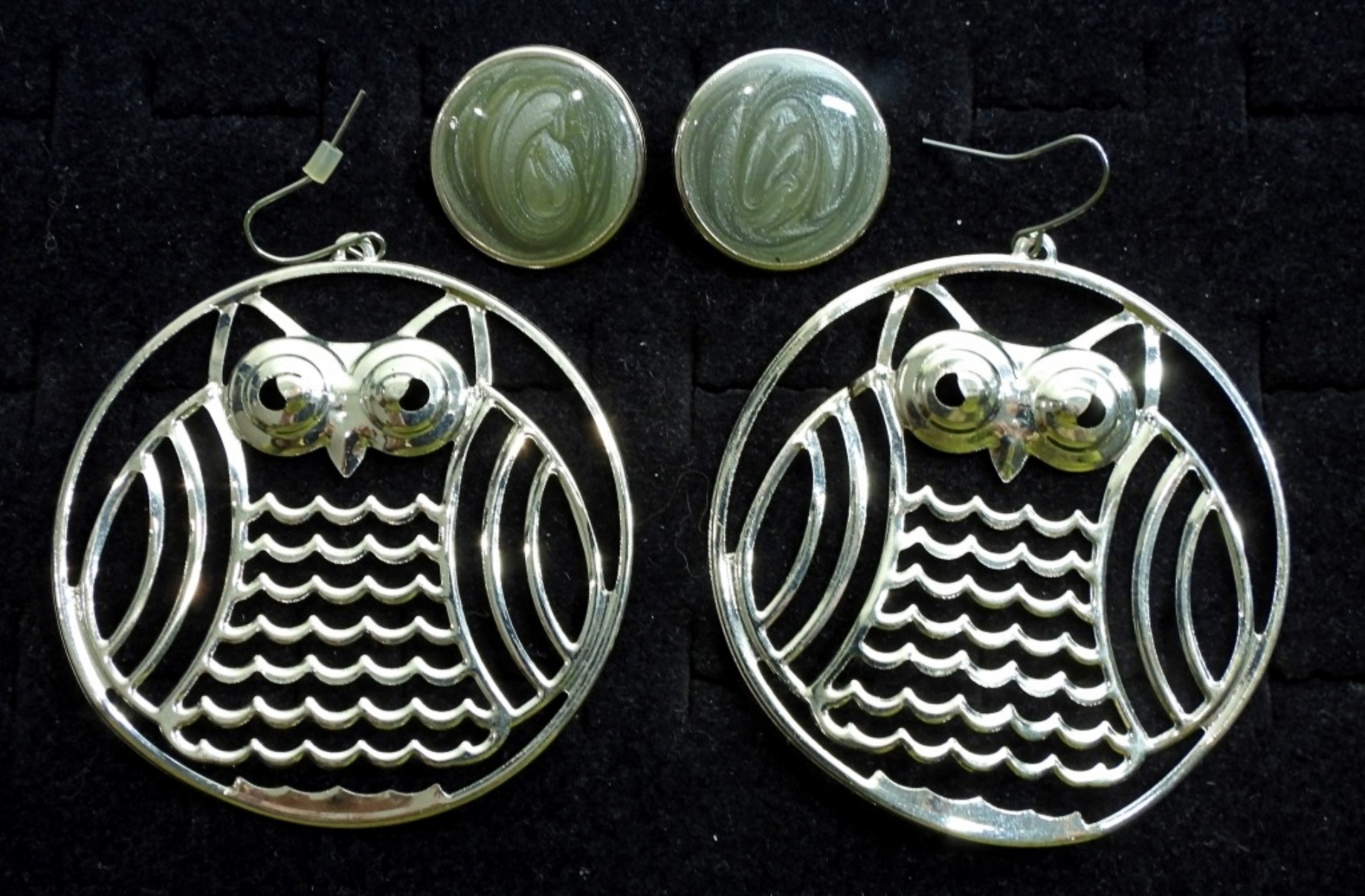 Pretty silver tone owl earrings set. Dangly large earring set.