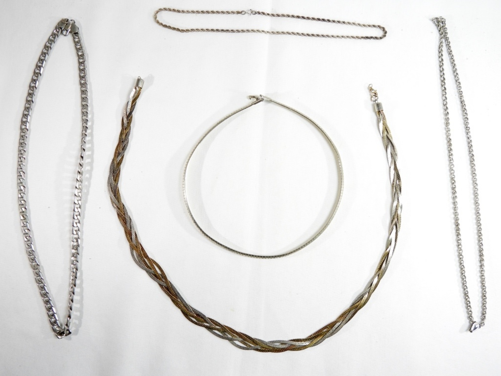 5 Miscellaneous Silver Necklaces, All Unique, Some With Gold