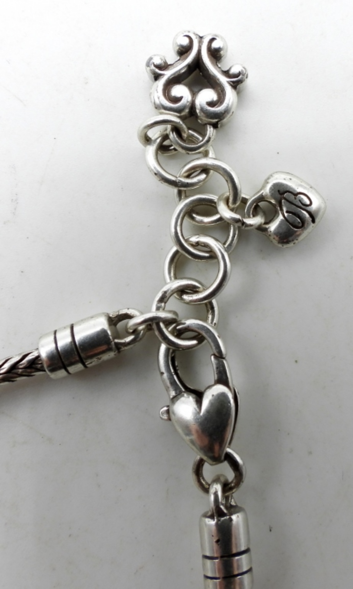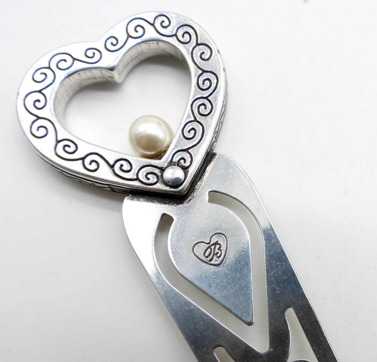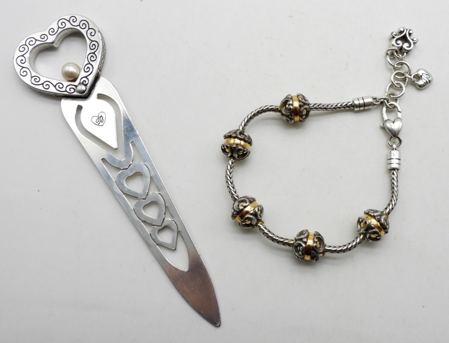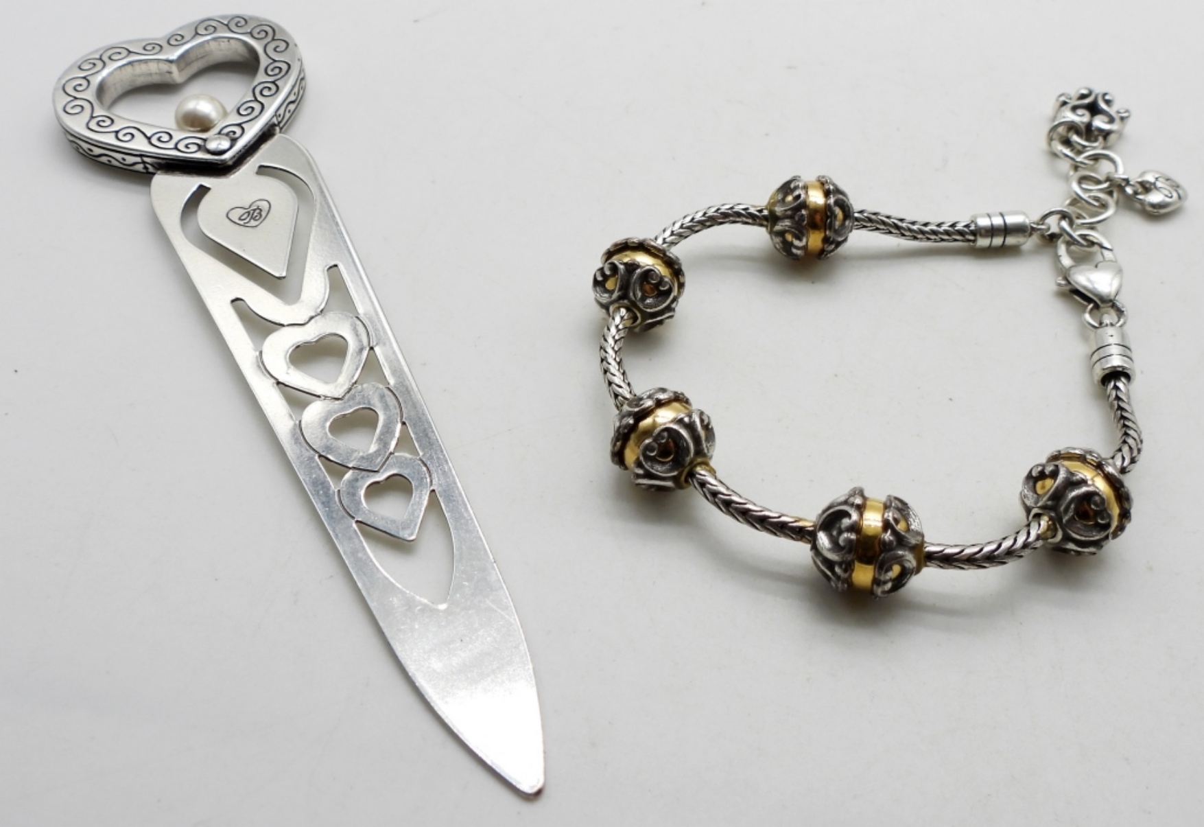 The bracelet is adorned with the beautiful signature B. The letter opener has a heart with a scroll design and a small pearl in the middle