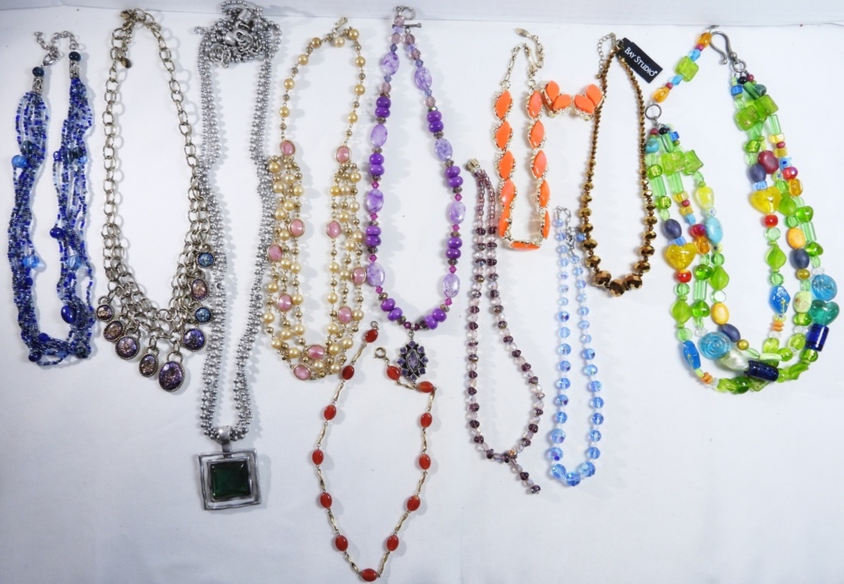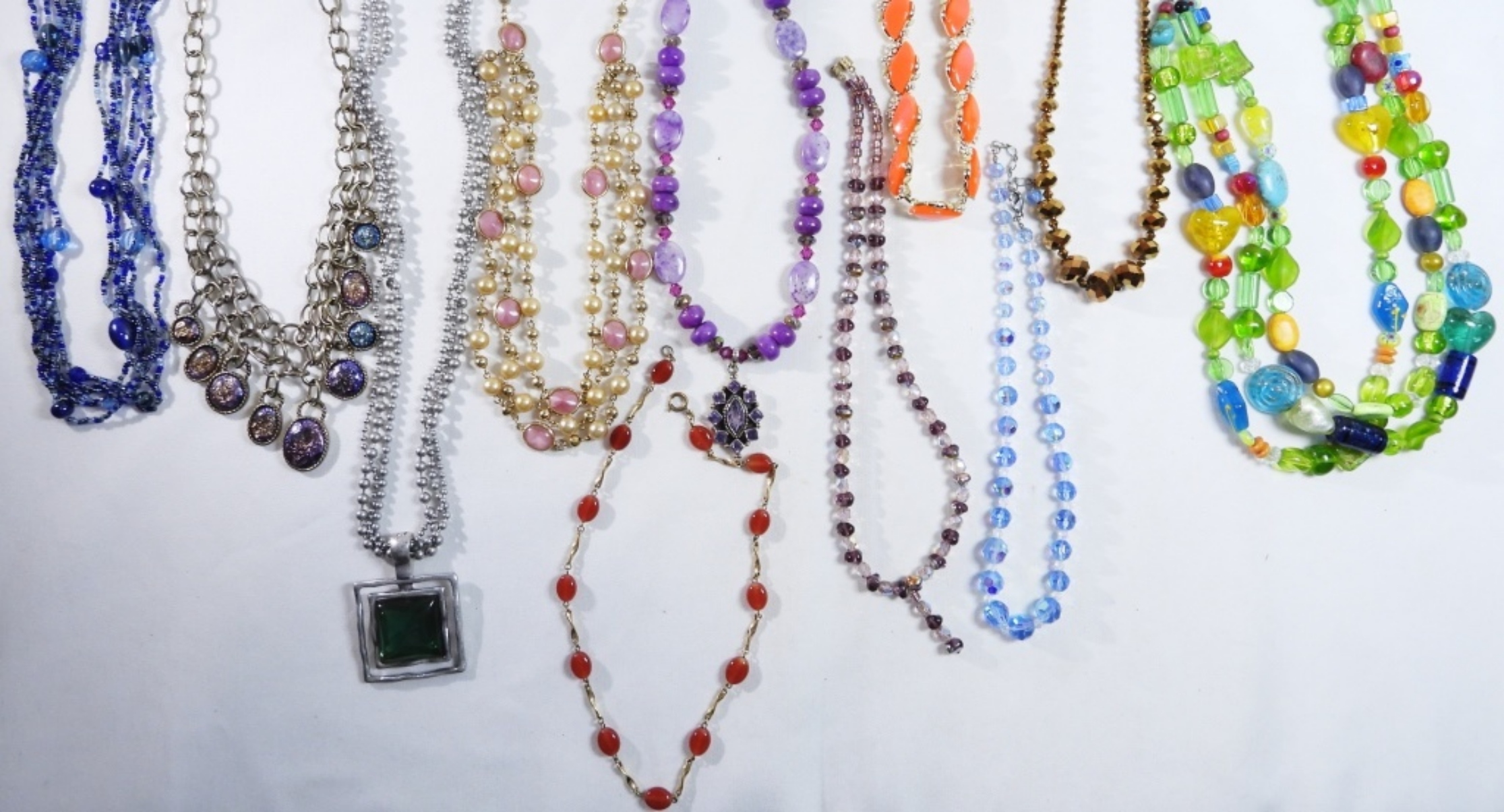 7 colorful beaded necklaces some with charms they have colors like green, purple, blue, yellow