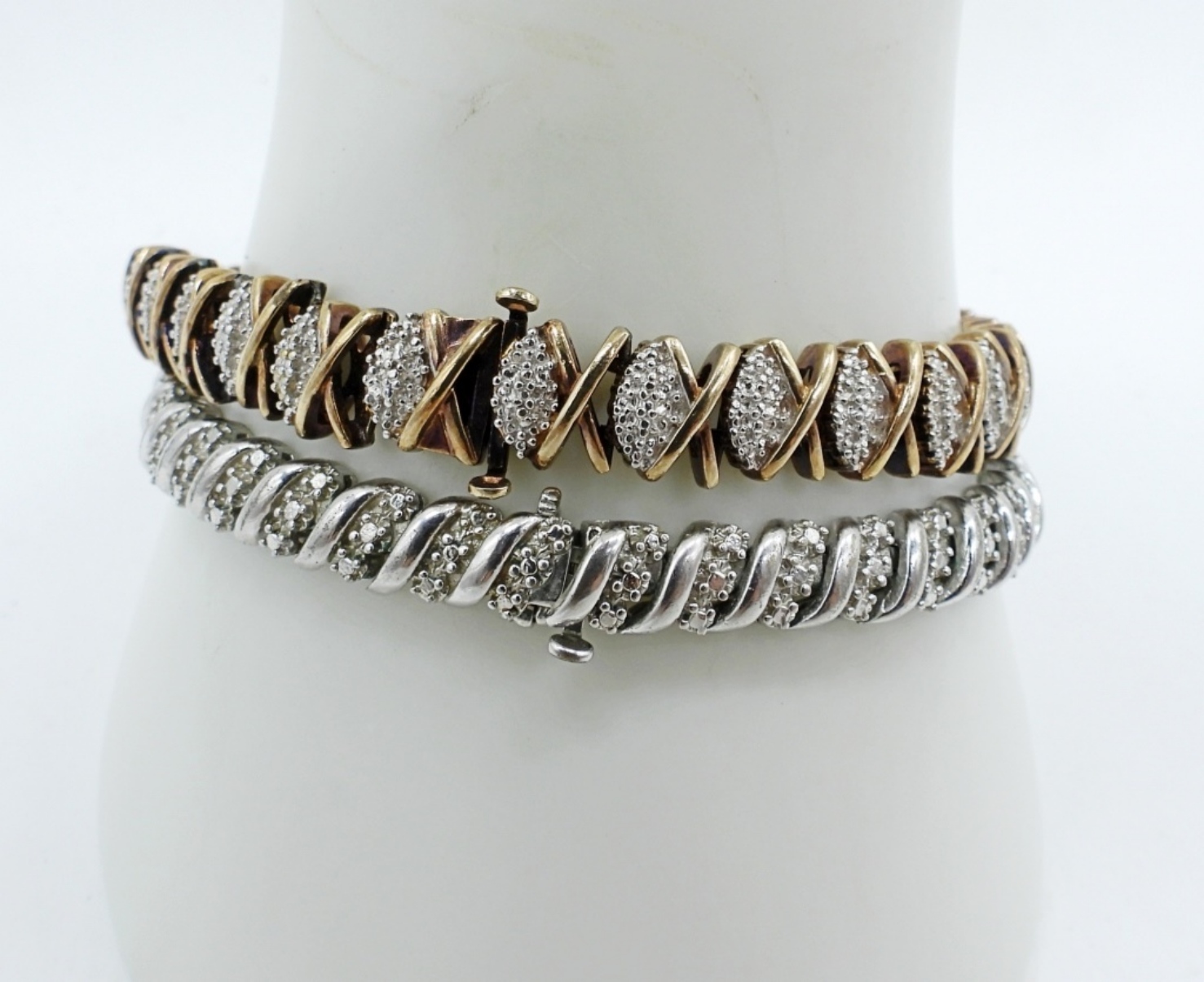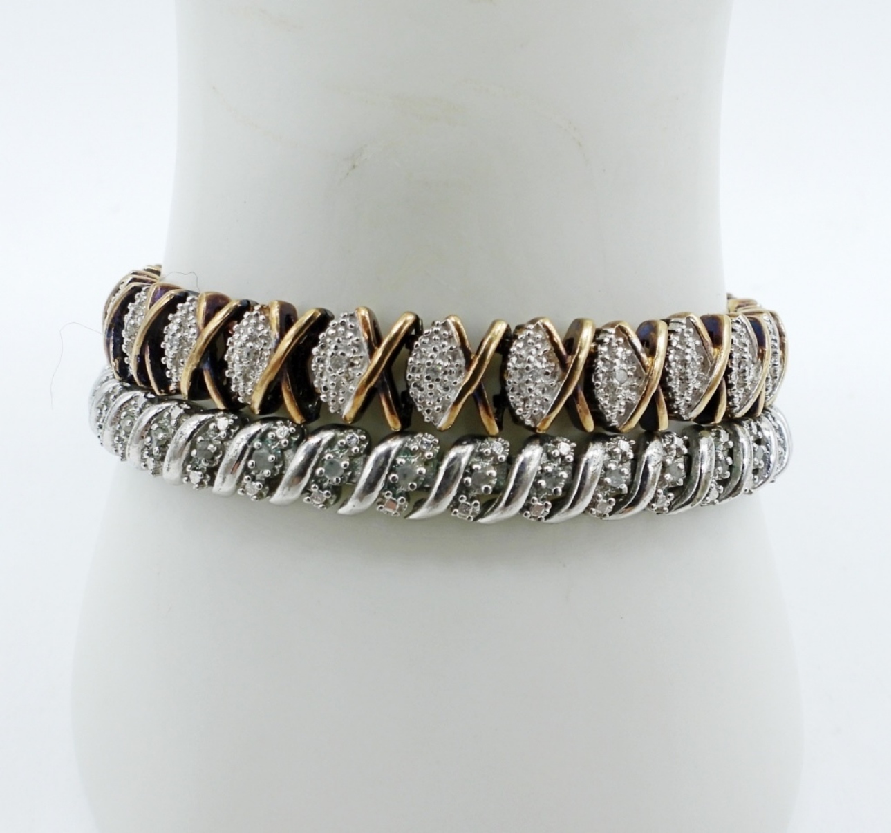 Two sterling diamond bracelets, one gold tone. Both are 8″ long. (24.4 dwt)