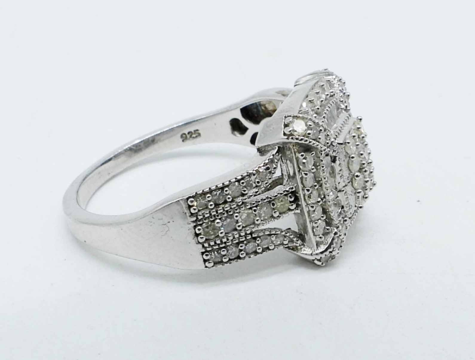 D’Joy Sterling Silver, Diamond Engagement Ring, size 10. MISSING TWO DIAMONDS. (3.5 DWT)