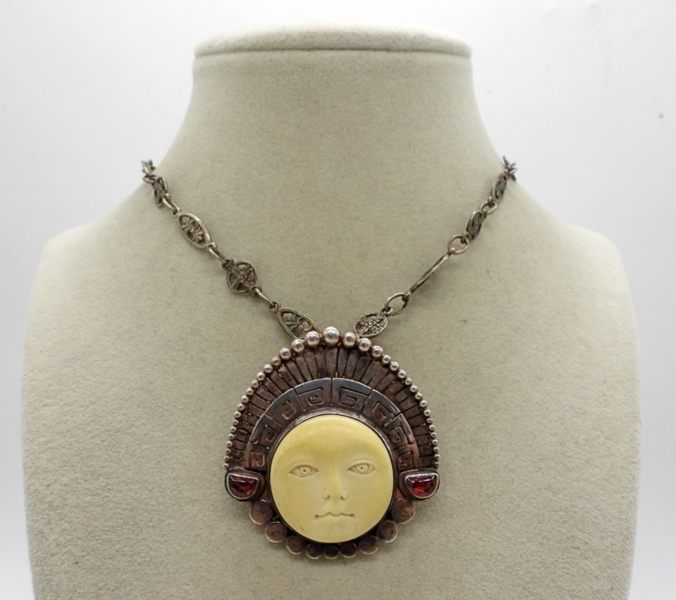Sajen Aztec Face with Headdress, Garnet Gemstones, Carved Bone Face & a 28″ Sterling chain. (31 DWT)
