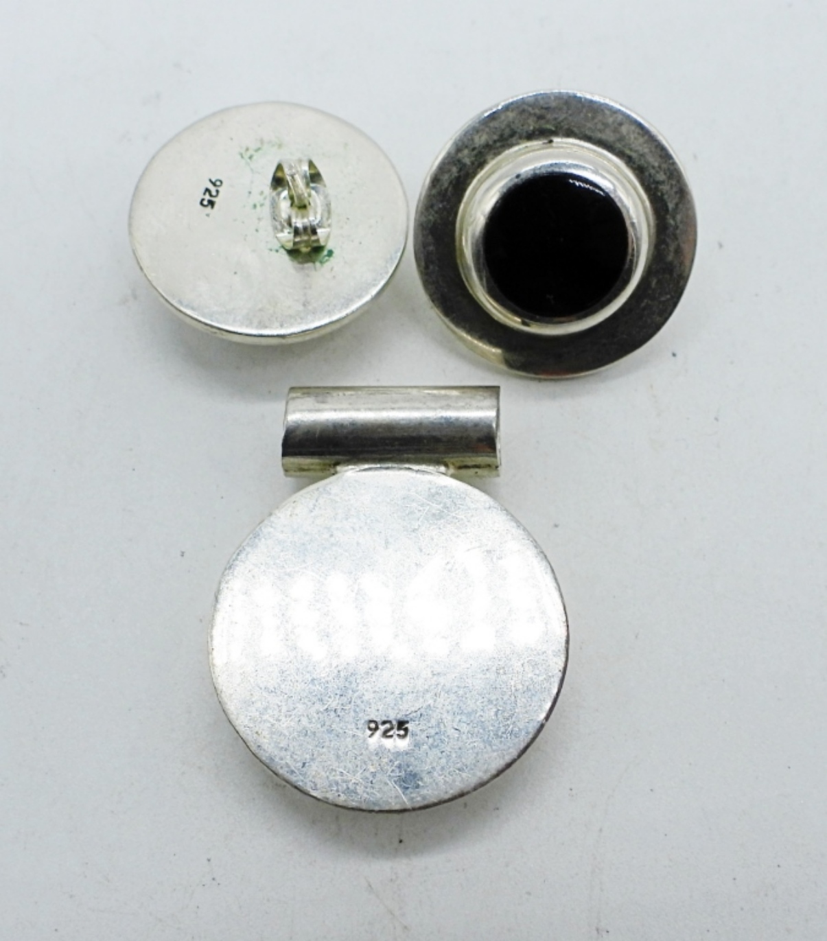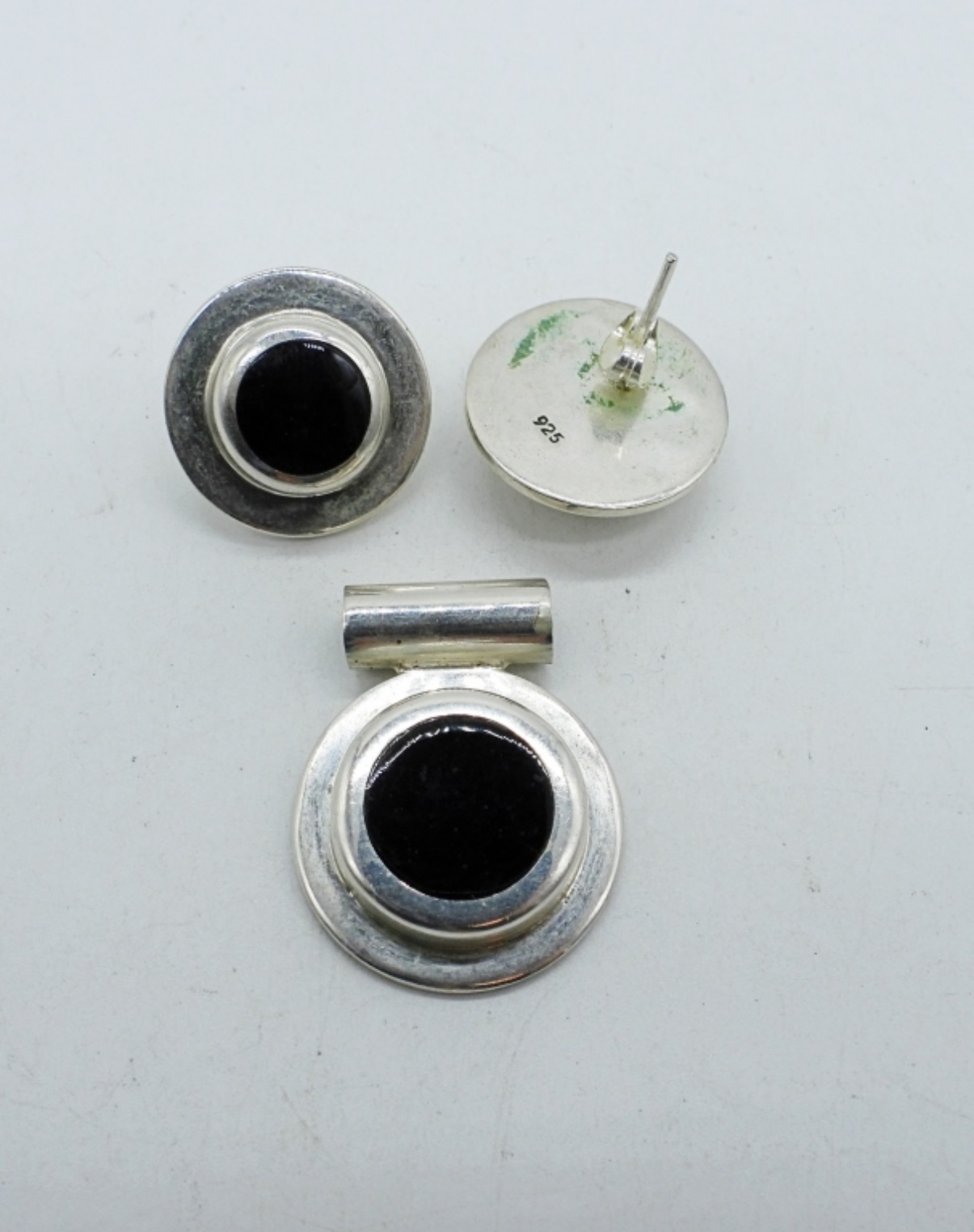 Black Onyx, Sterling pierced earrings with matching sider pendant. (18 DWT)