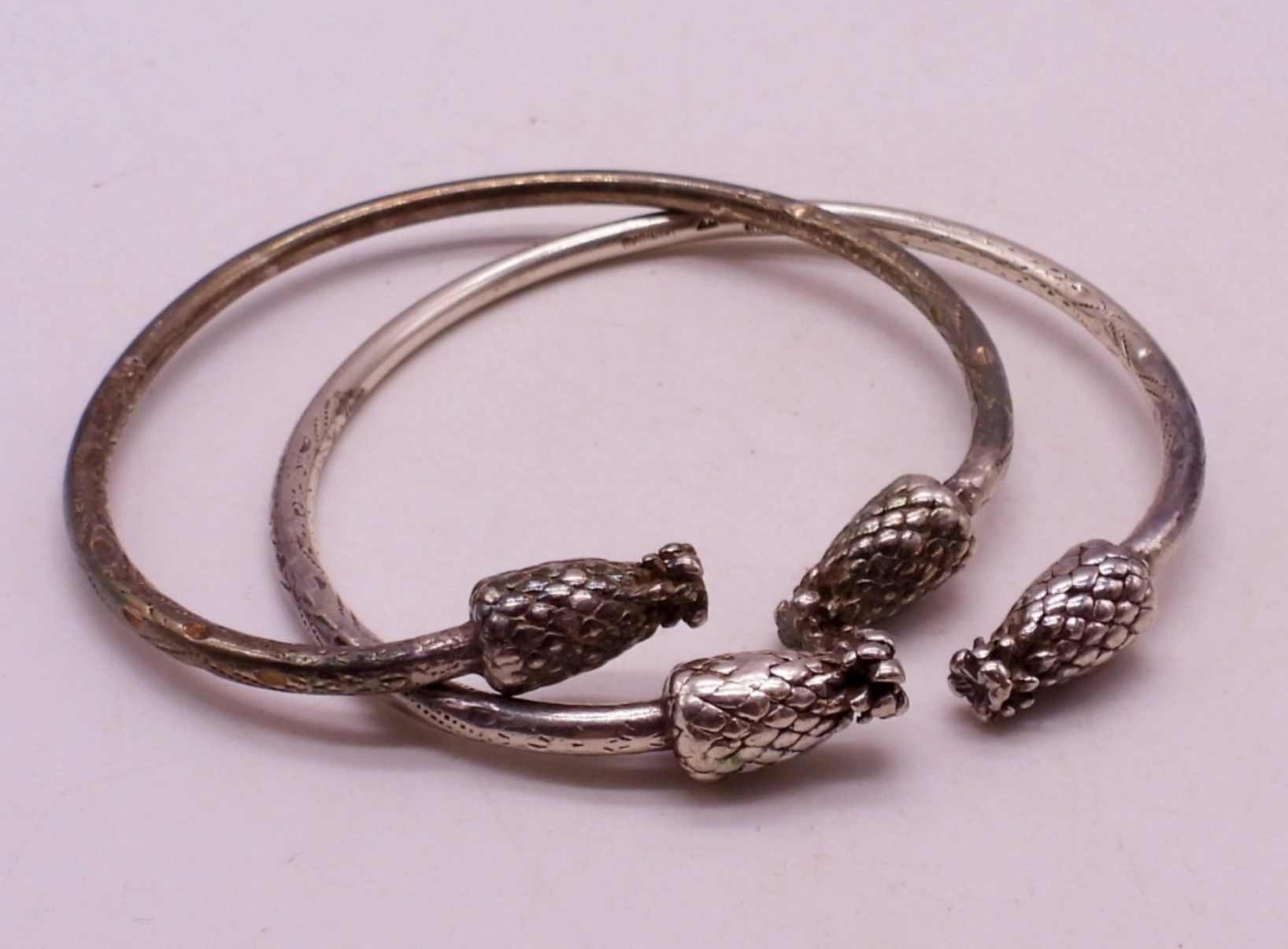 Two sterling bangle bracelets with what looks like pineapples at the ends. (33 DWT)