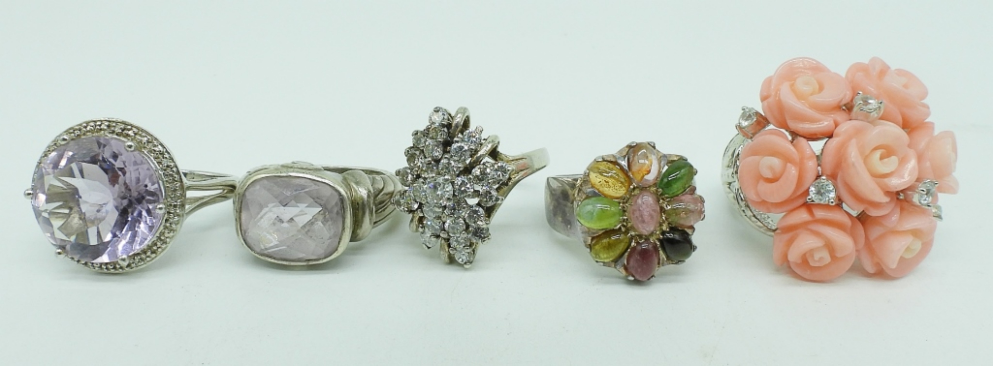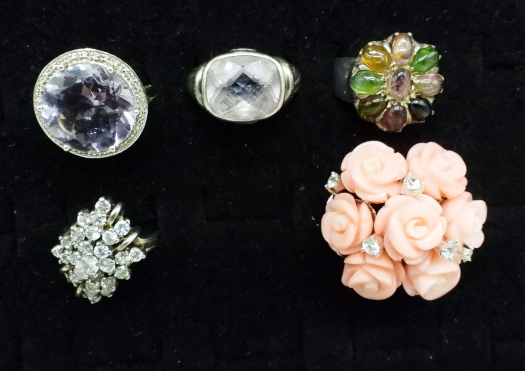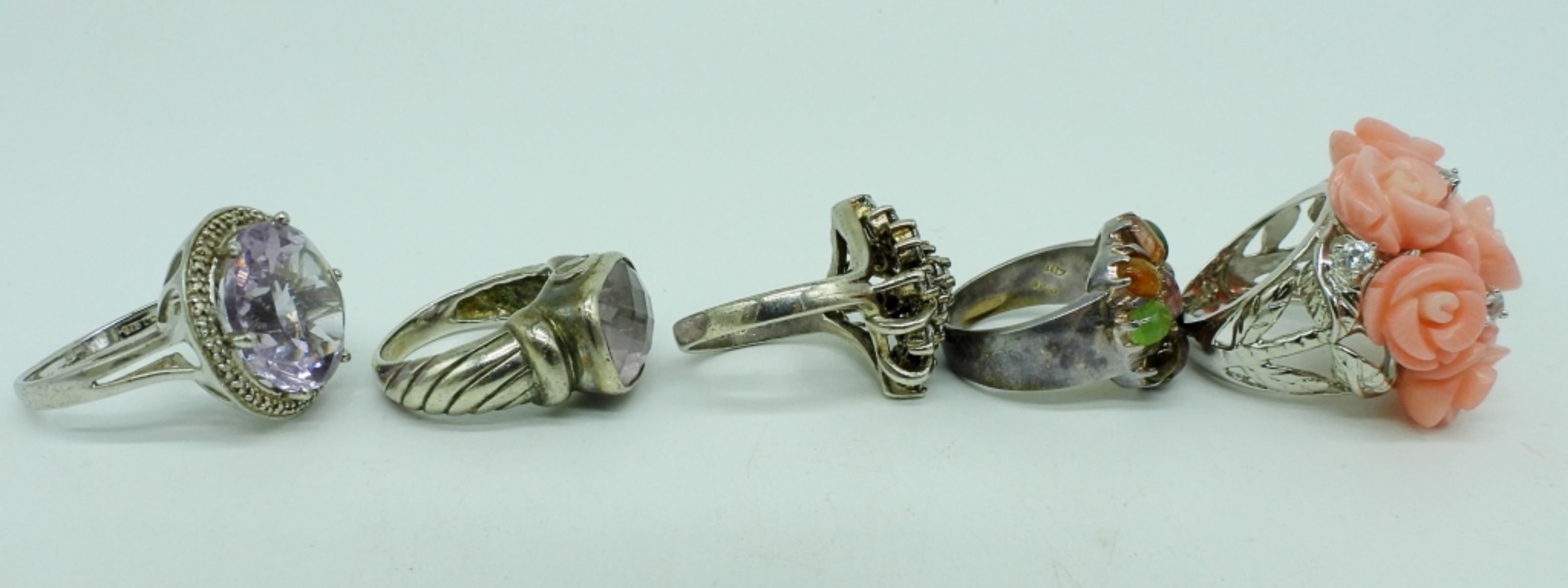 Five sterling fashion rings. Size 8. Amethyst, Simulated Diamond & Other. (22 dwt)