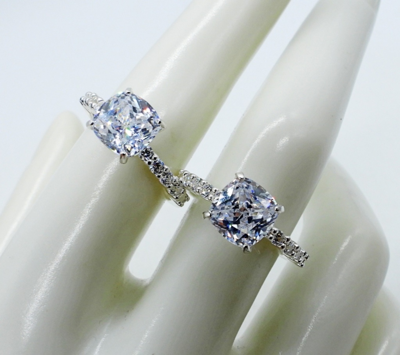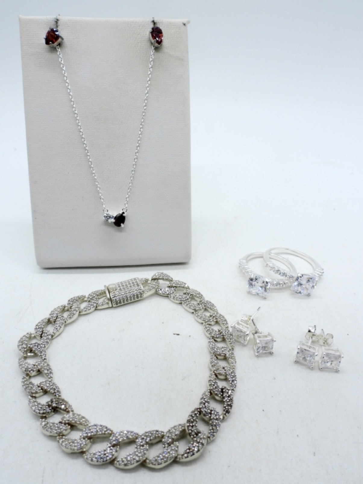 Simulated Diamond Sterling Jewelry. Two pair of pierced earrings. Two rings, size 7 & 8. Sterling simulated diamond-encrusted bracelet, 7″. (18.2 dwt)