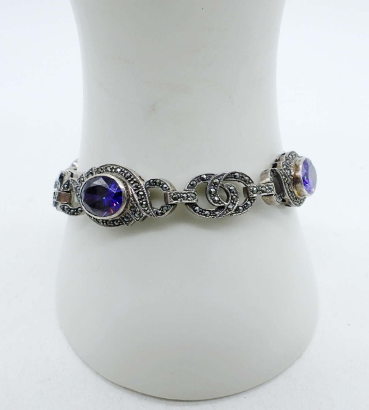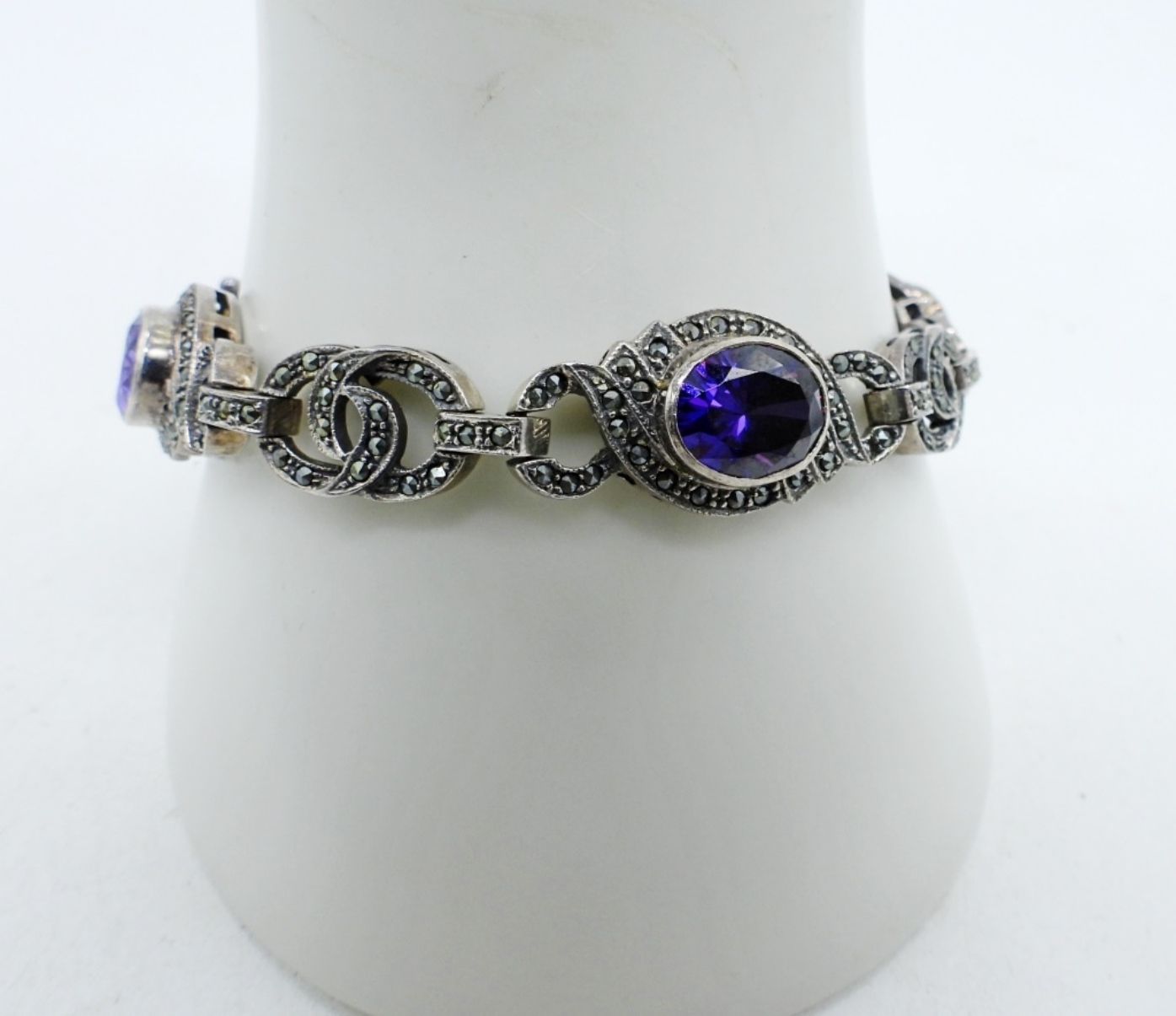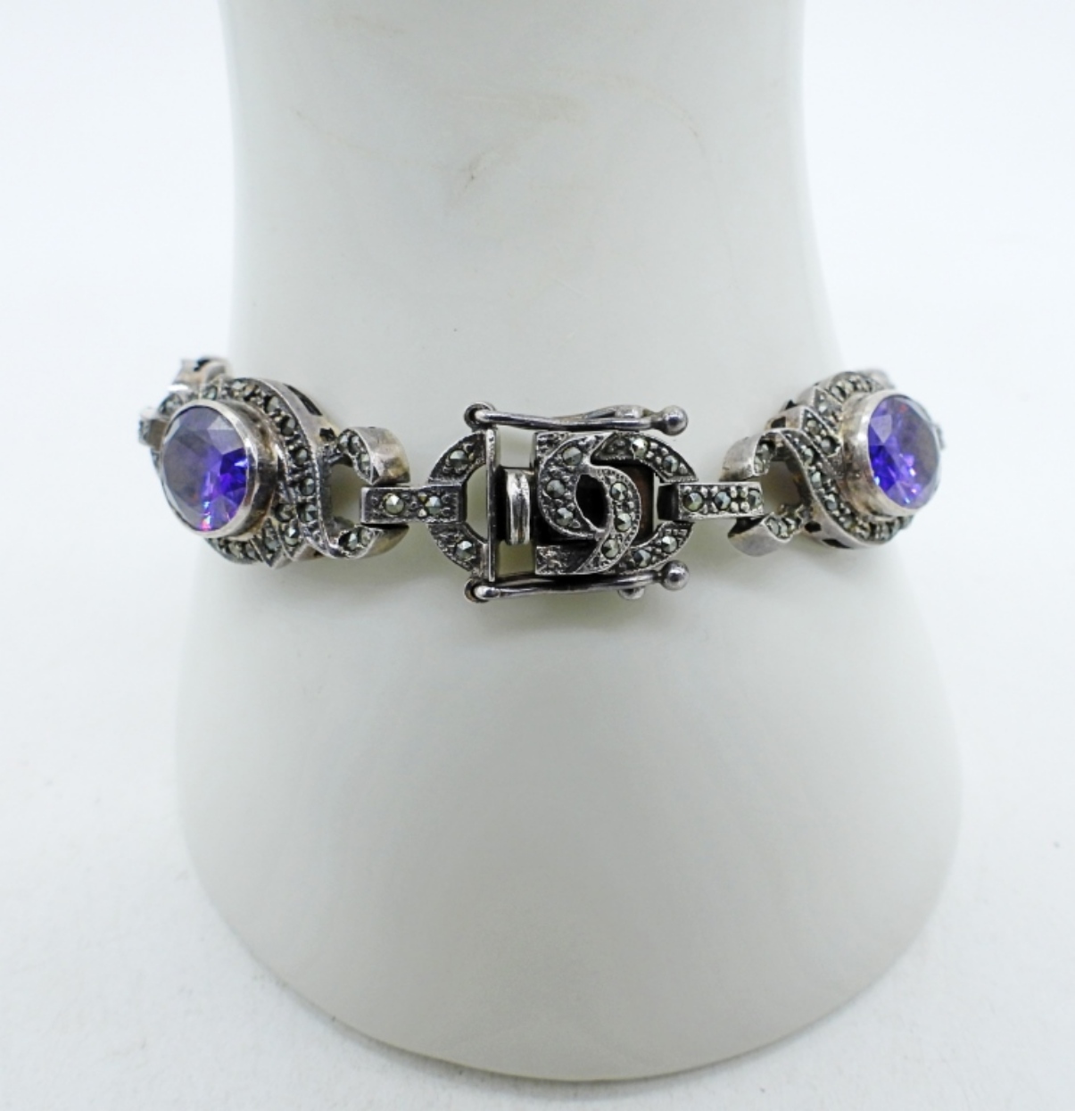 Art deco faux alexandrite & marcasite sterling bracelet, 7.5″ (19.3 dwt)