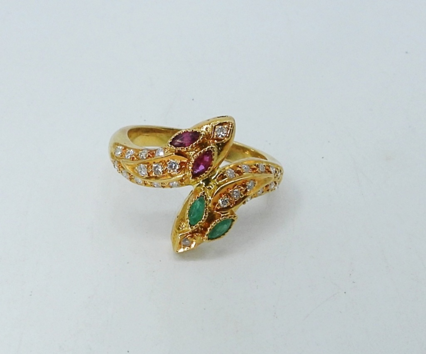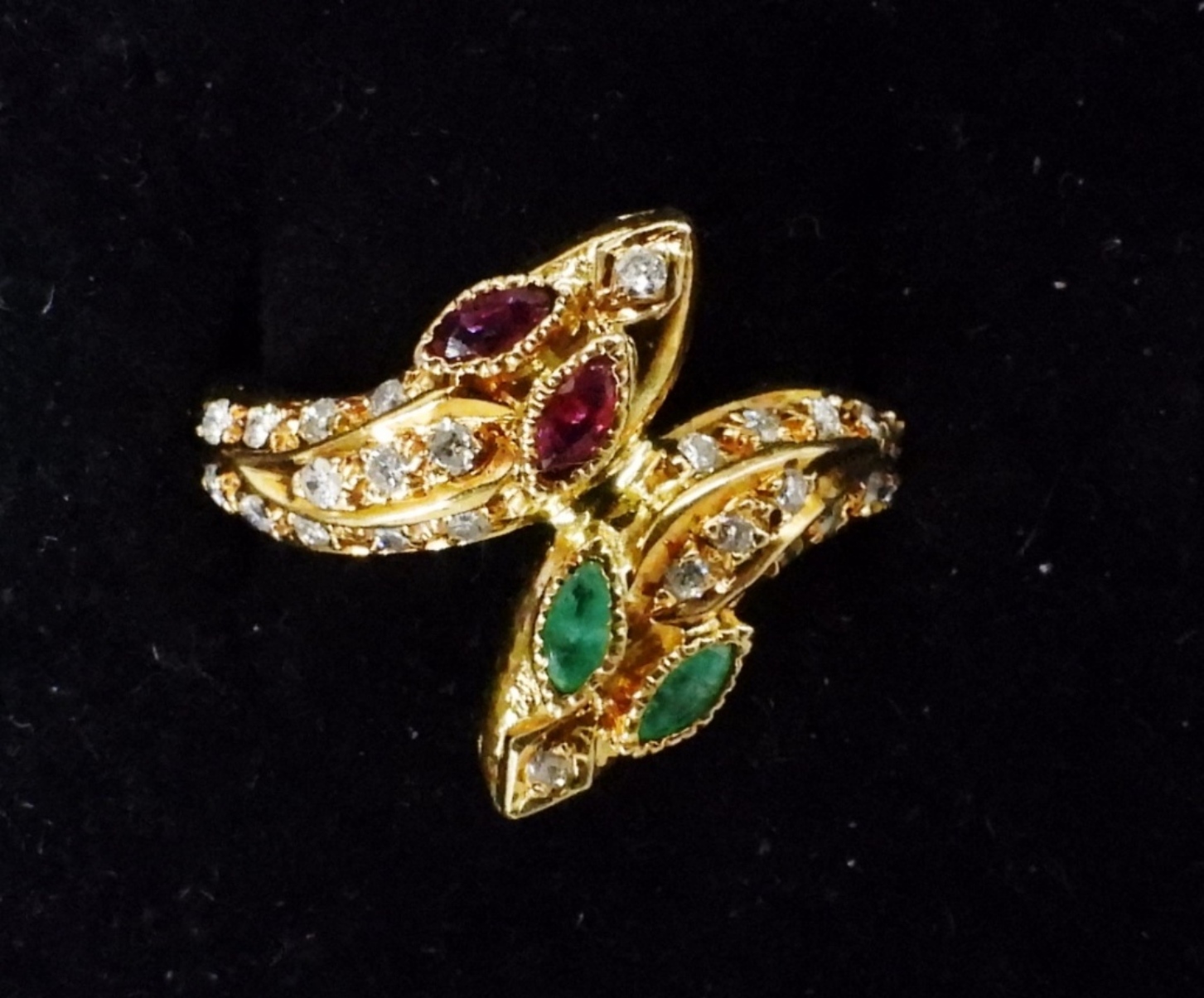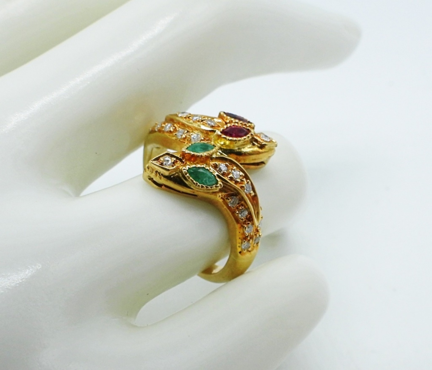 14k Yellow gold snake ring, size 7. Diamonds (tested), Rubies & Emeralds (untested). Gorgeous and unique piece! (3DWT)