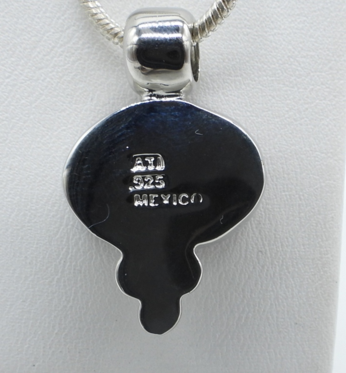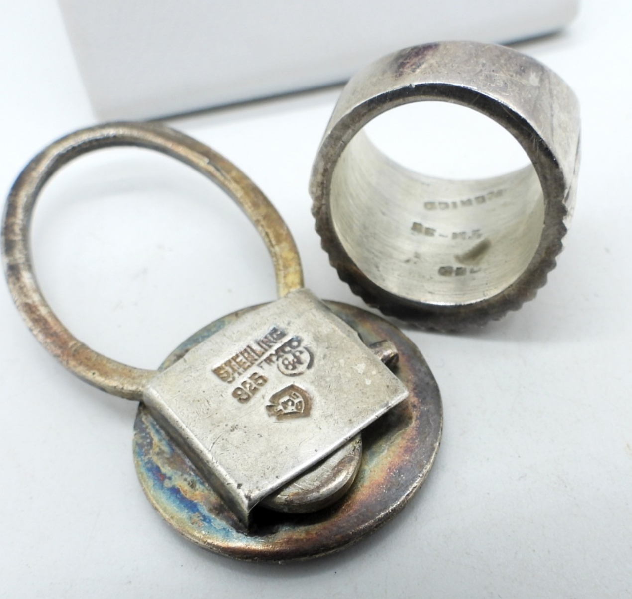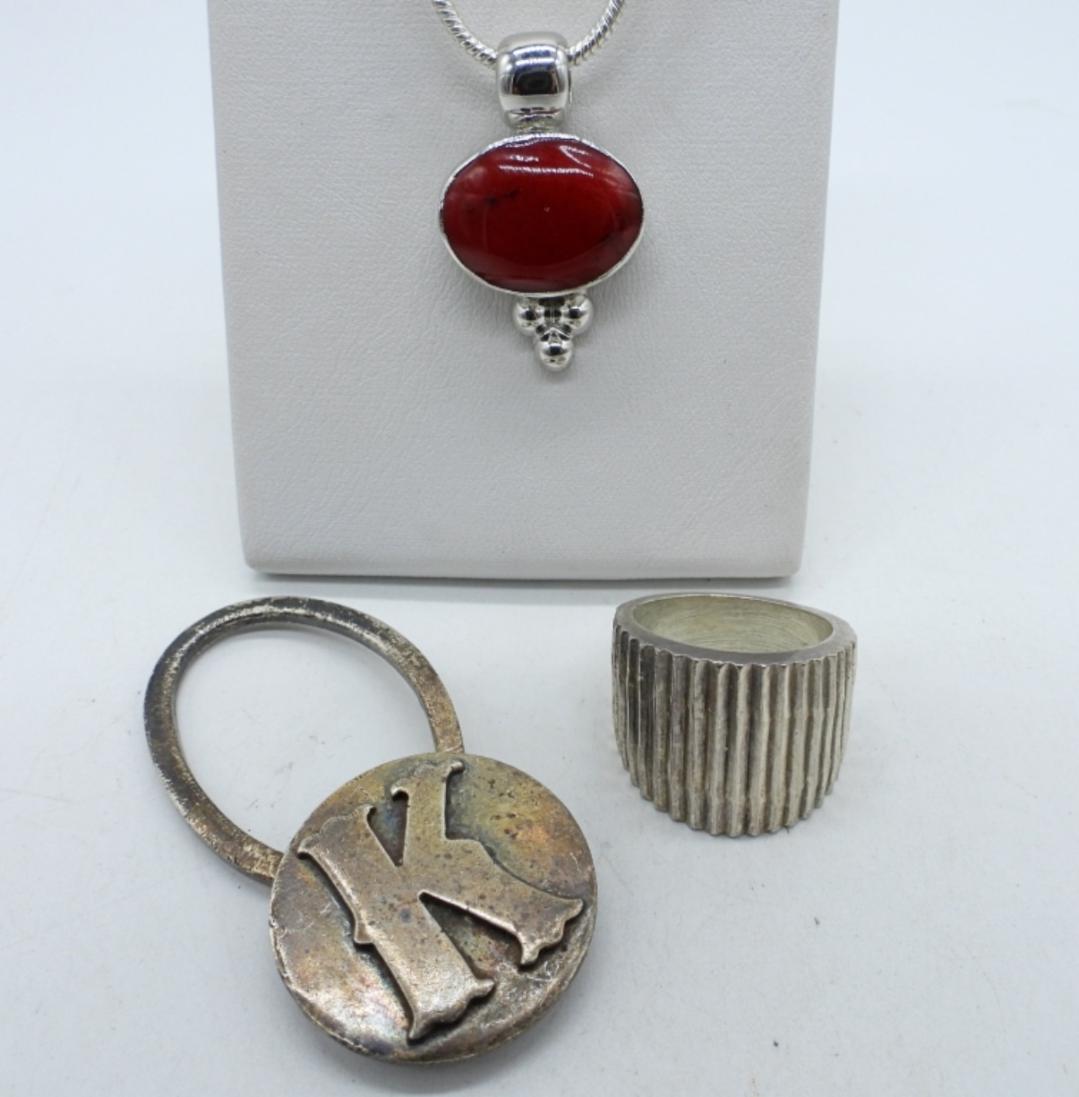 Taxco keychain with a “K” on it. (Sterling 925 Taxco). Ring size 6.5 (TM-95 MEXICO 925). Sterling red gemstone pendant, 18″ (ATI 925 MEXICO). (29 DWT)