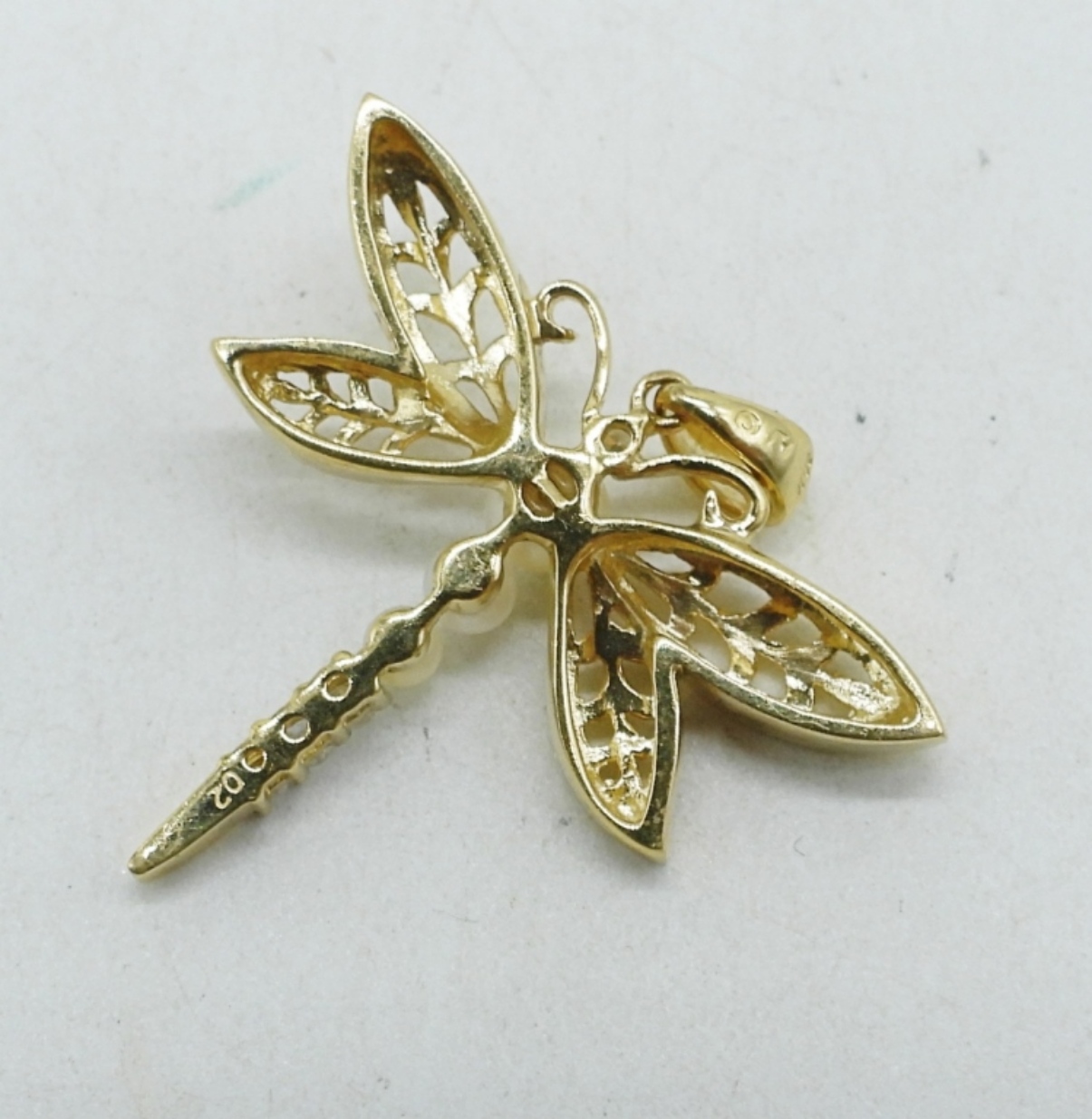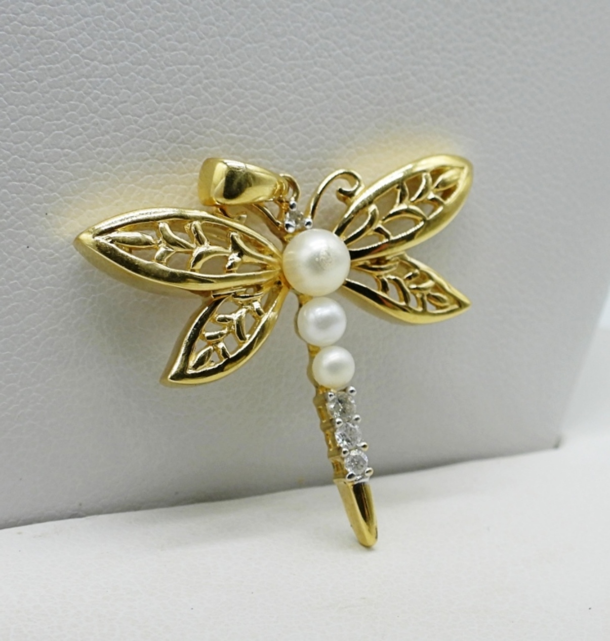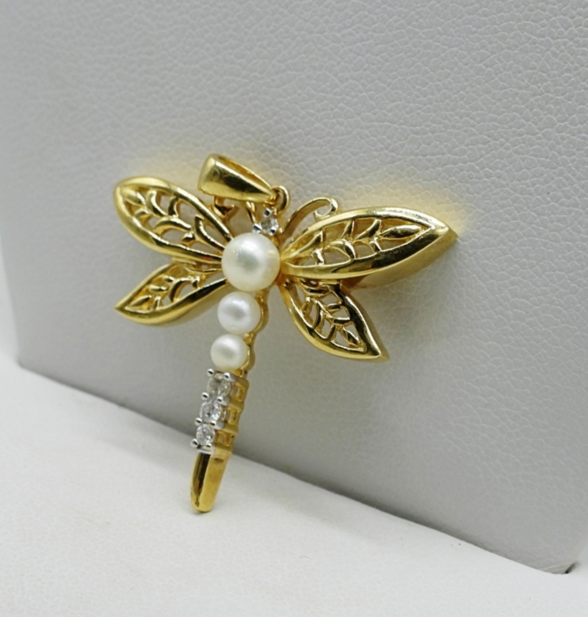 10k Yellow Gold Dragonfly Pendant with 3 pearl and 3 diamonds. 1″ Long. (1.9 DWT WITH STONES)