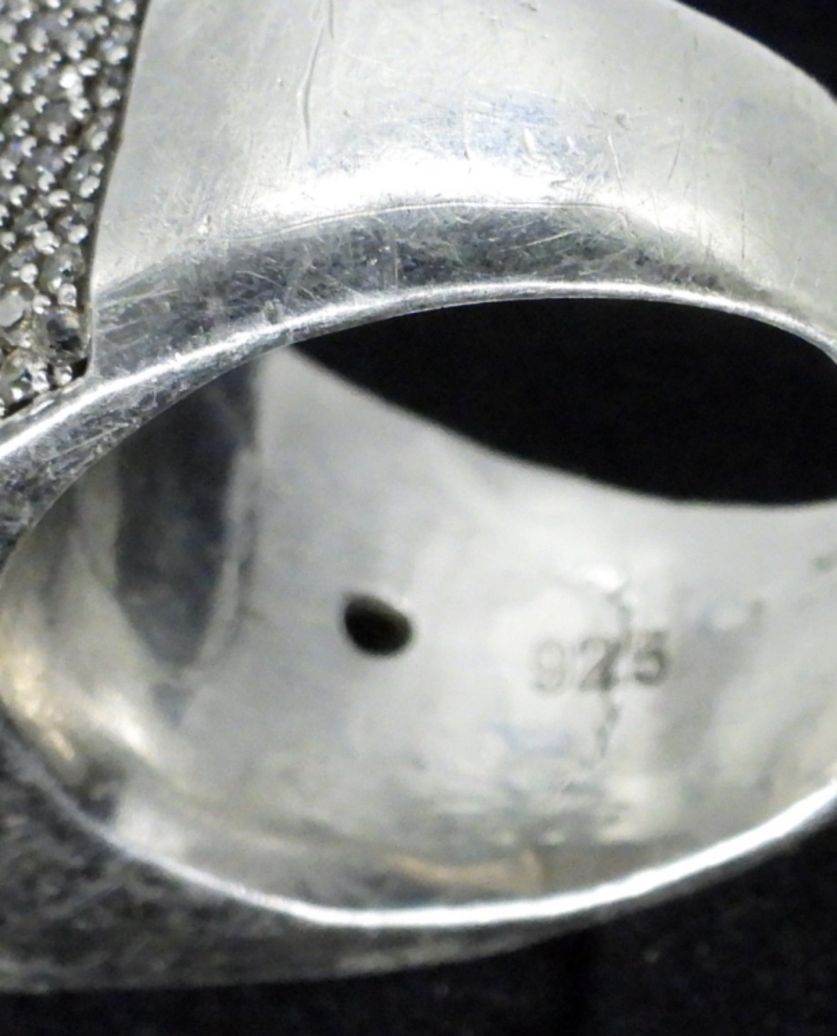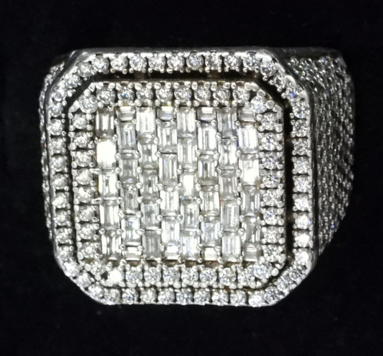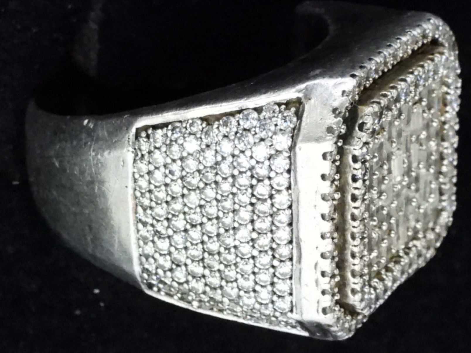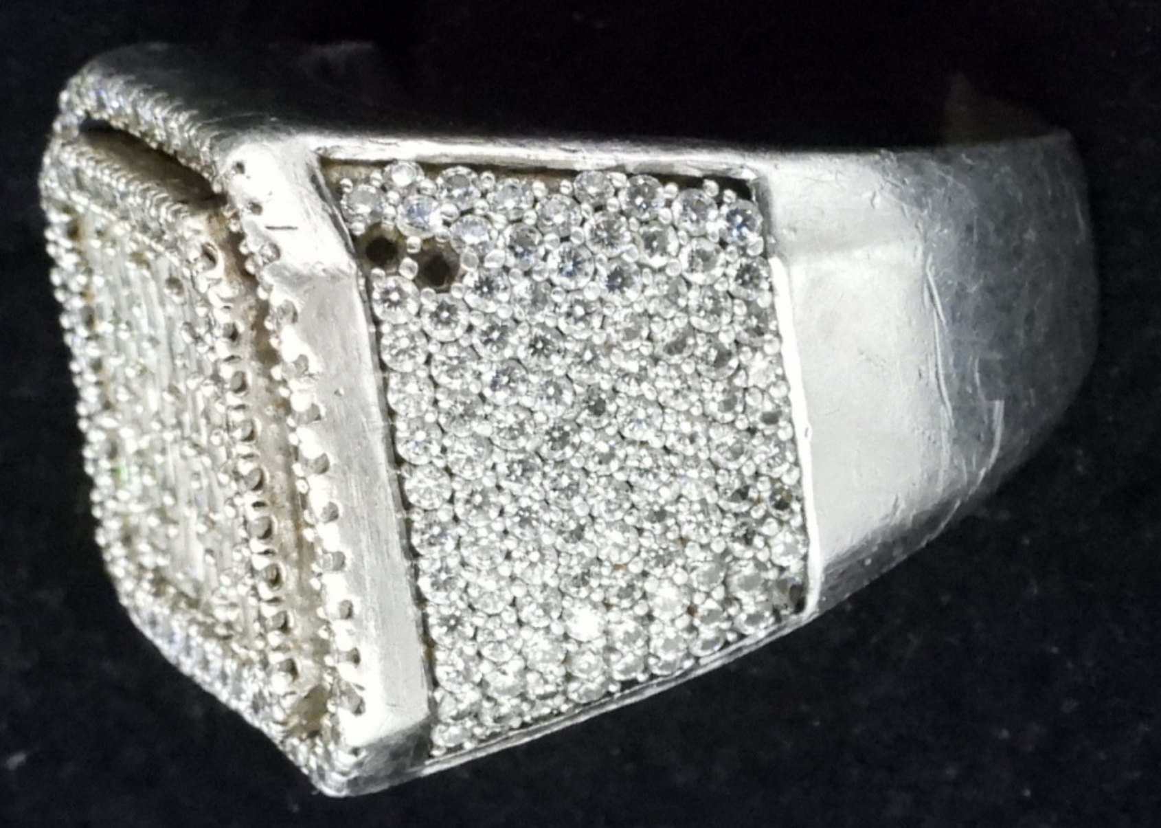 Large Men’s Diamond / Moissanite Sterling Ring. Size 14. Top of the ring measures 1″ Squared. (16 DWT)