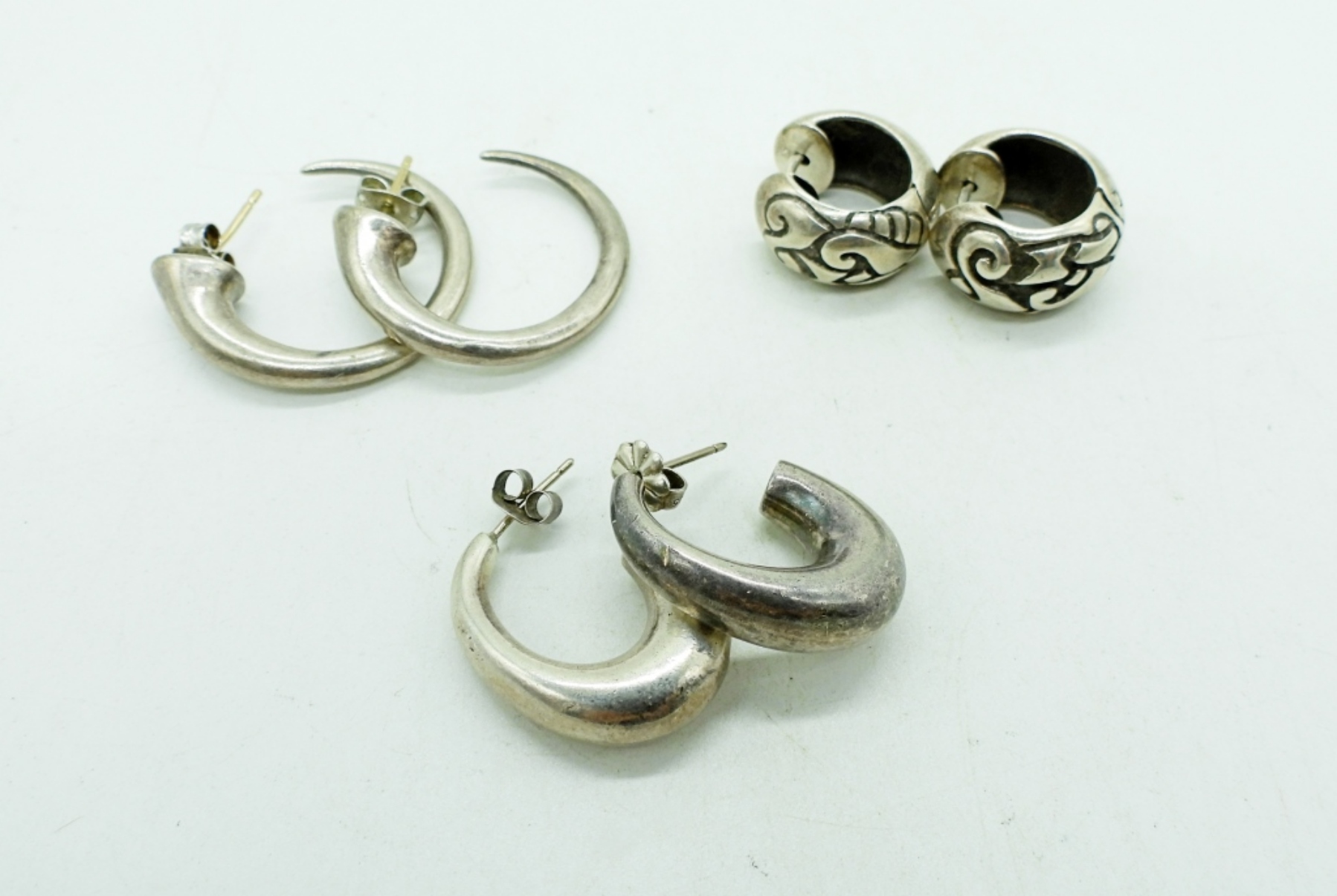 Three pair of vintage sterling pierced hoop earrings. Smallest pair, one does not clip shut. Needs repair. (18.6 DWT)