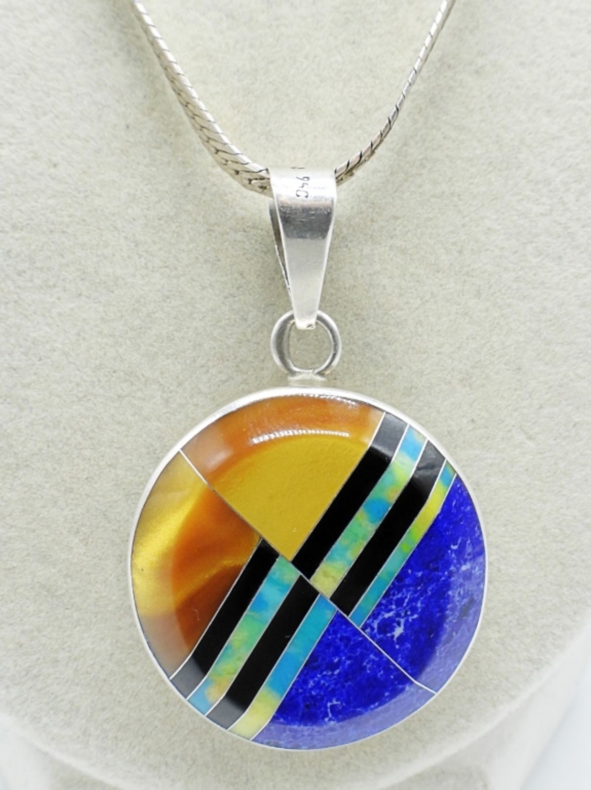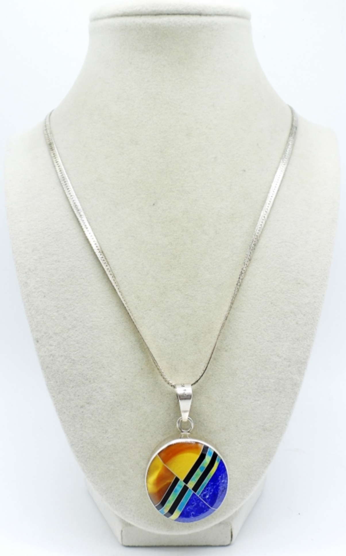 Beautiful multi-gemstone pendant in sterling, marked “Mexico 950″. Sterling chain 20”. Lapis Lazuli, Opal, Tigers Eye, Black Onyx. (16 dwt)