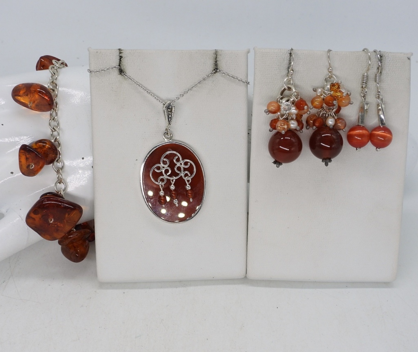 Sterling amber bracelet, 8″. Carnelian necklace 20″ with pierced earrings. Pierced dangling, orange cats eye earrings. (12 DWT)