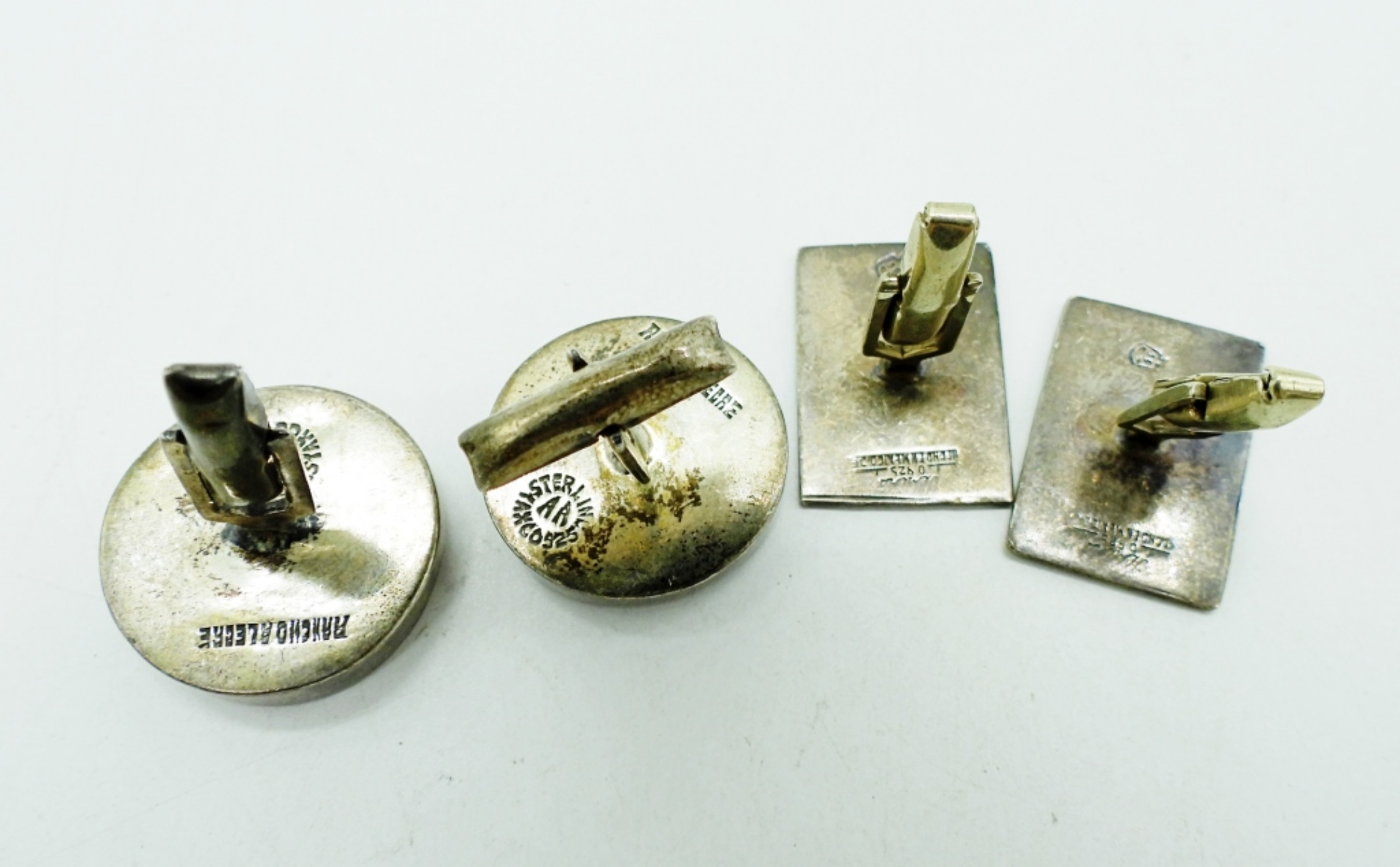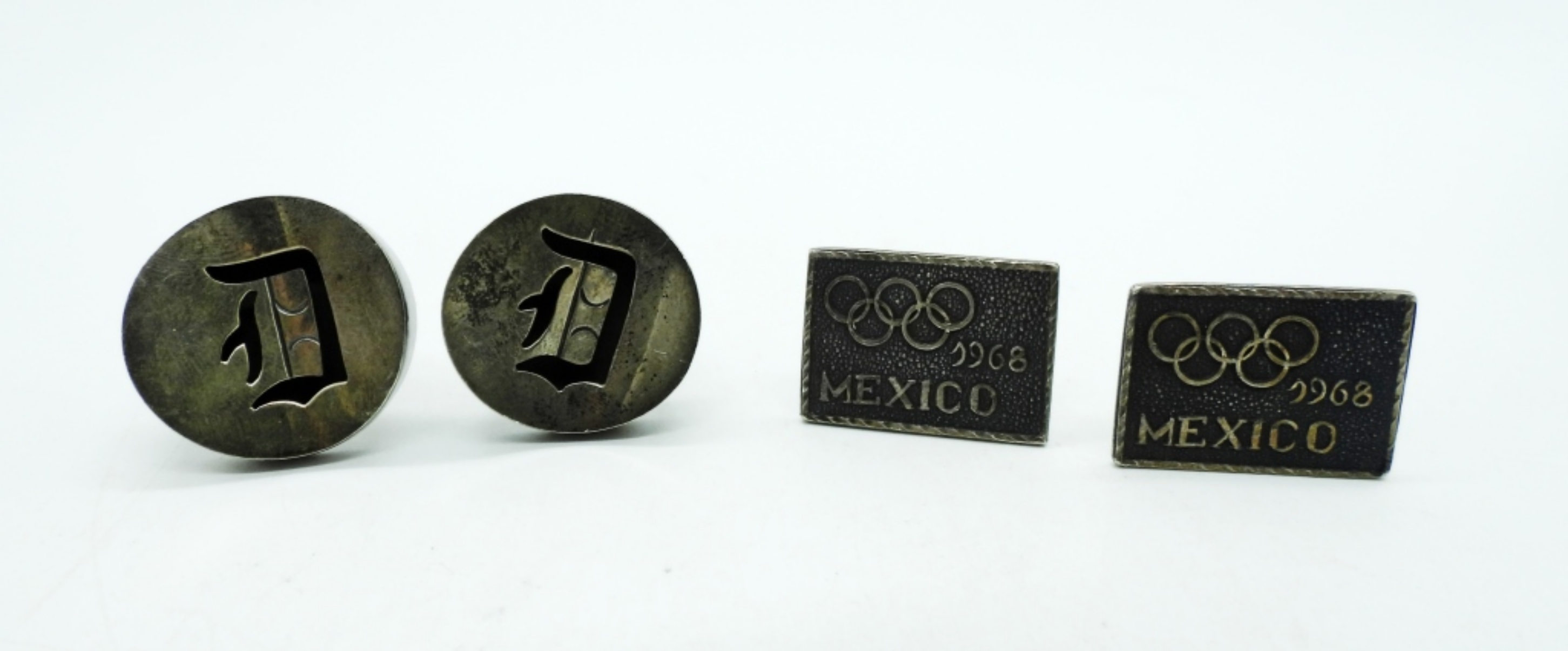 One pair of sterling concave cufflinks. Engraved with a “D”. Marked as Taxco, Please see photo for marking. One pair of vintage sterling Mexico Olympics 1968 cufflinks. (17.4 DWT)