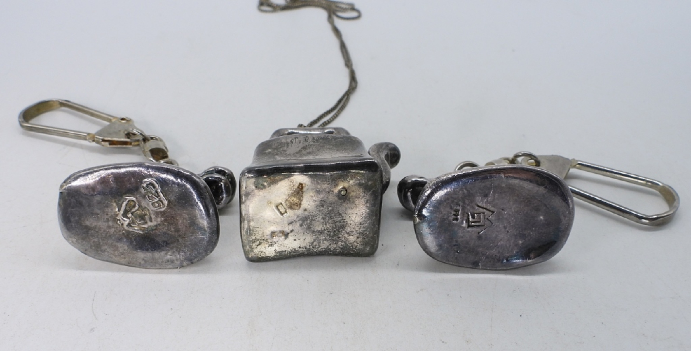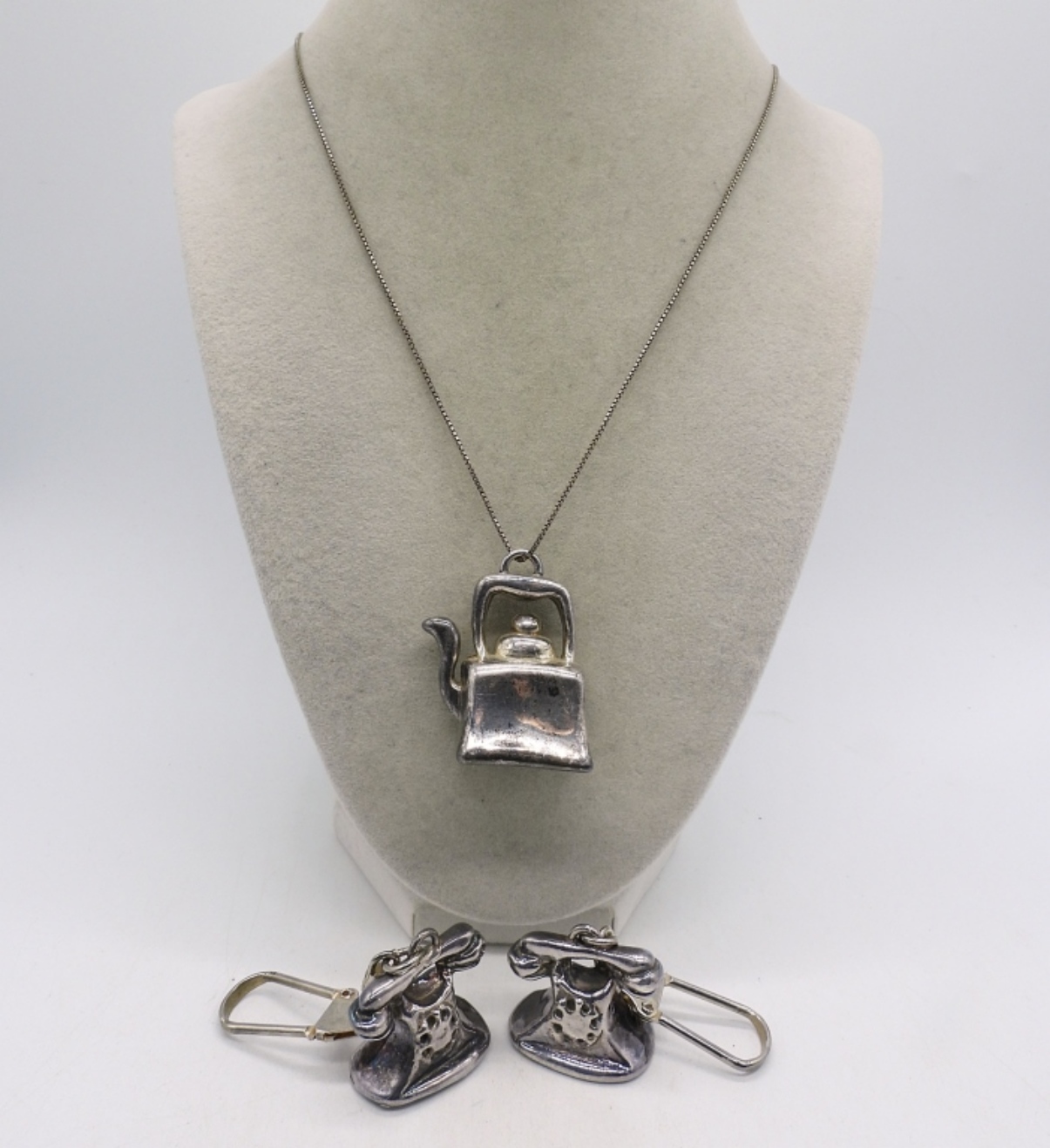 Two puffed sterling telephone keychains, 3″ long. Puffed sterling tea kettle pendant on a 24″ chain. (30.1 DWT)