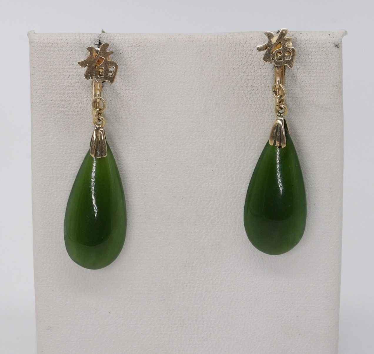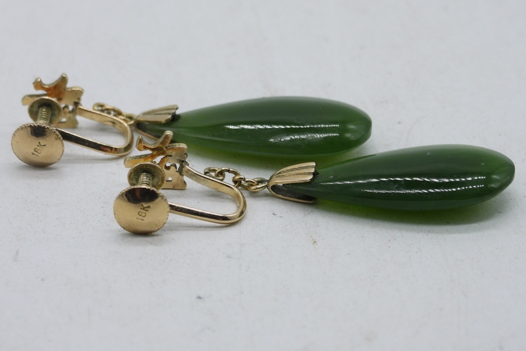 Vintage 18K Yellow Gold jade gemstone, teardrop screw back earrings. 1 3/4″ Long. (.6 DWT / 18KG)