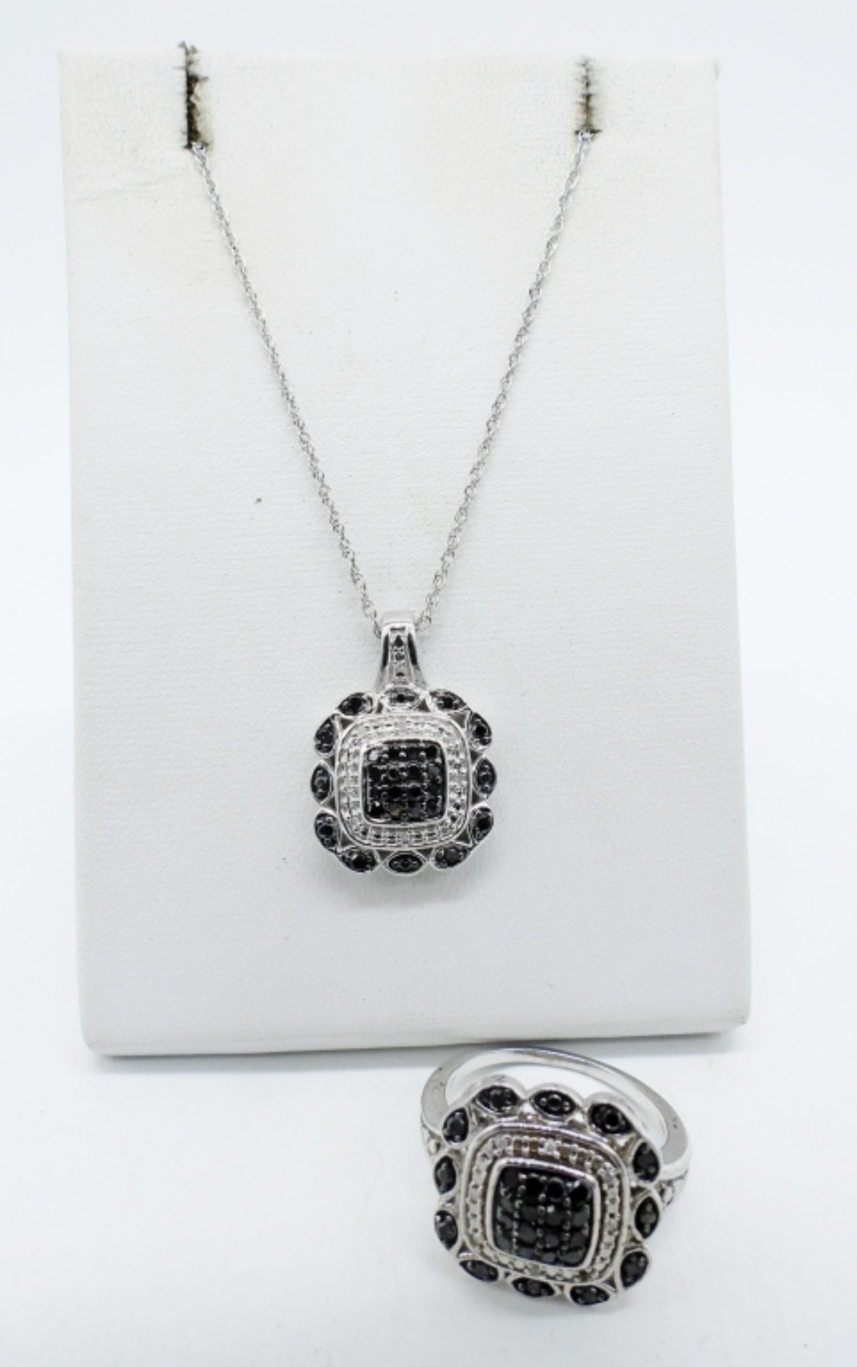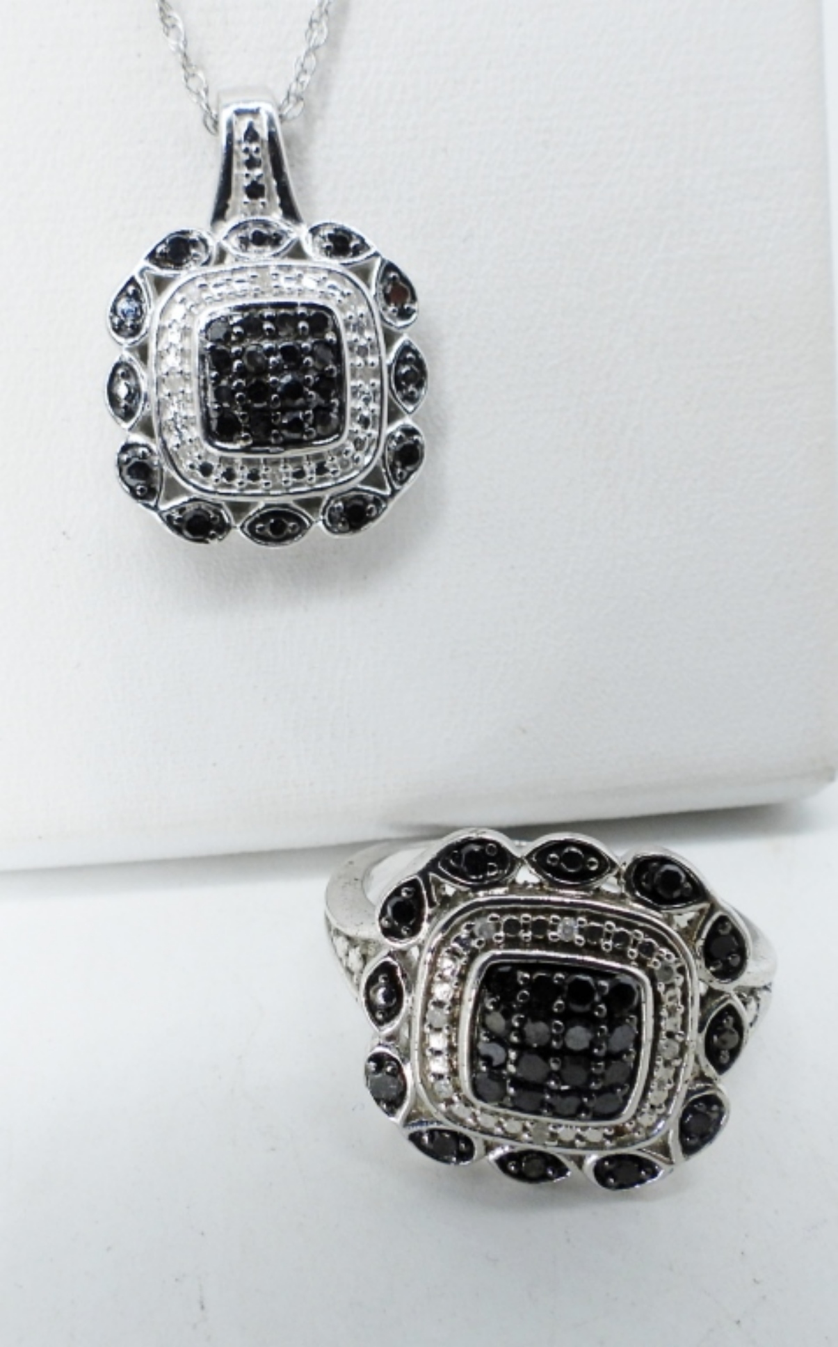 Black & White Moissanite in Sterling. Ring size 7. Necklace is 18″. (4.7 dwt)