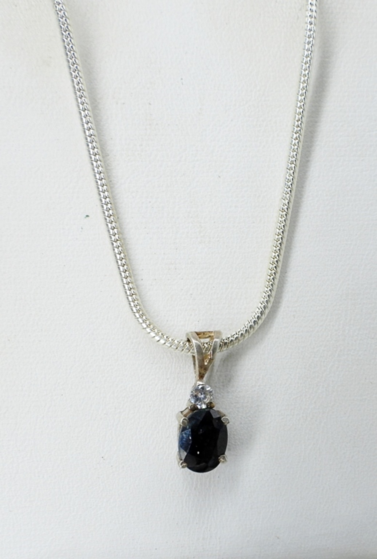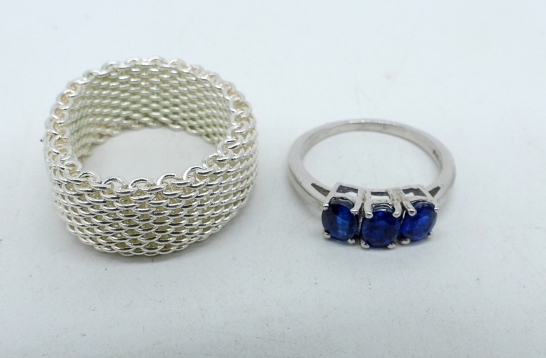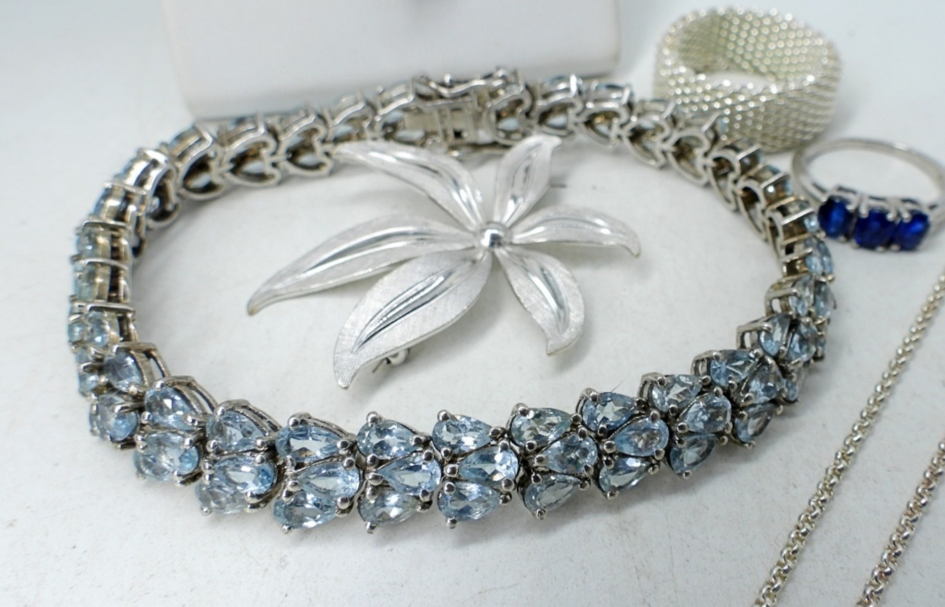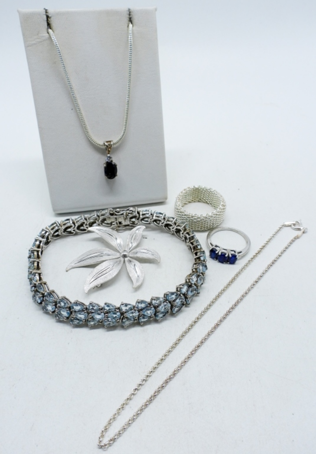 Blue Topaz Bracelet, 7.5″. Simulated sapphire necklace-16″ & ring size 6. Sterling mesh ring, size 10. Think chain anklet, 10″. (30.6 dwt)