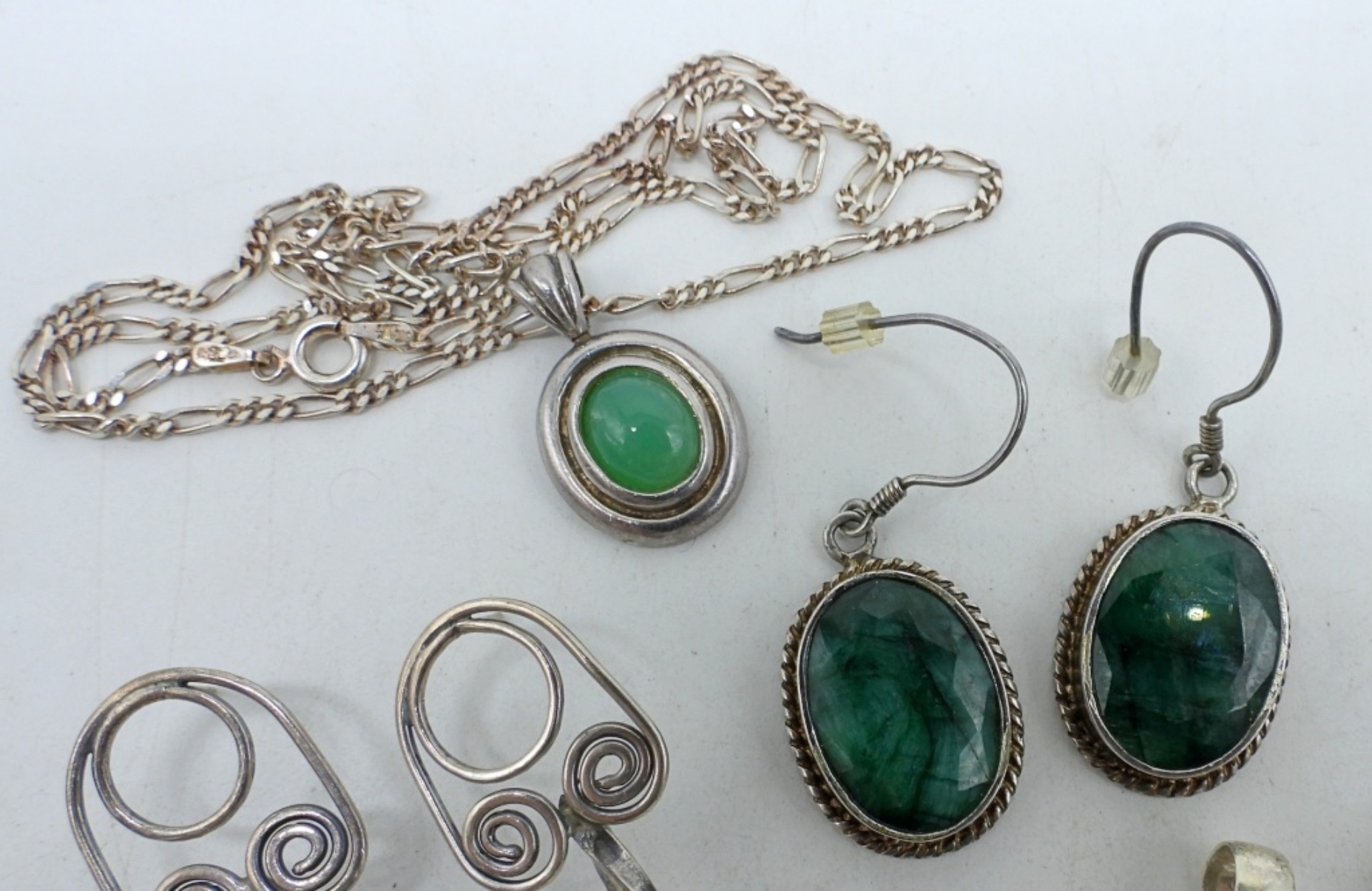 Two pair of pierced earrings, small malachite earrings, 3″, emerald earrings, 2″. Three pendants, one jade on a 18″ sterling chain.