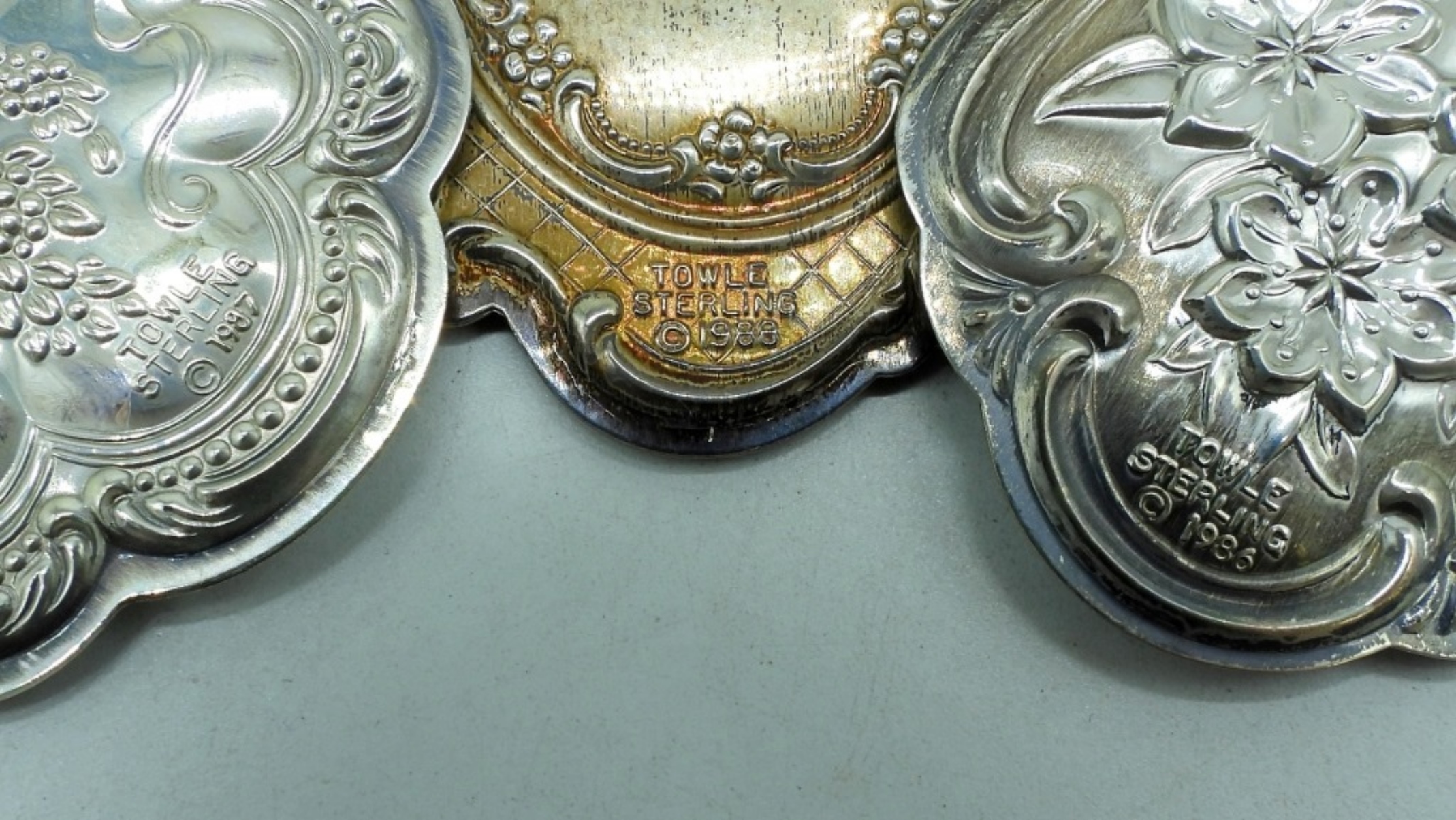 Three Sterling Towle Ornaments – 1986, 1987 & 1988. 2.5″ & 3″. (22.6 dwt)