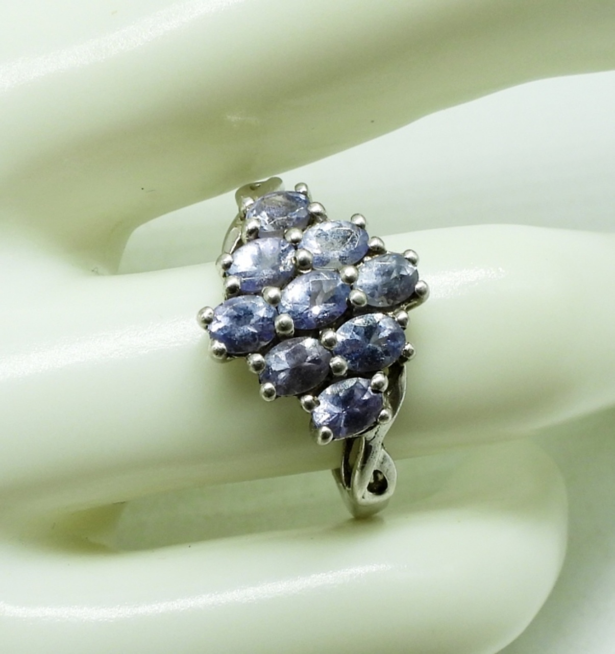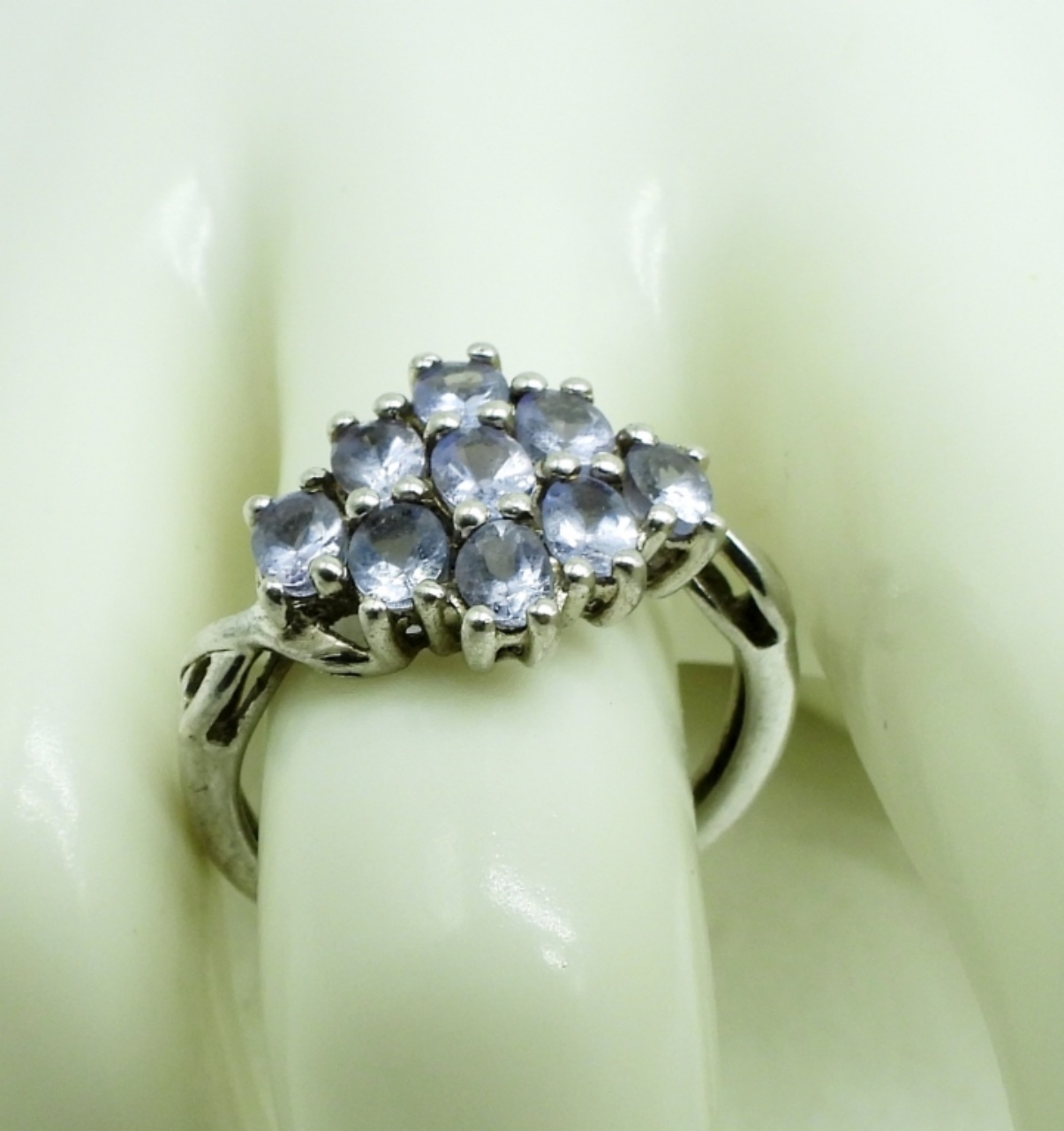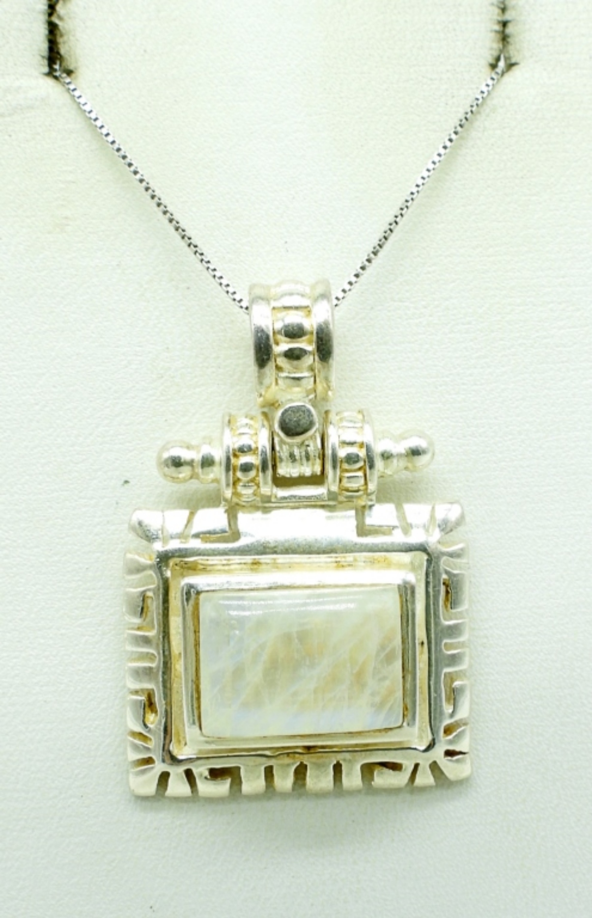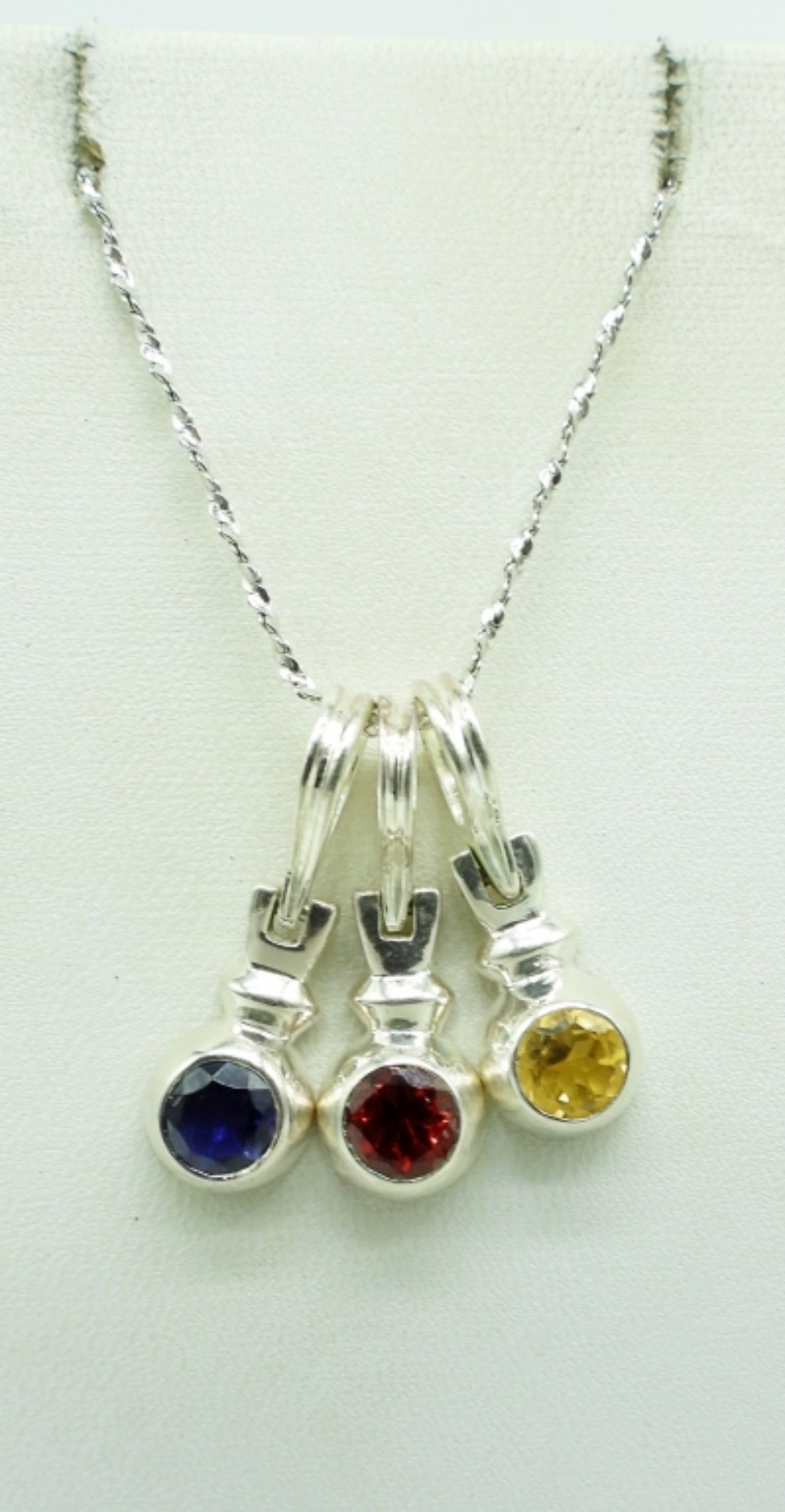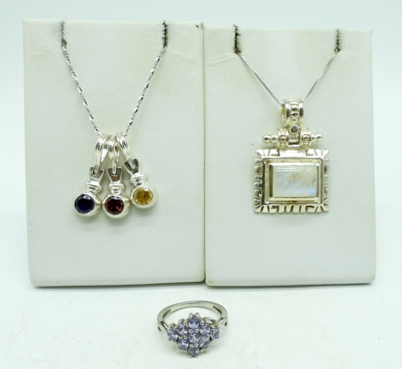 Moonstone pendant on a 18″ chain. 3 gemstone pendants on a 16″ chain. Amethyst sterling ring, size 7. (20.6 dwt)