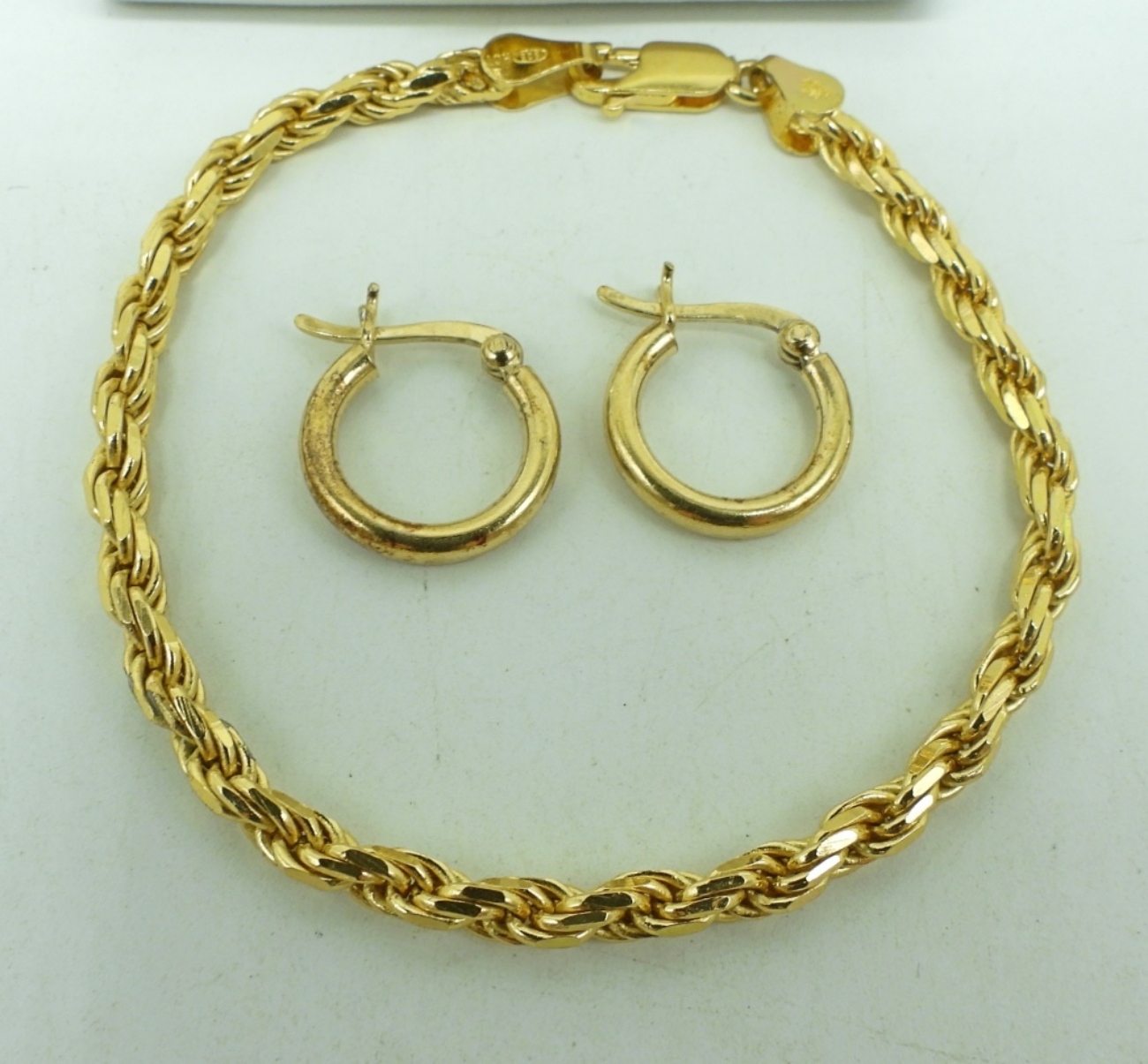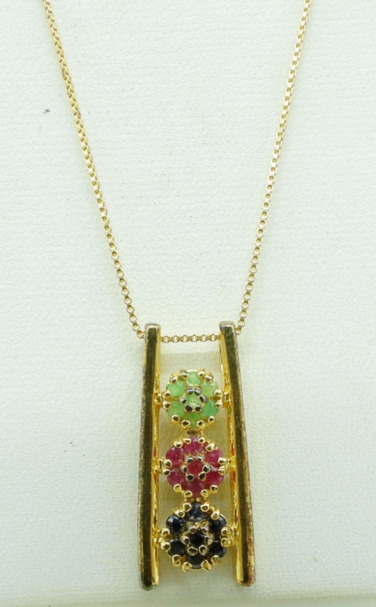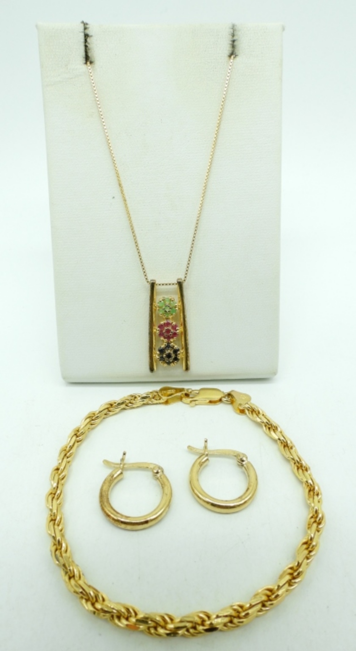 Gold tone sterling jewelry. Pendant has natural emeralds, rubies and sapphires on a 18″ chain. Pierced hoop earrings and a 7″ bracelet. (8.8 dwt)