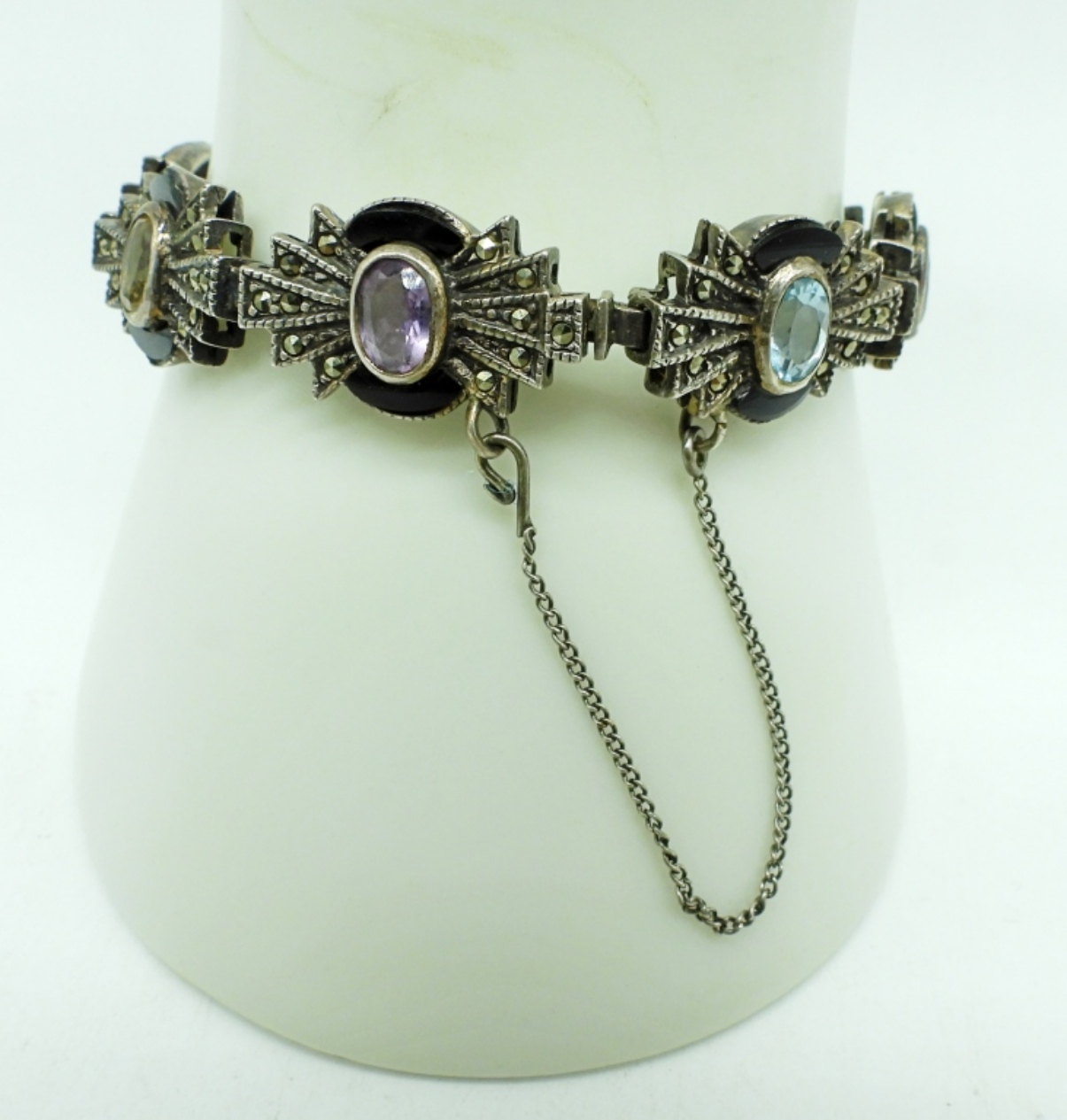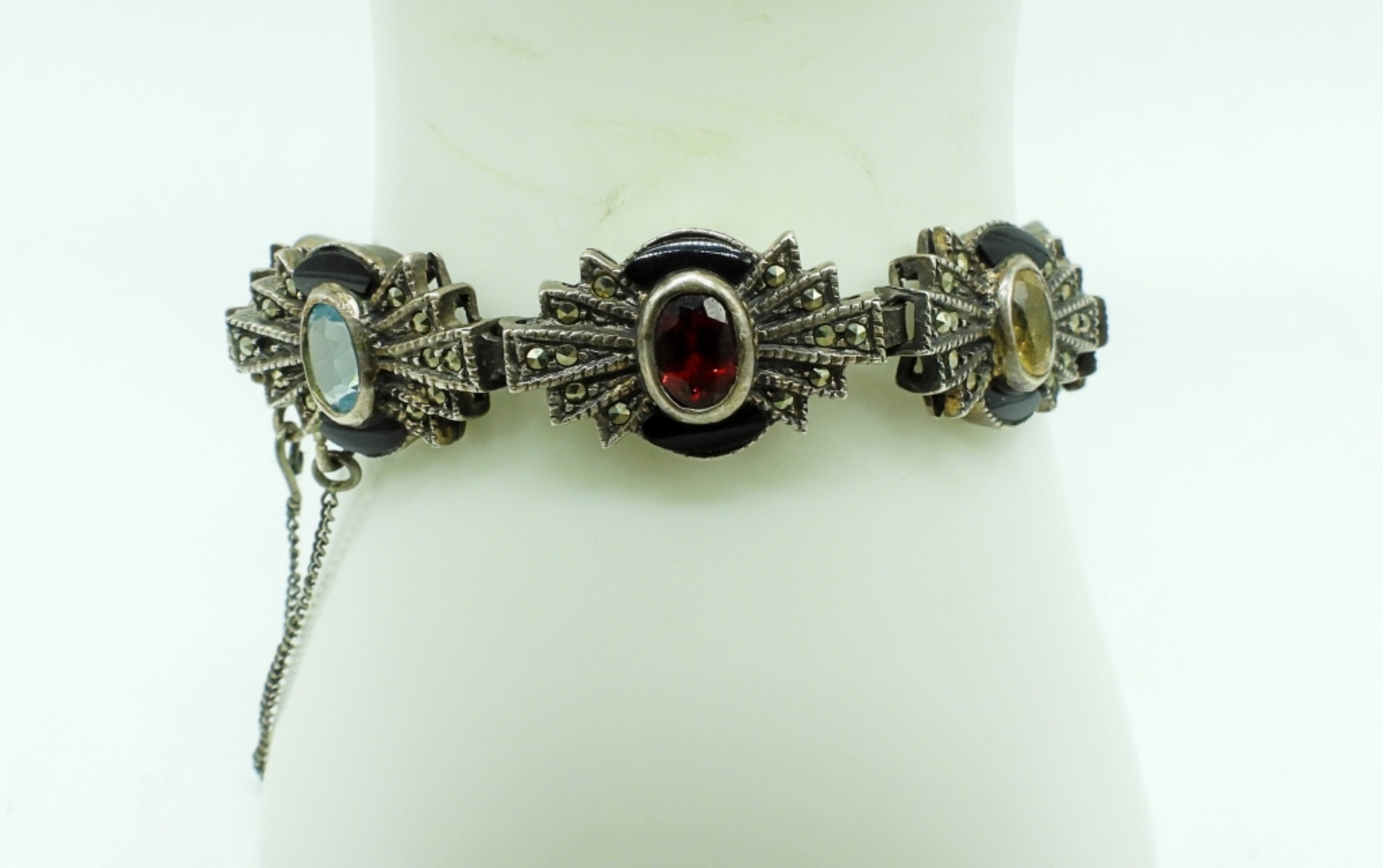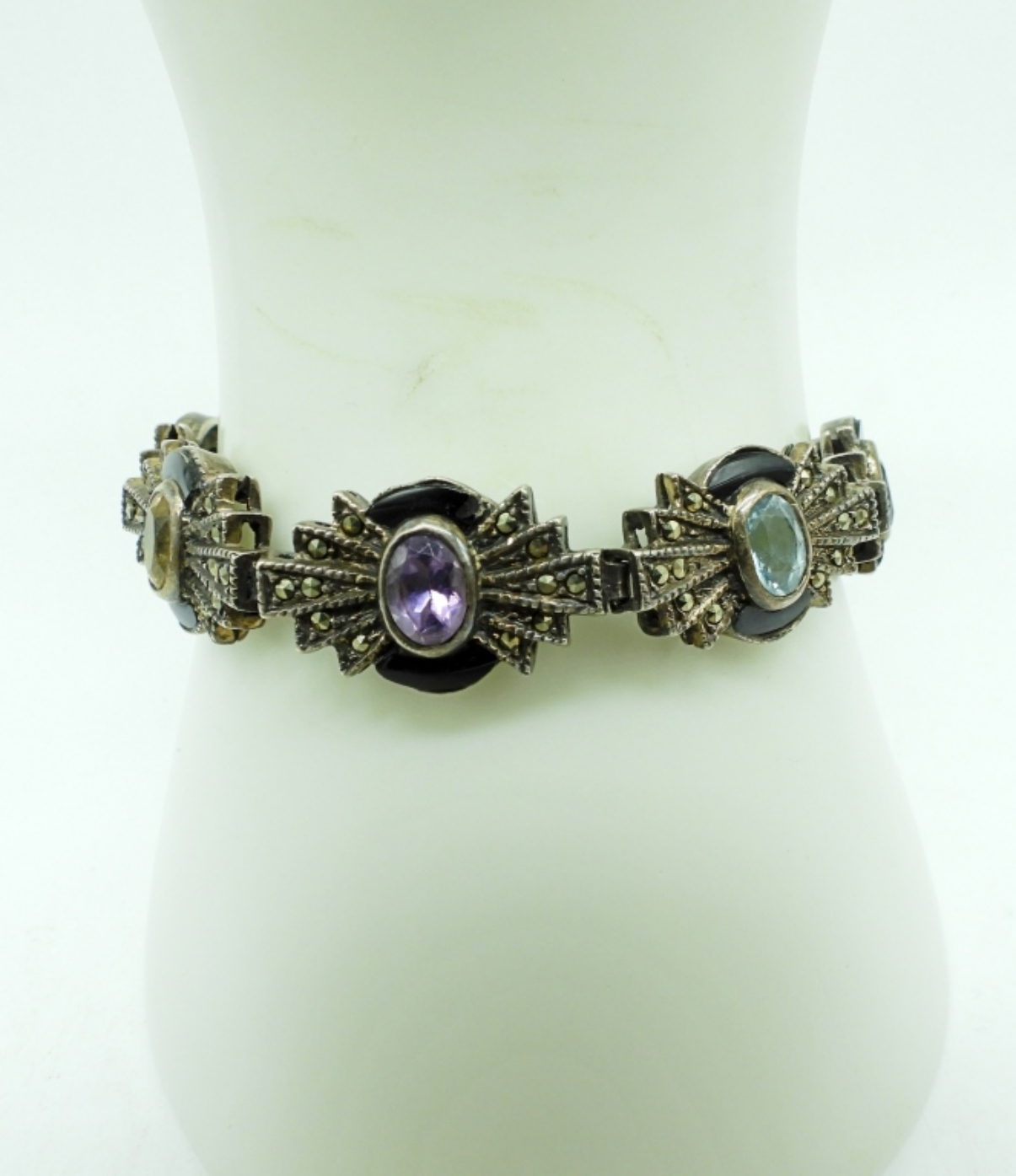 Vintage sterling bracelet with marcasite, black onyx, garnet, blue topaz & amethyst gemstones. 7″. (18 dwt)