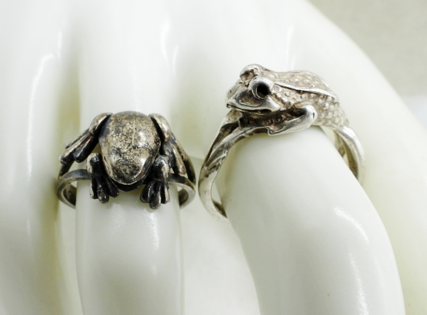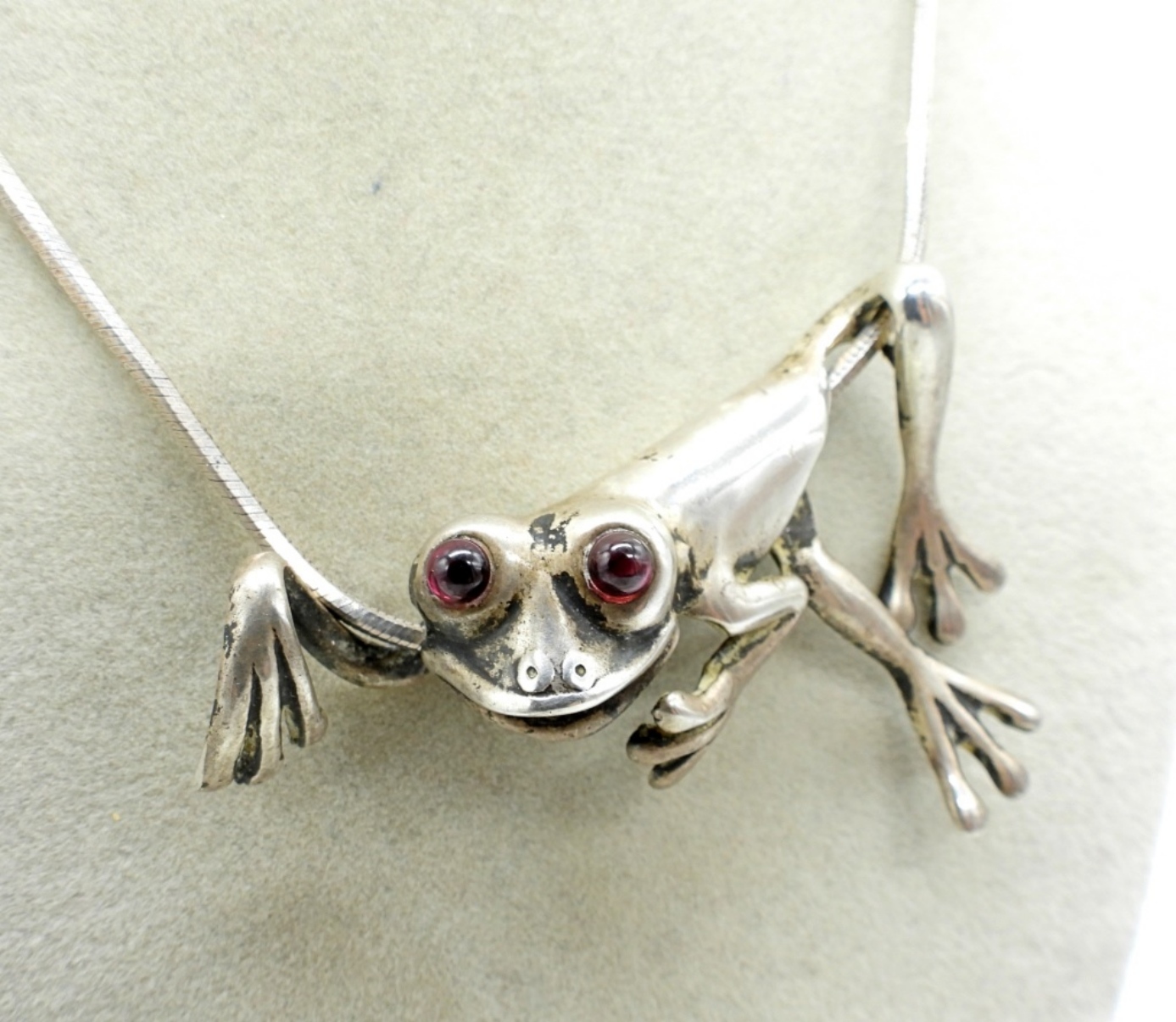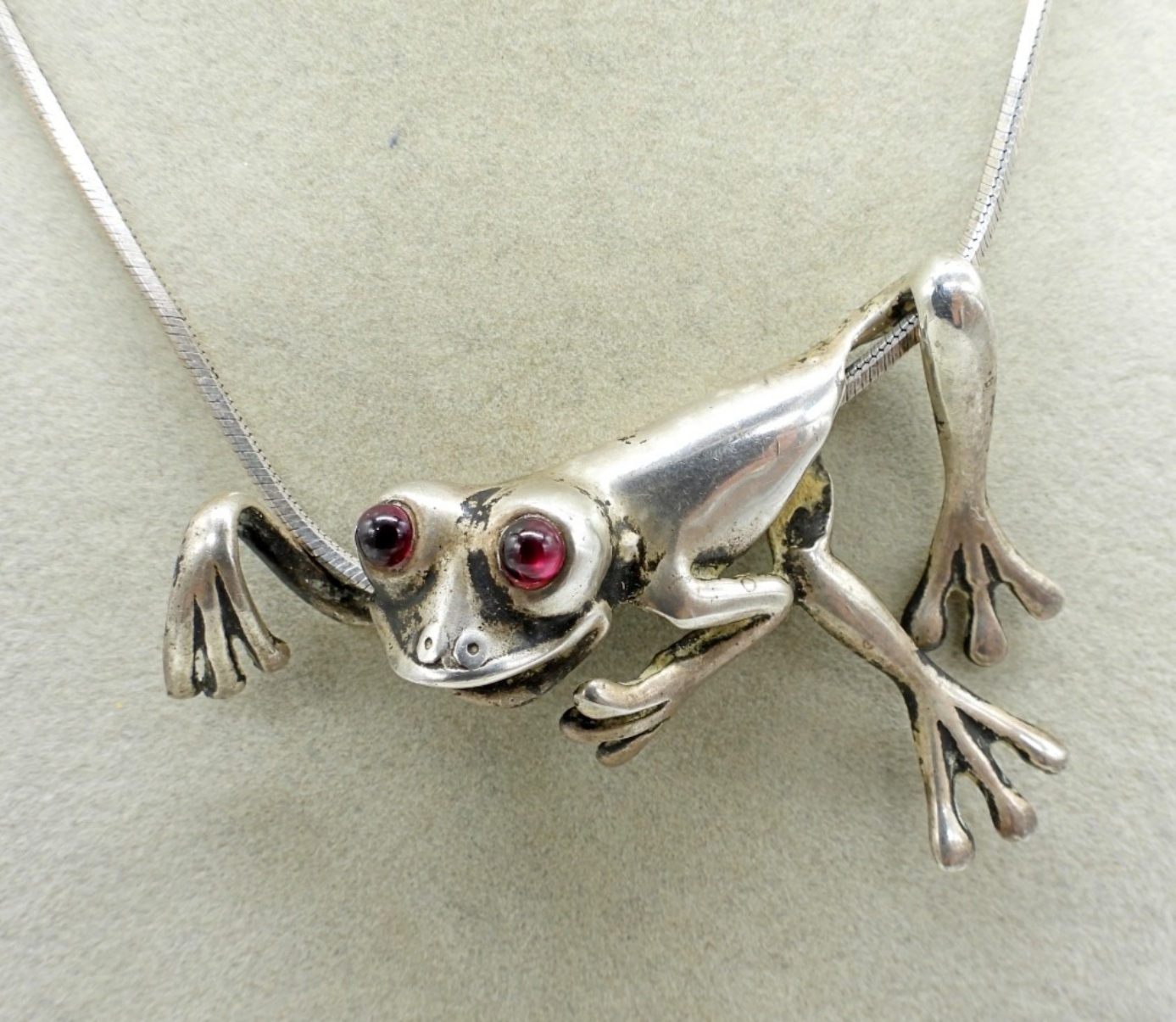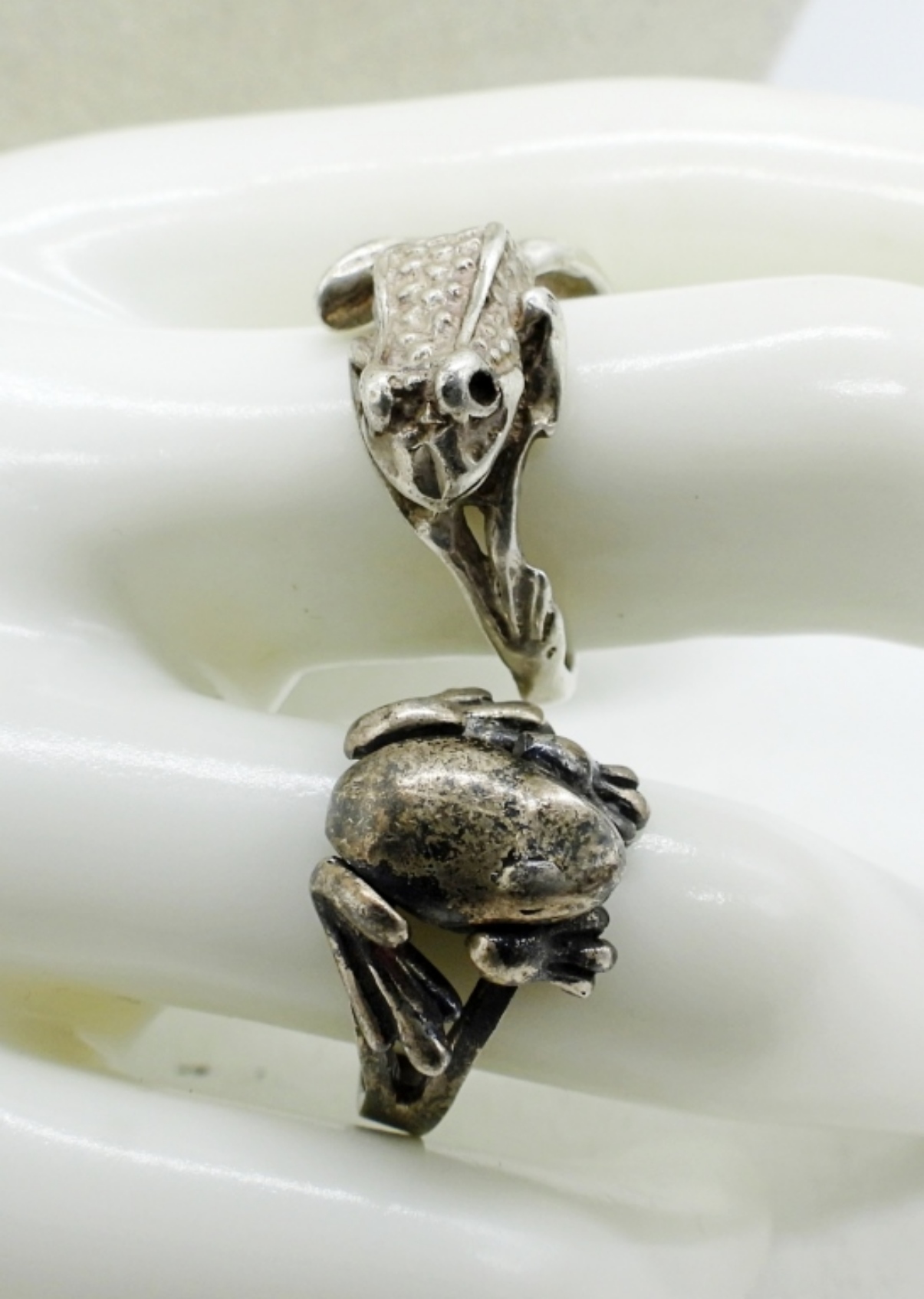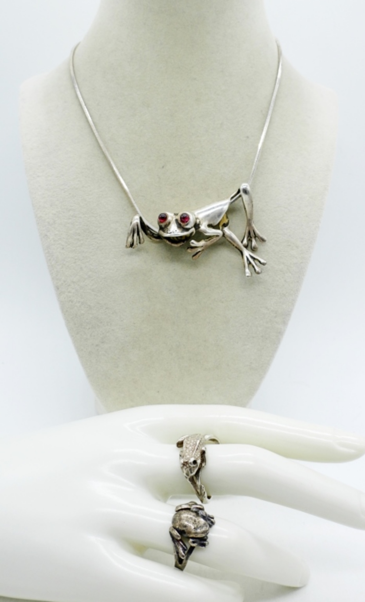 Vintage sterling frog pendant, 2.5″ wide / 1.5″ long. 16″ sterling chain. Ruby colored eyes. 2 Frog rings size 6.5 & 9. (19.9 dwt)