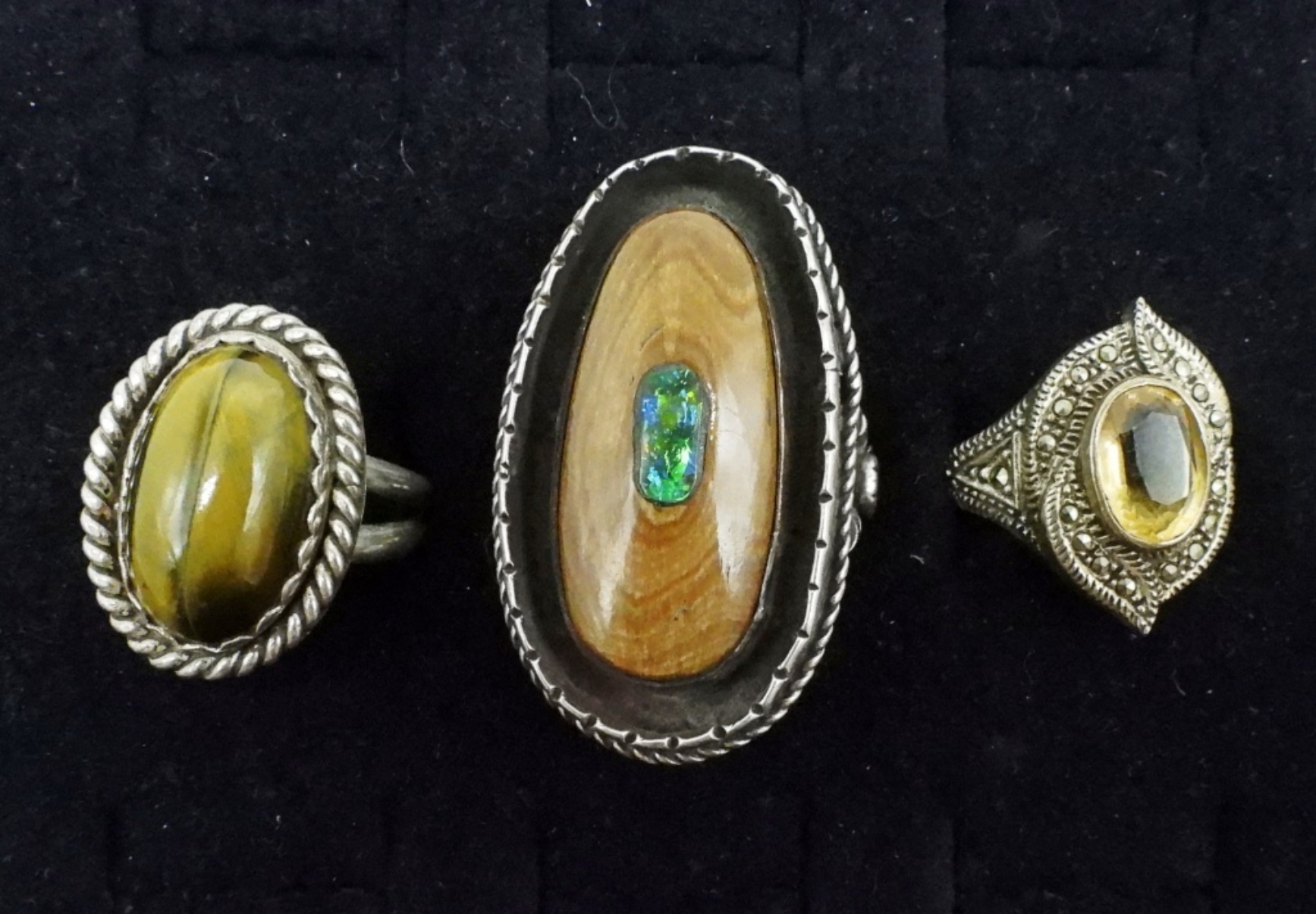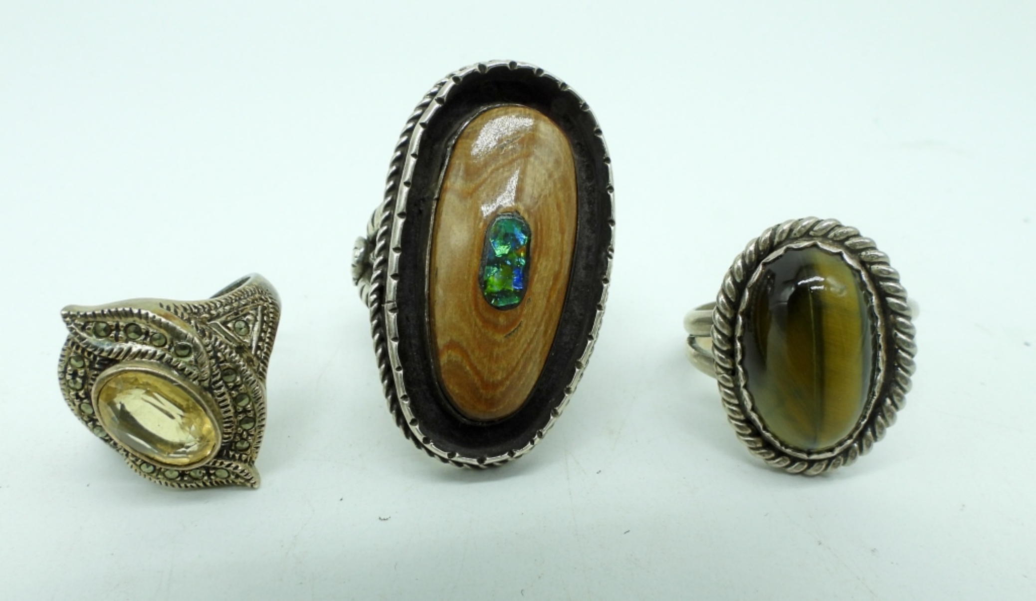 Three sterling rings. Citrine, Tigers Eye & Opal set in what may be petrified wood. Sizes 9 & 10. (23.2 dwt)