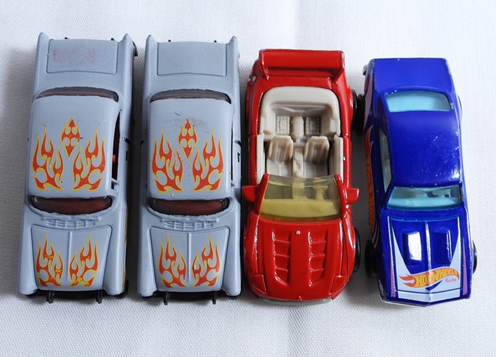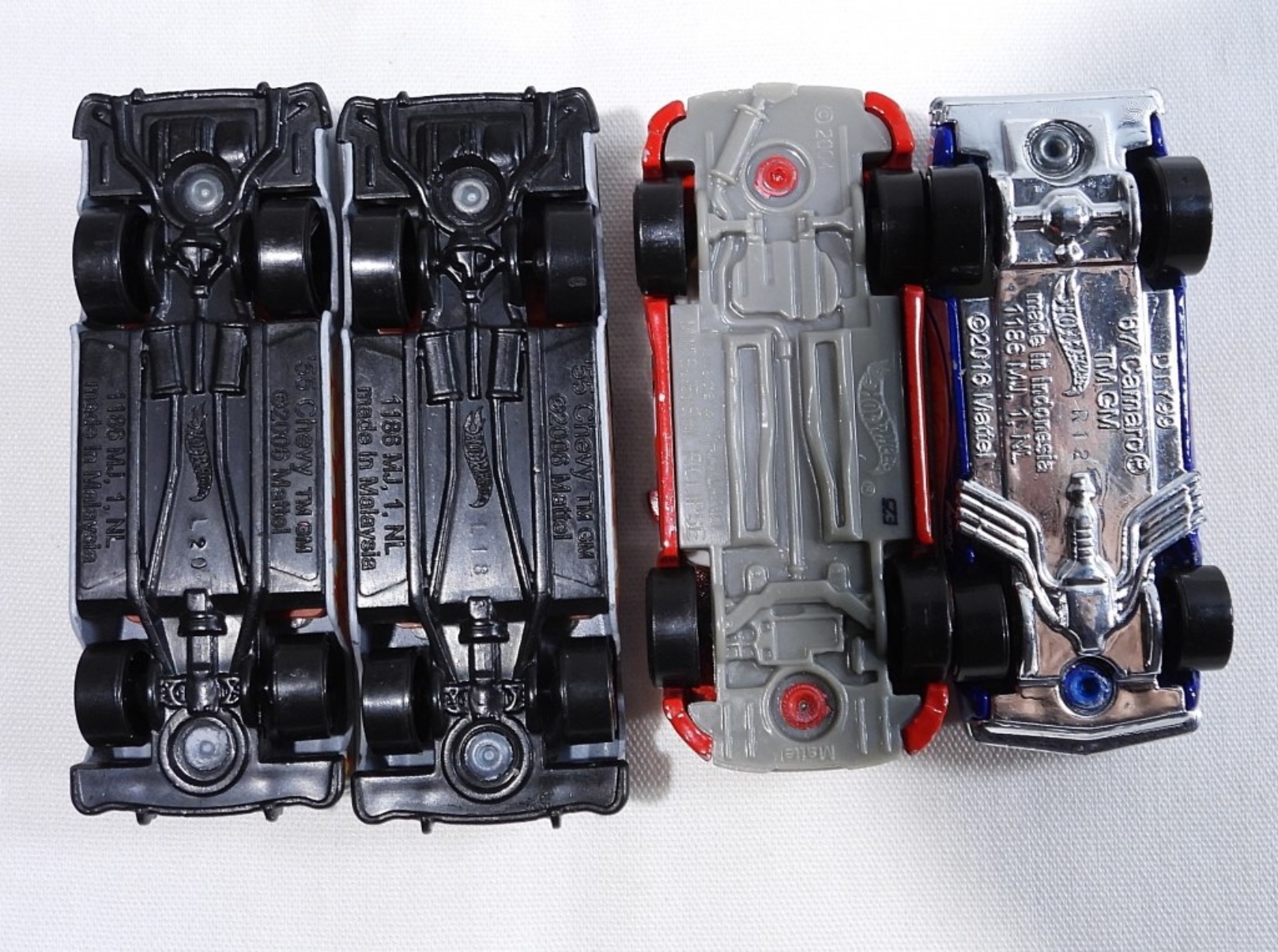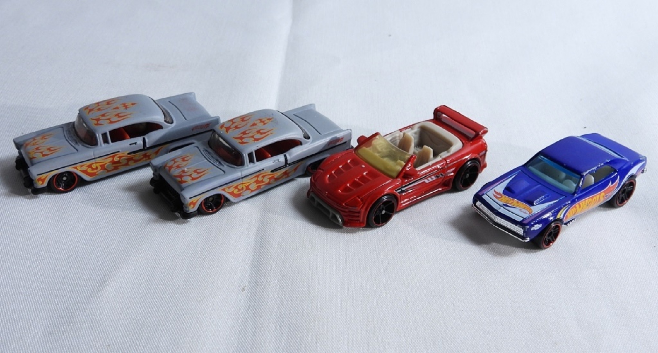 4 modern Mattel Hot Wheels Redline Cars. 2-2006, ’55 Chevy (with flame paint job). 1-2004, Mitsubishi Eclipse. 1-2016, ’67 Camaro.