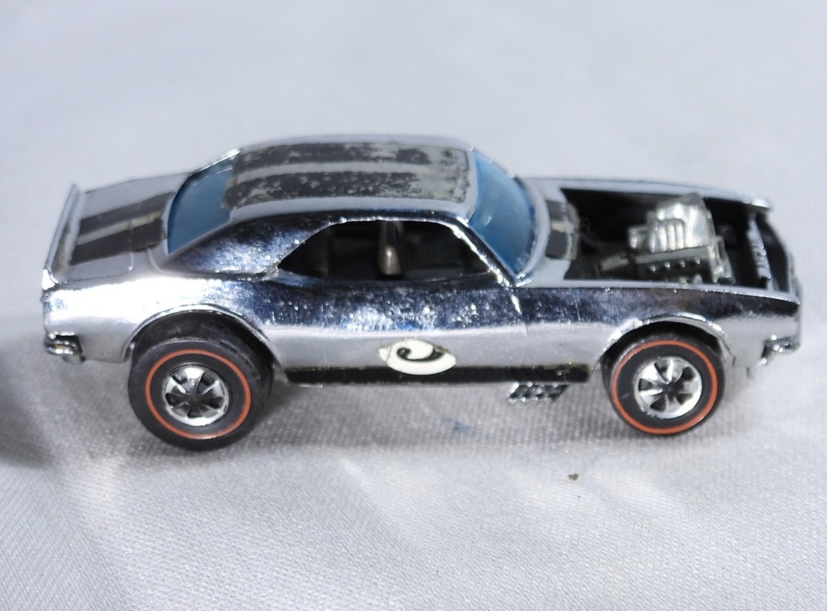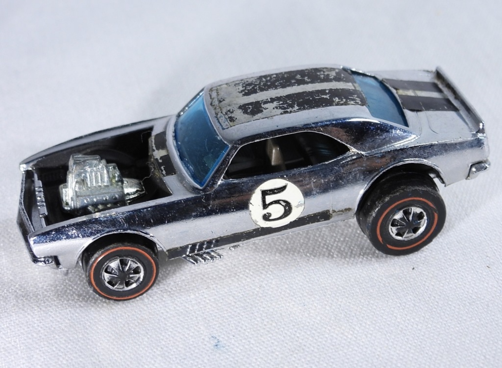 1969 Mattel Hot Wheels, Red Line. Heavy Chevy Camaro, chrome with brown interior. #5 onside. Paint is fading/chipping.