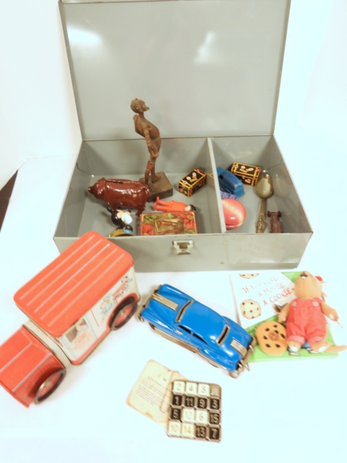 A mixer of items in a Gilbert Microscope and Labe Set Container. Does show some wear, in fair condition, preowned.