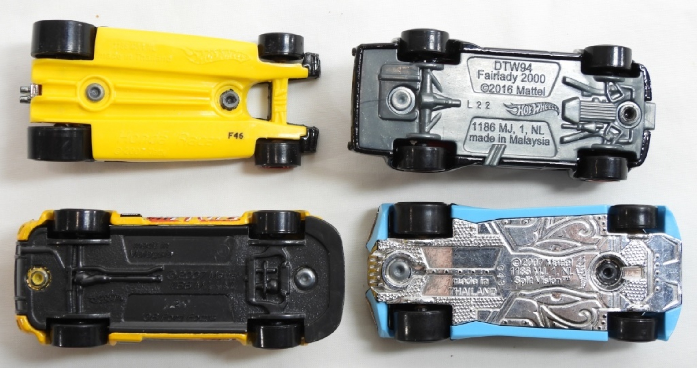 (4) Variety Hotwheels racing cars- 2007 Honda Racer, 2008 Ford Focus, 2007 Split Vision, DTW94 Fairlady 2000, none of the cars come in or with original box, or packaging. In fair to good condition, preowned.