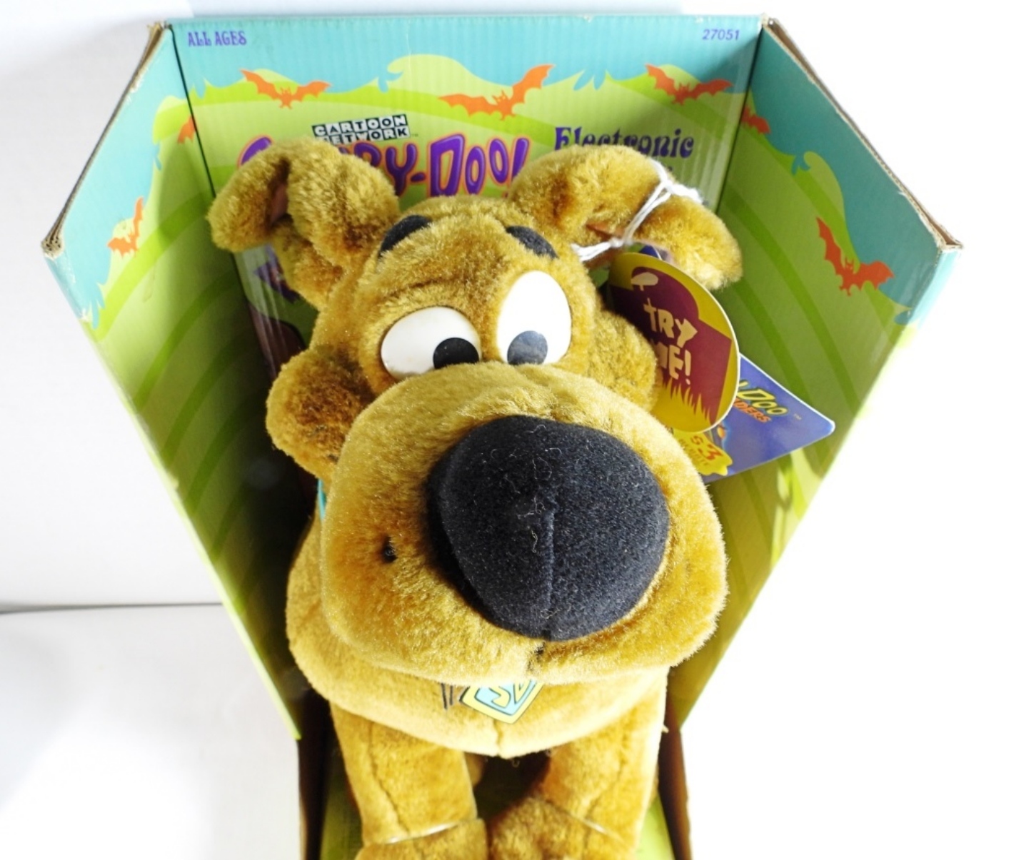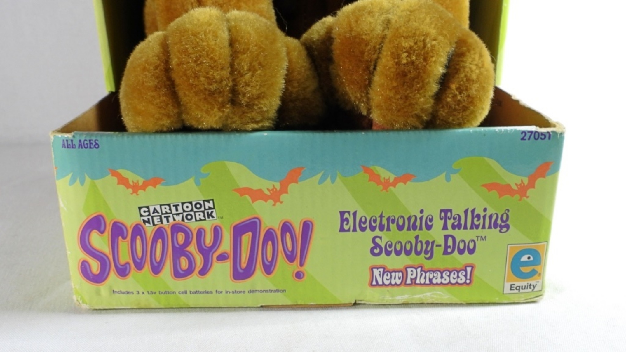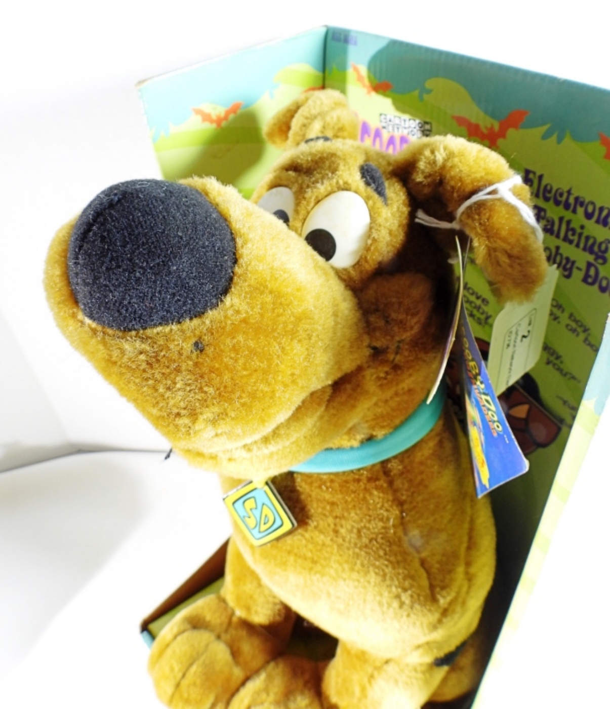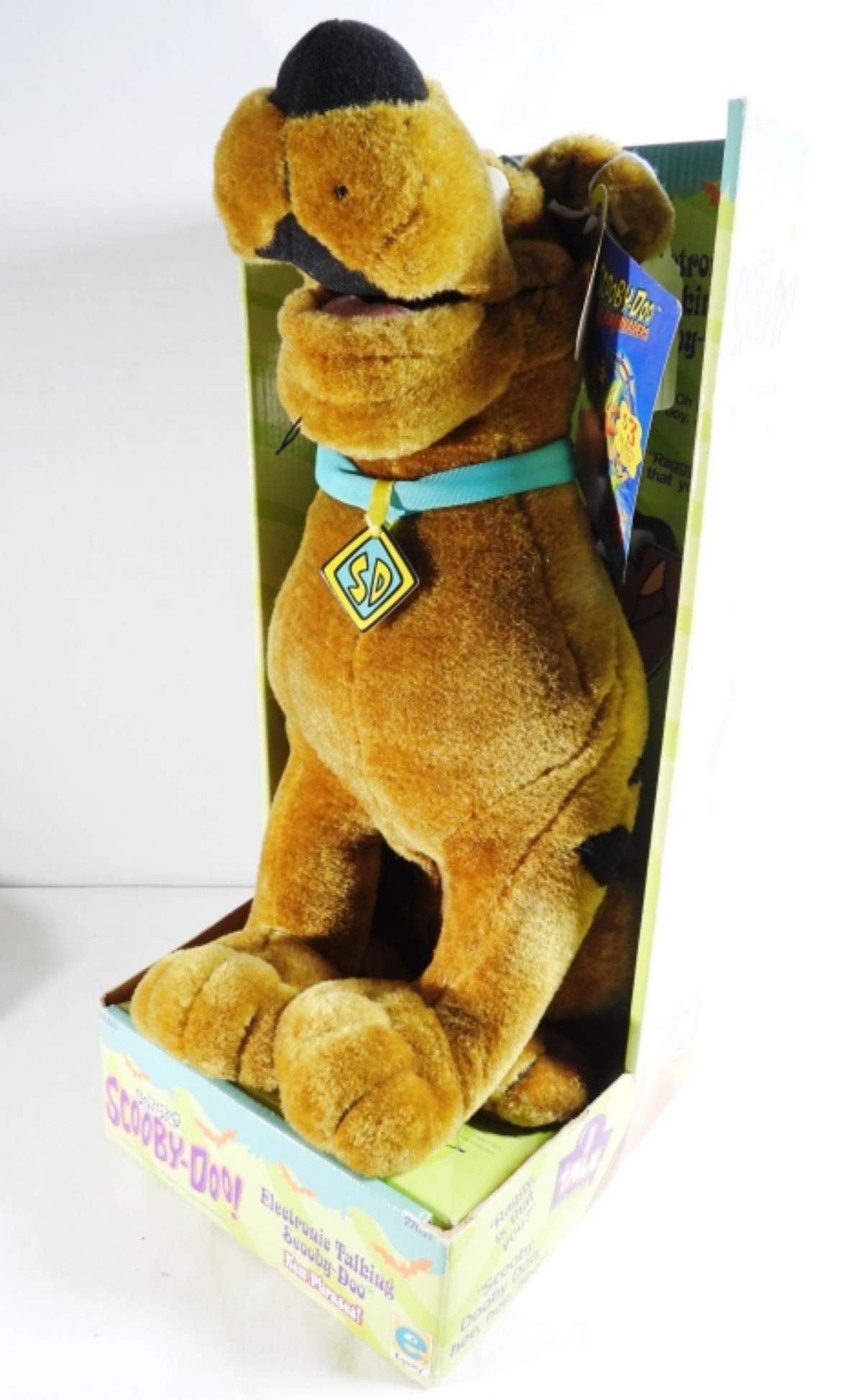 Still in the box and tags, it was tested with new batteries and does work. Looks in great condition, made in 2000 by Equity, and also comes with a Scooby-Doo Tradition baseball hat with tags