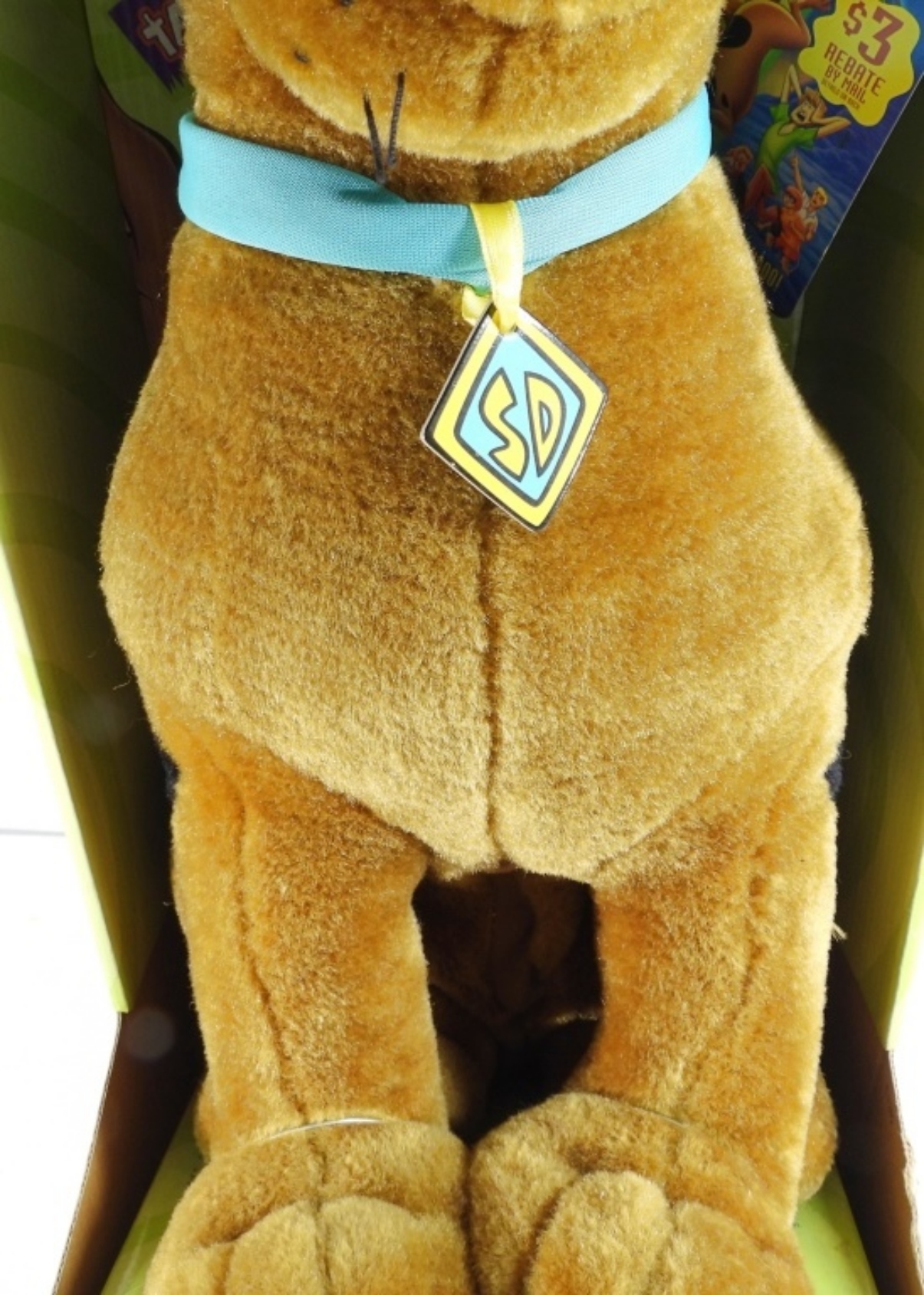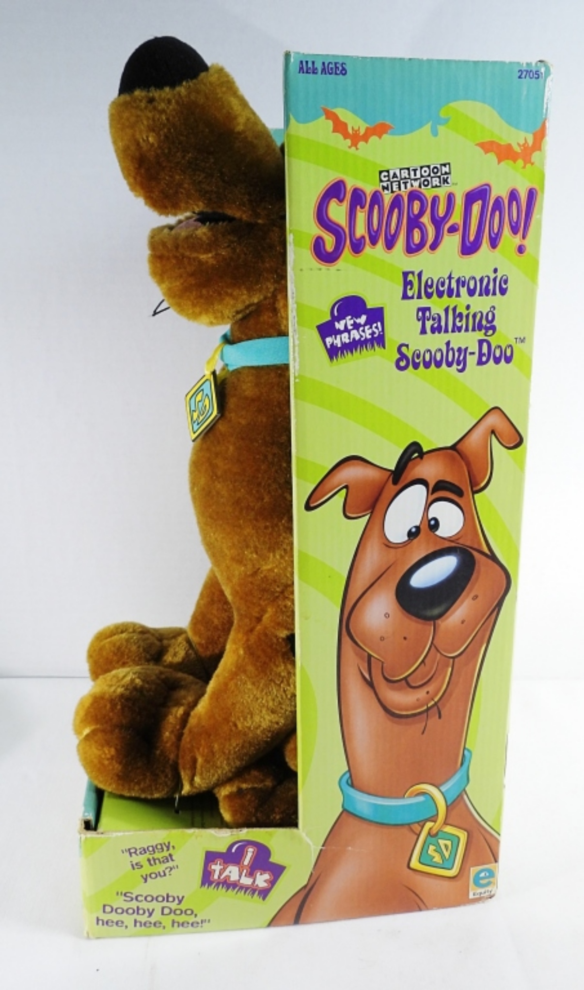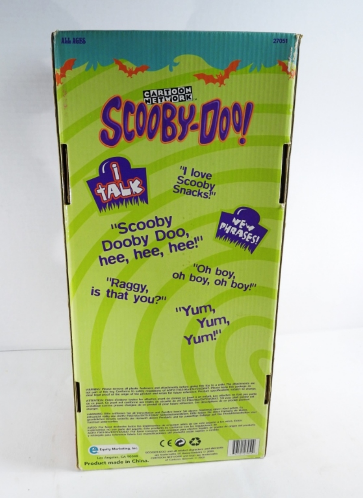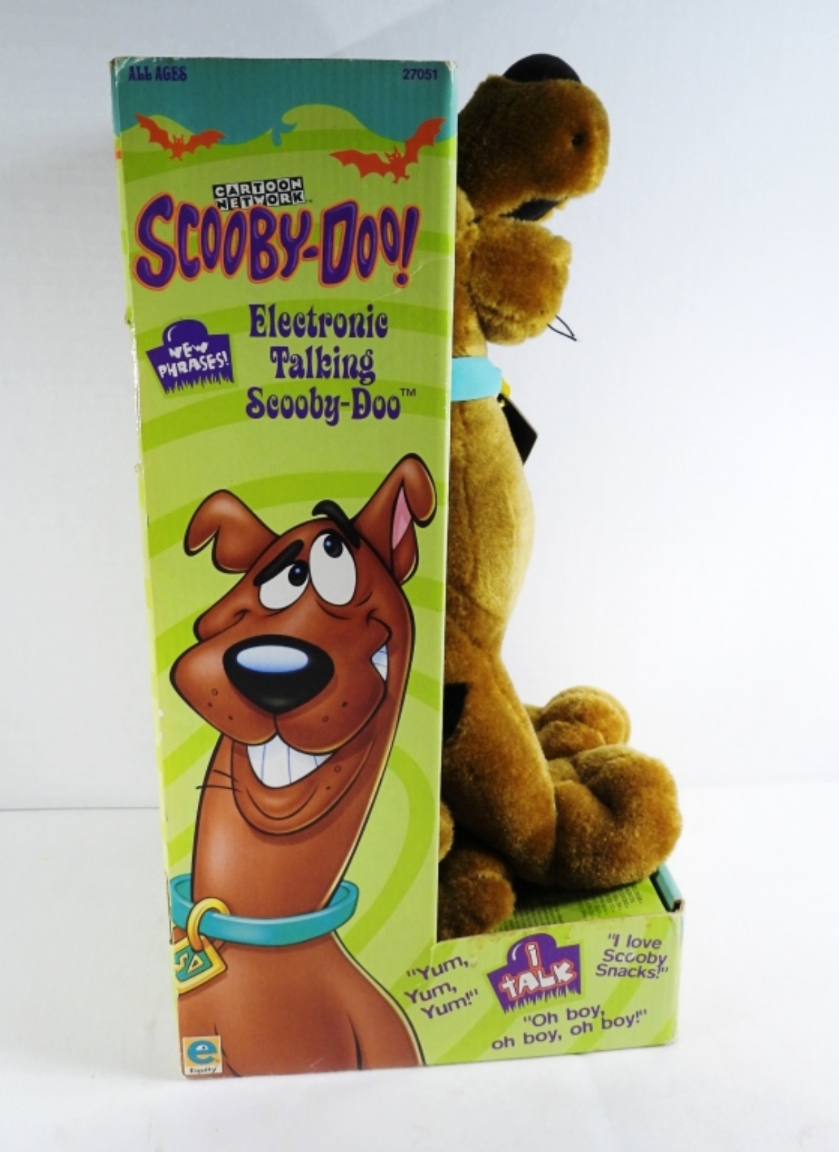 Still in the box and tags, it was tested with new batteries and does work. Looks in great condition, made in 2000 by Equity, and also comes with a Scooby-Doo Tradition baseball hat with tags