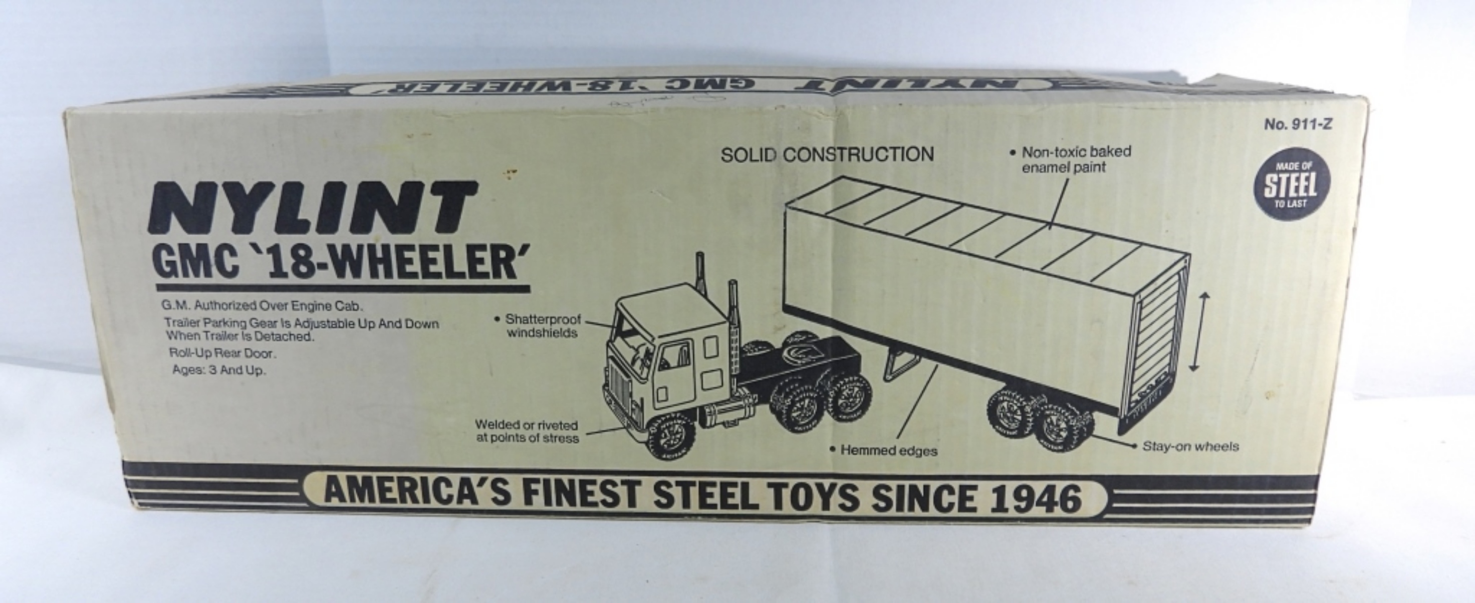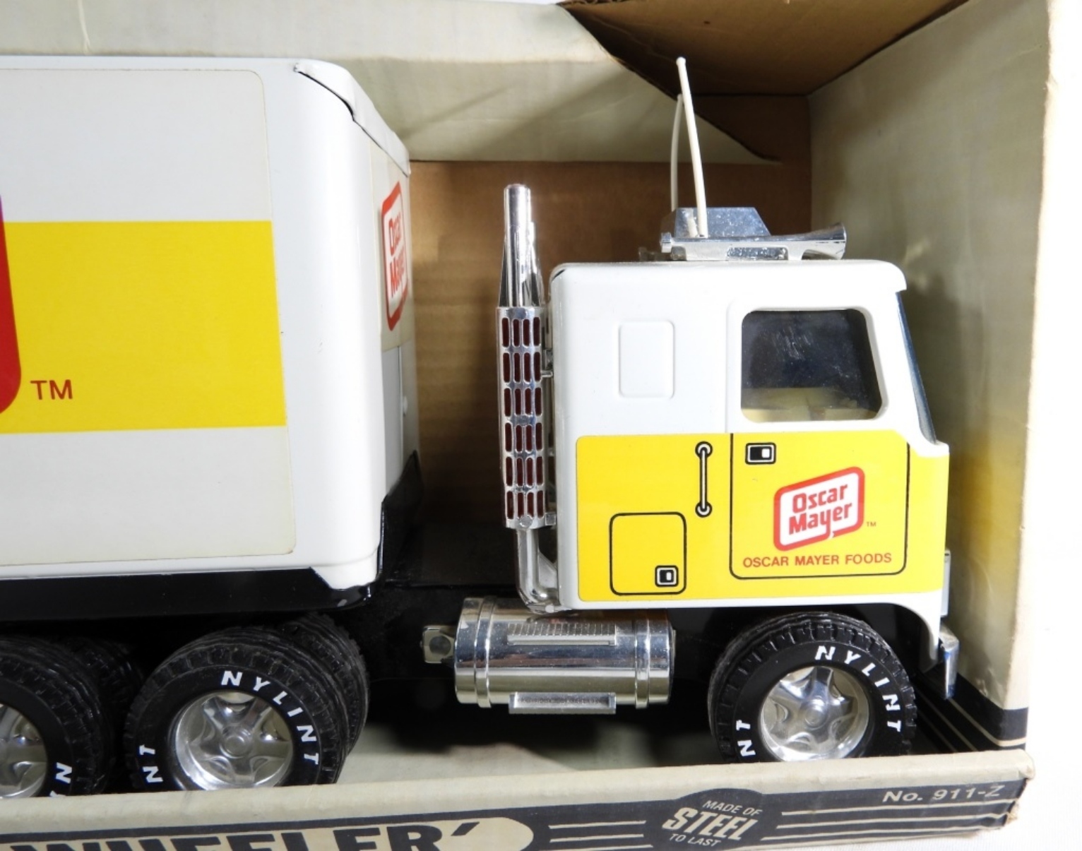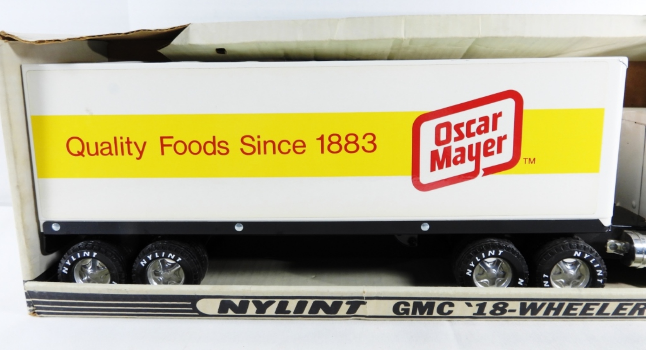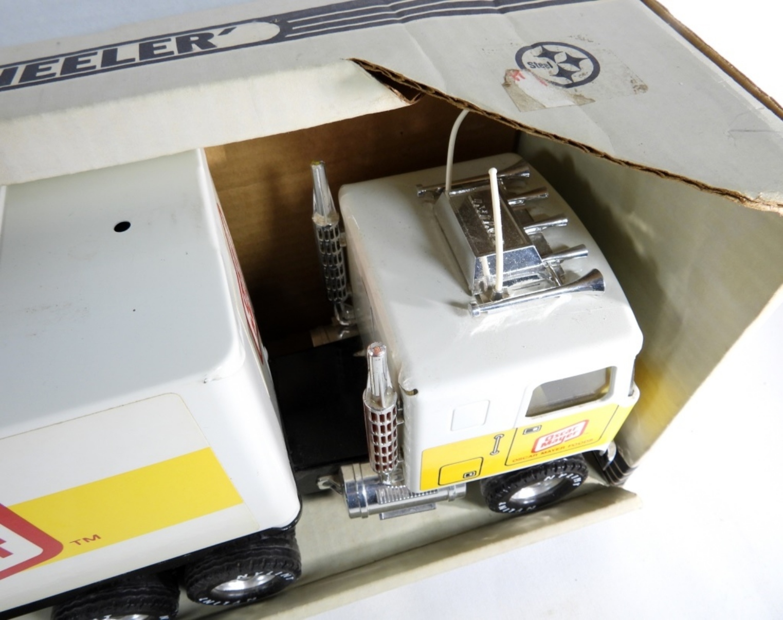 Still in the box, the box is ripped in some spots. The truck looks to be in good condition.