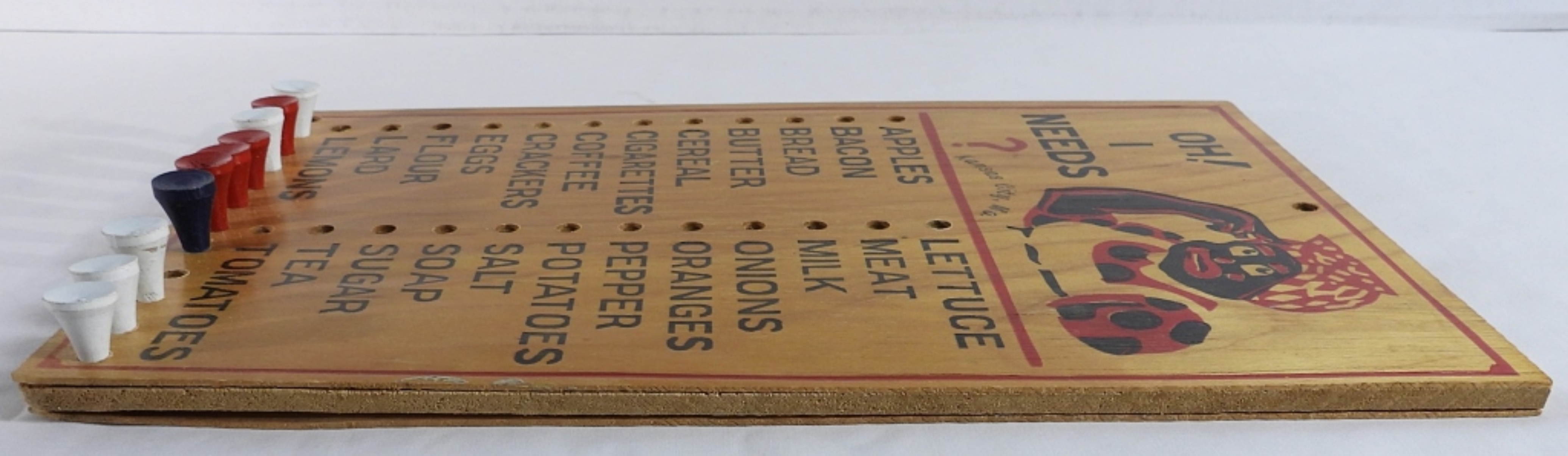 Black Americana, wooden peg board grocery list. Circa 1930’S/1940’s. Missing two pegs. 10″ x 6″.