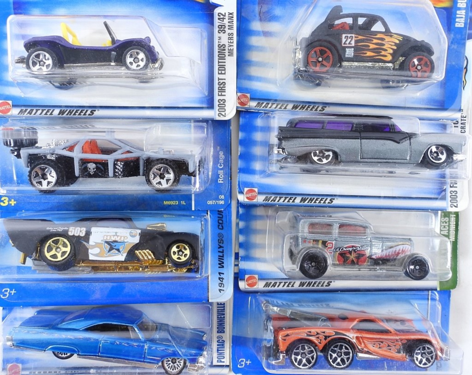 Eight Hot Wheels, new in box. Mixed years 2002-2007. Baja Bug, Tow Jam, Meyers Manx, Willys Coupe, Roll Cage, 8 Crate, Midnight Otto, Bonneville.