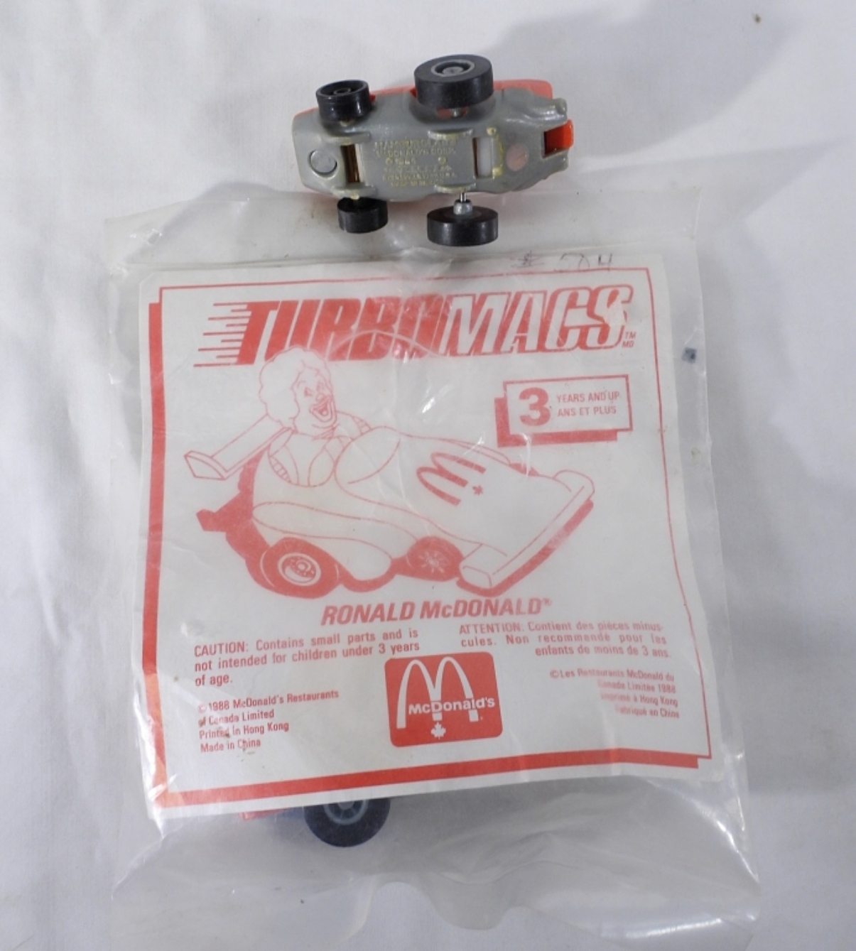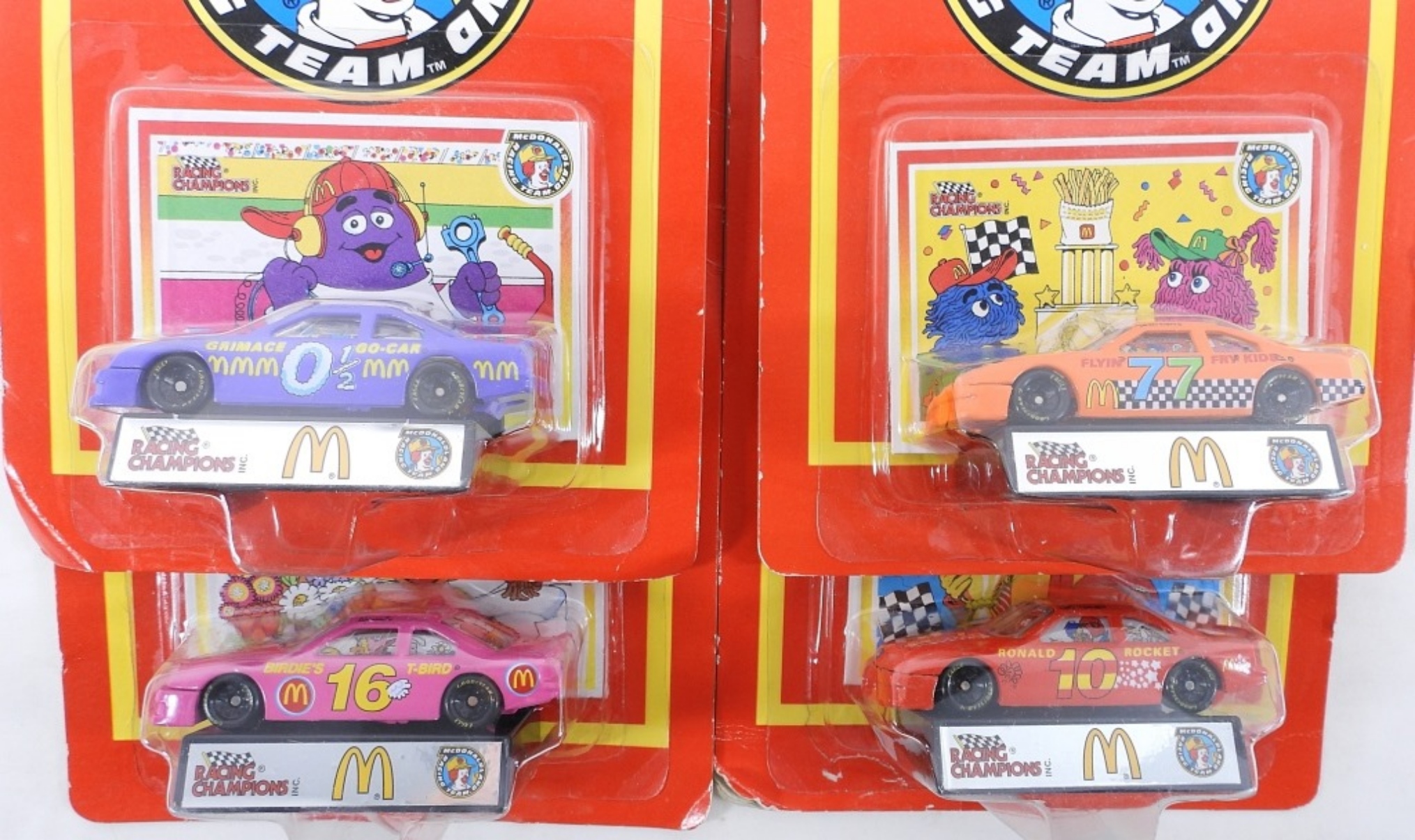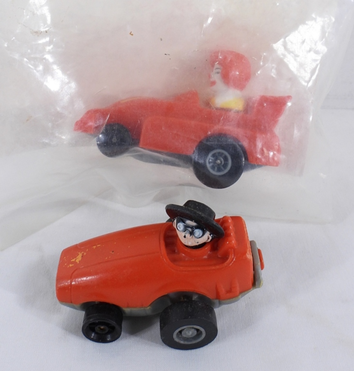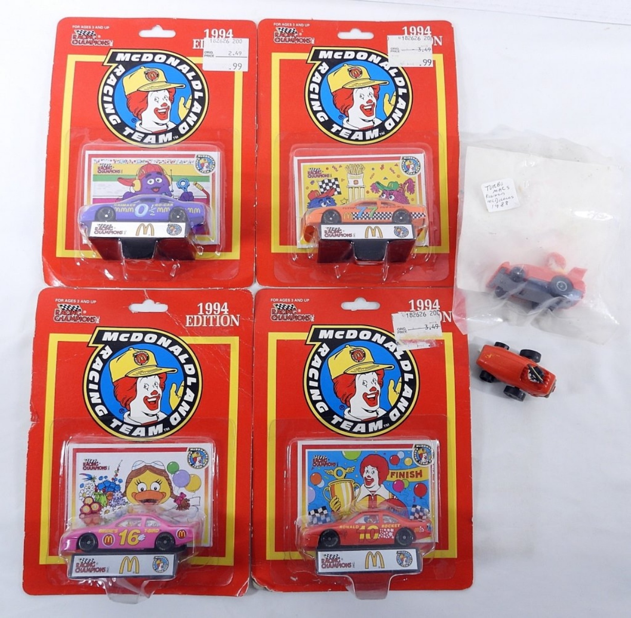 Four McDonald Land Racing Team Cars, New In Boxes. Ronald McDonald Turbo Macs 1988 Toy in Original Package. 1984 Hamburgler Car, pain is chipped off.