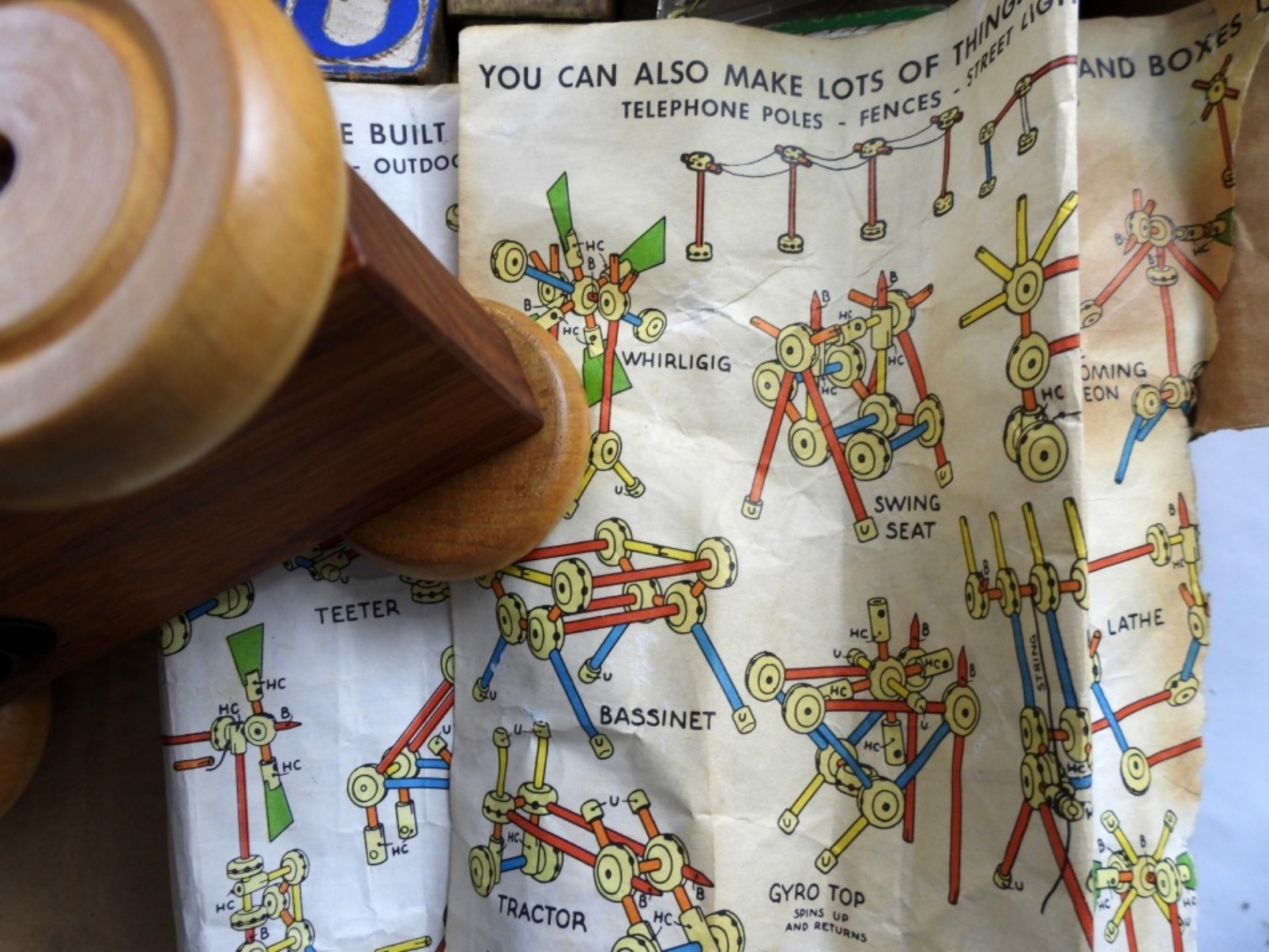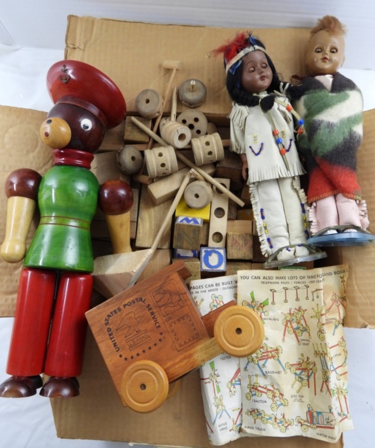 Wood Toy Lot- Italian wooden sailor- in good condition. 2 11″ Indian dolls. 1989- United States Postal Service musical bank (the music still works). A box of wooden blocks. All are in fair condition, preowned.