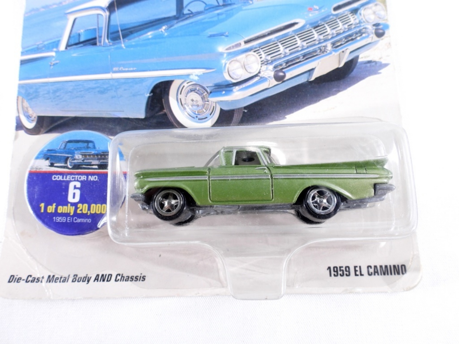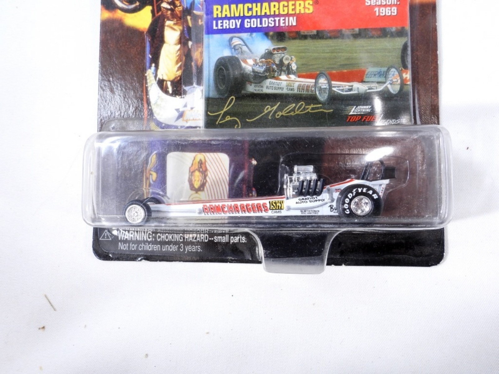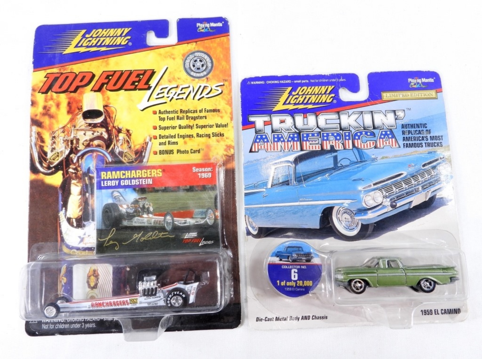 2 Johnny Lightning Cars. First car is A 1998 Top Fuel Legends Ram chargers Leroy Goldstien Car(in box). Second is a Limited Truckin’ America Die Cast Body and Chassis 1959 El Camino ( in box), preowned.