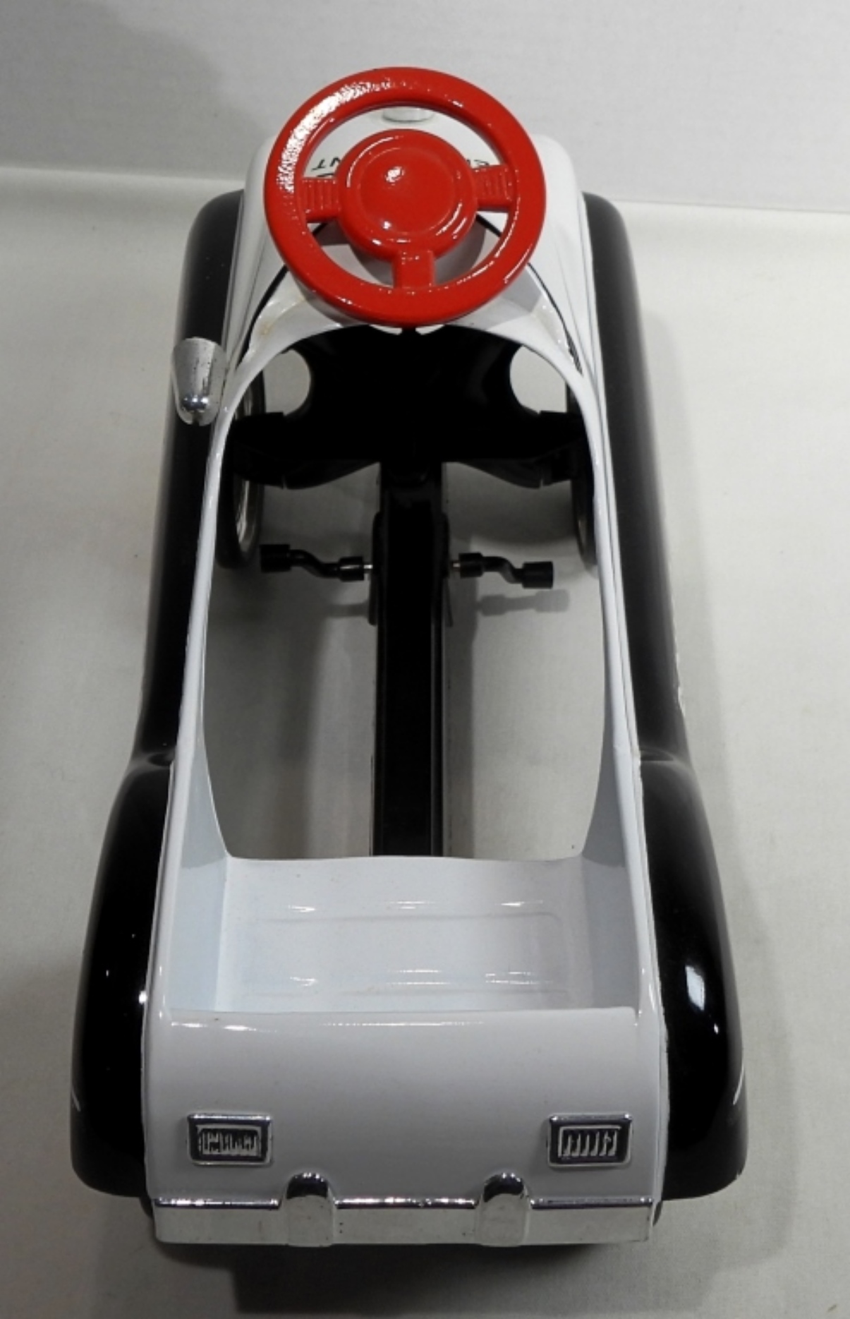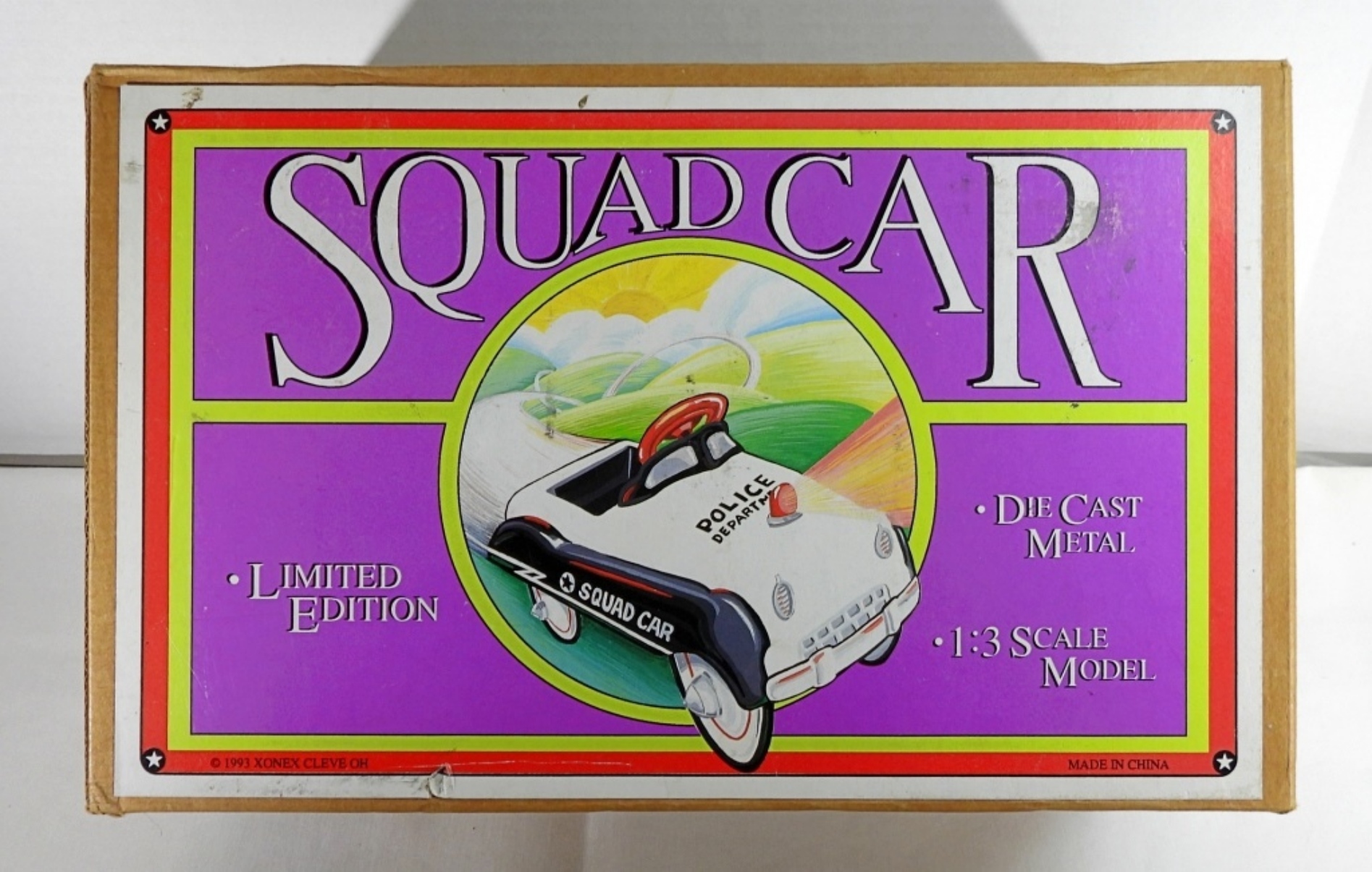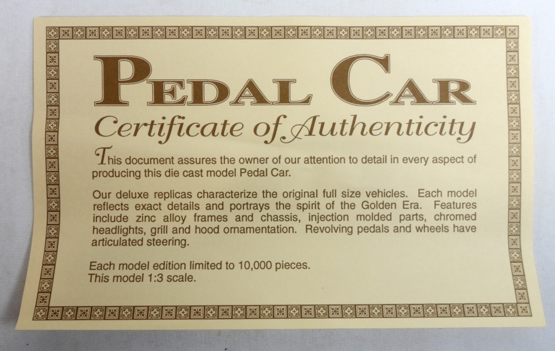 1993 die cast metal, 1:3 scale model, good condition, paint coming off of three wheels, some small scuffs to the car, steering wheel works well, pedals turn with ease, missing red light on top of the hood, certificate of